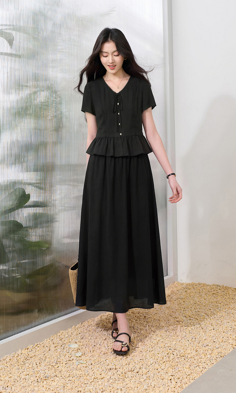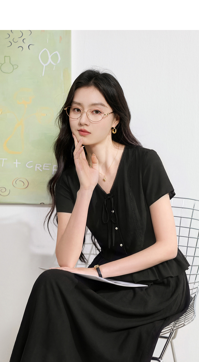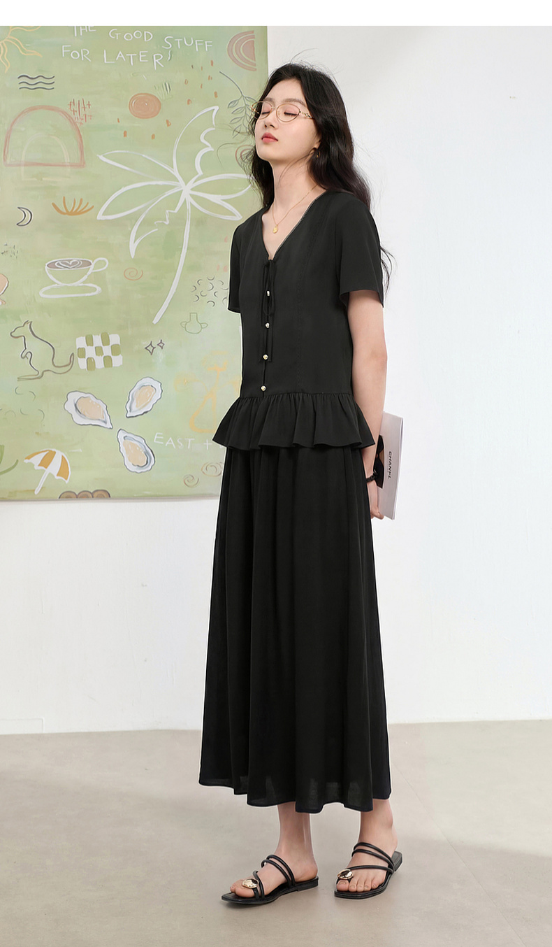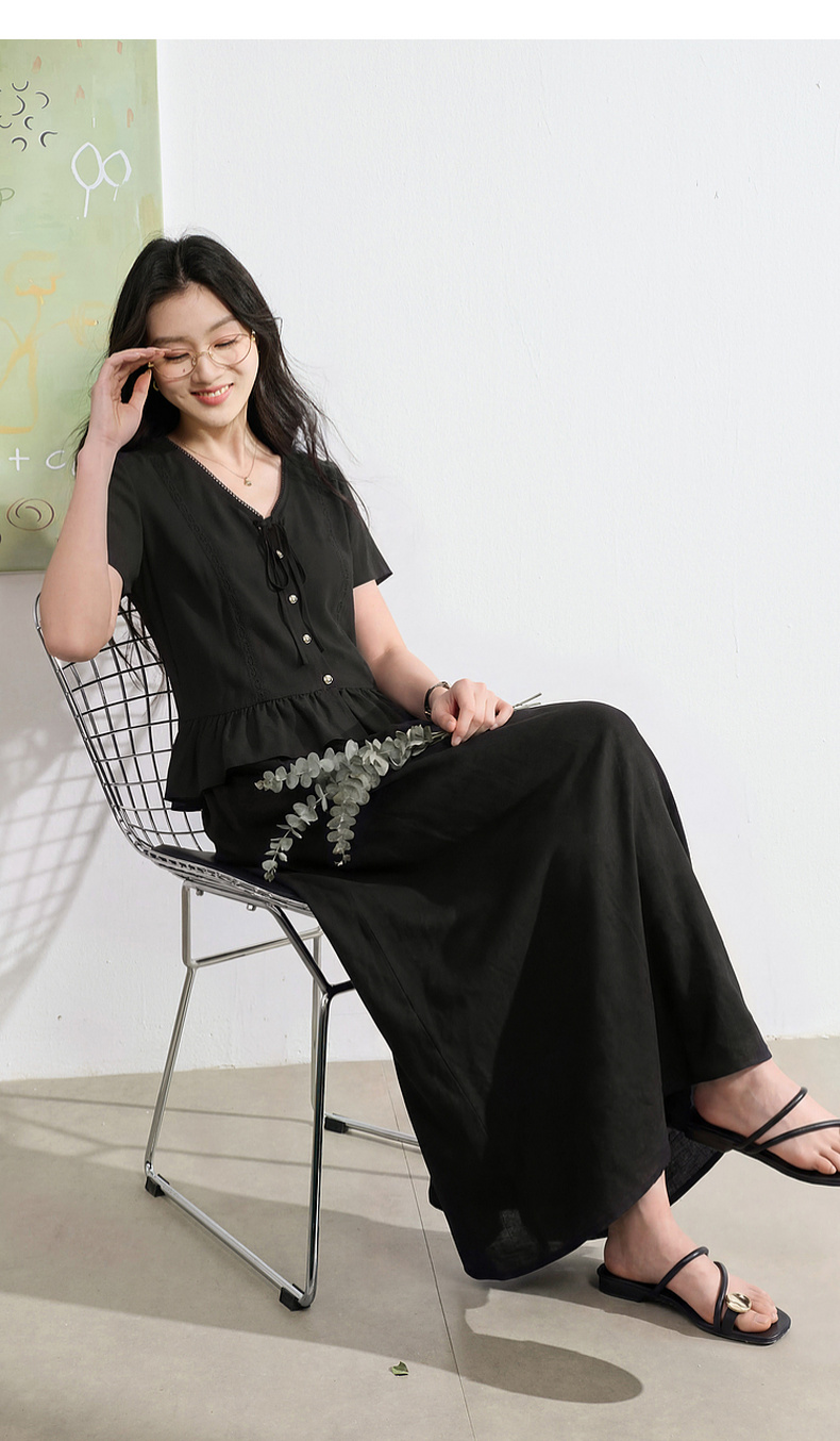 【醋酸】三彩2026夏季新款套装V领衬衫上衣半身裙A字长裙两件套S