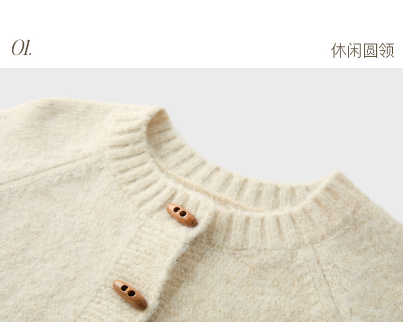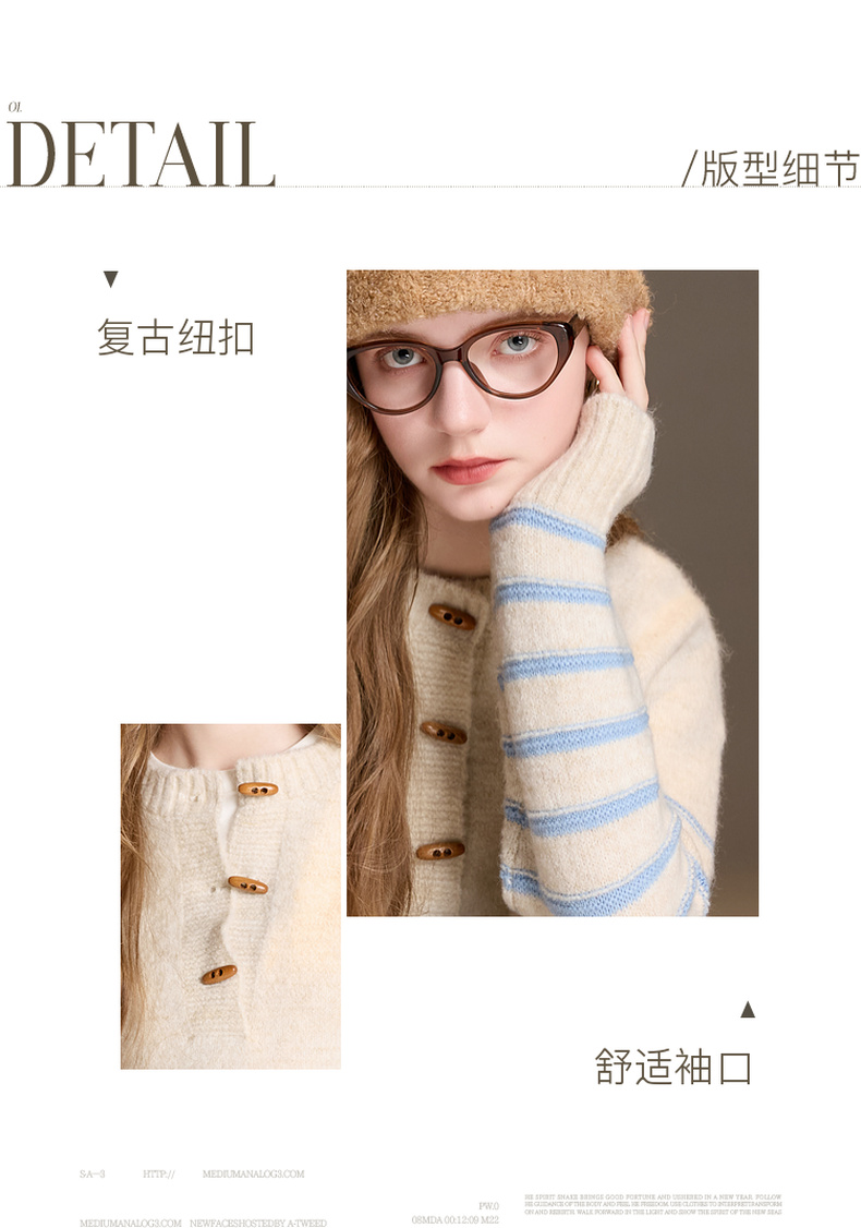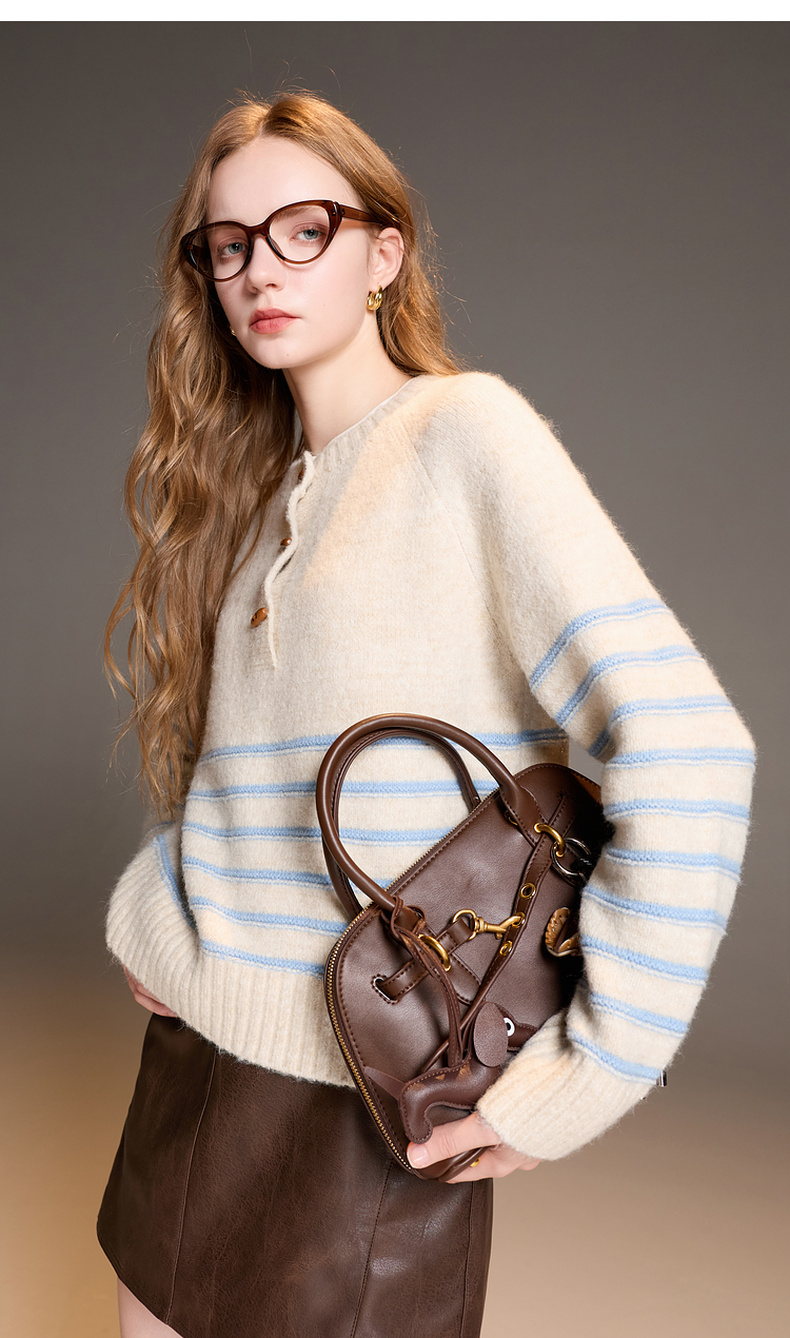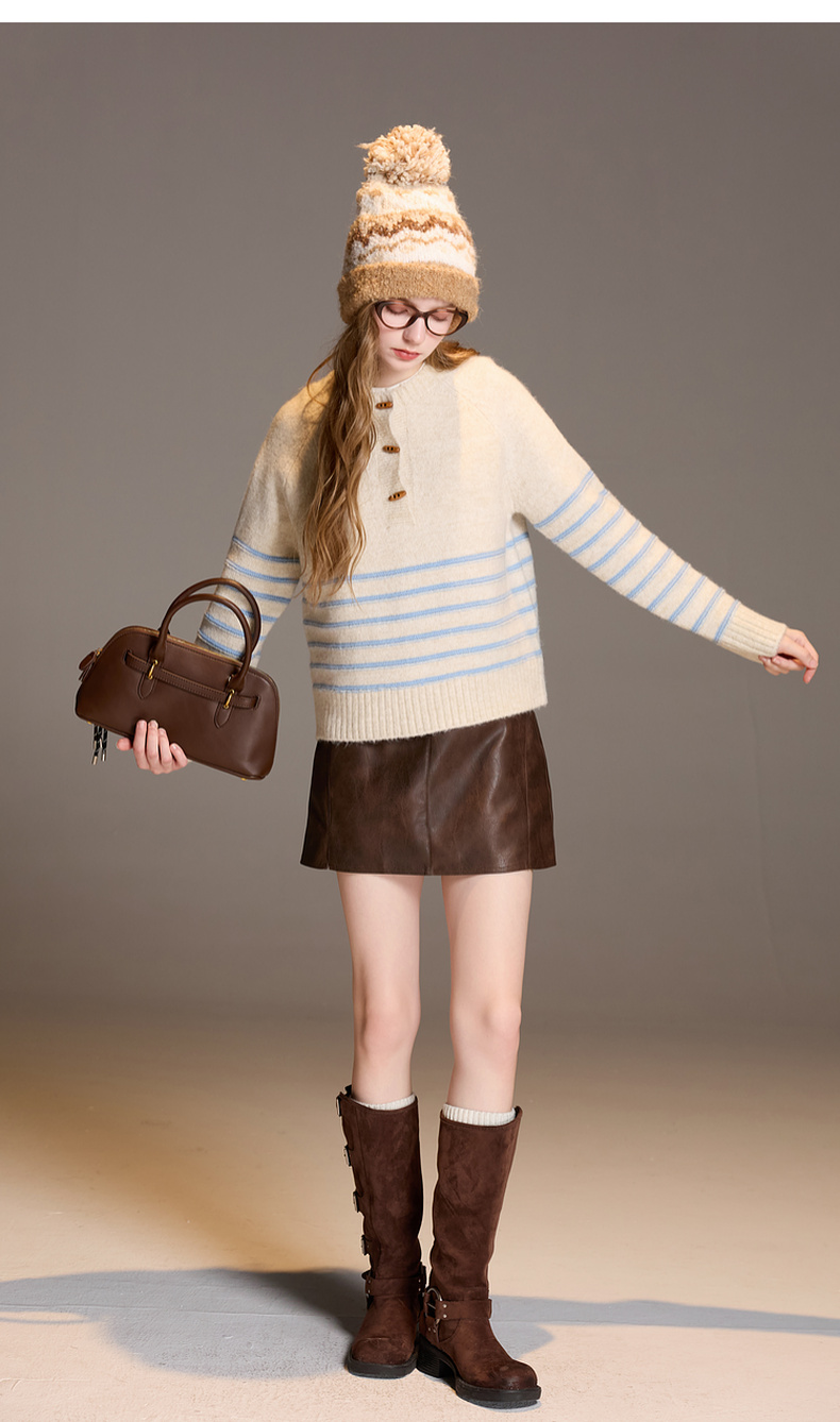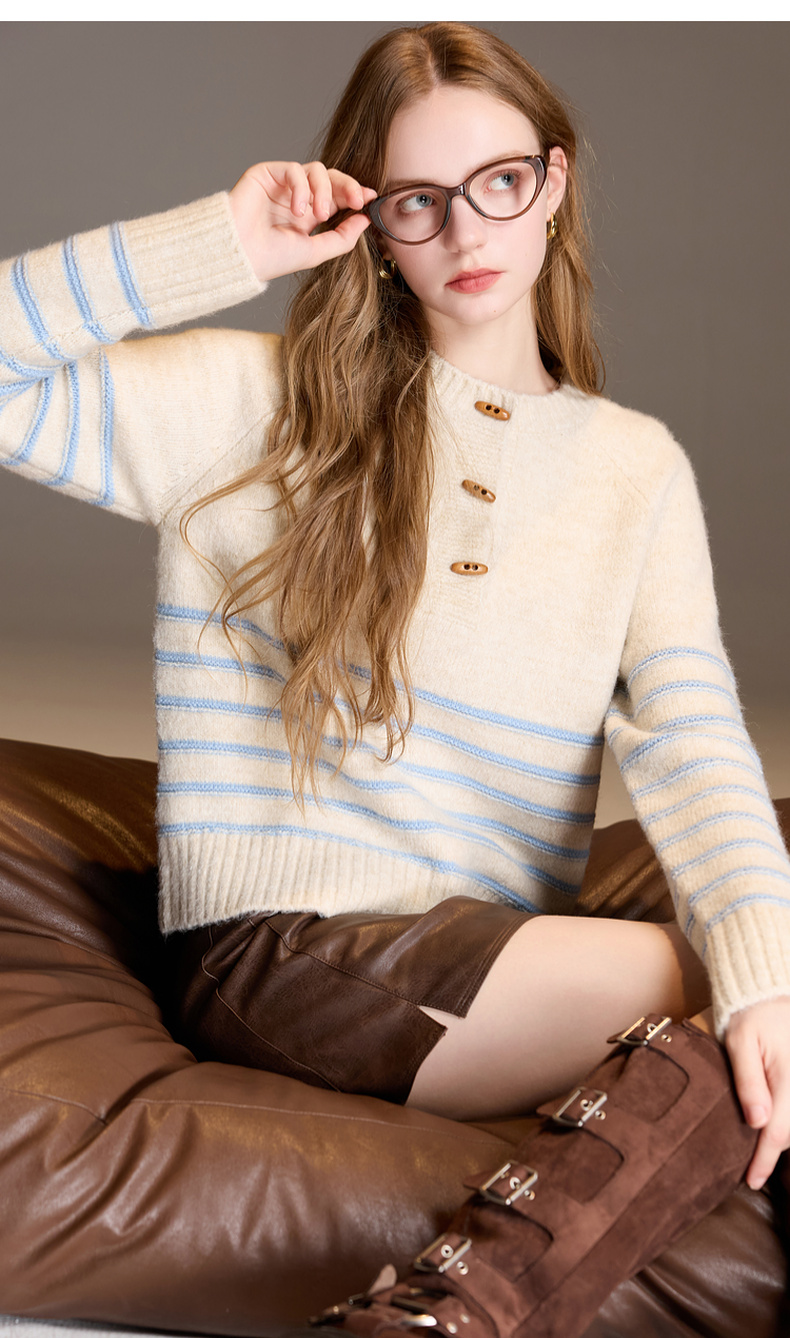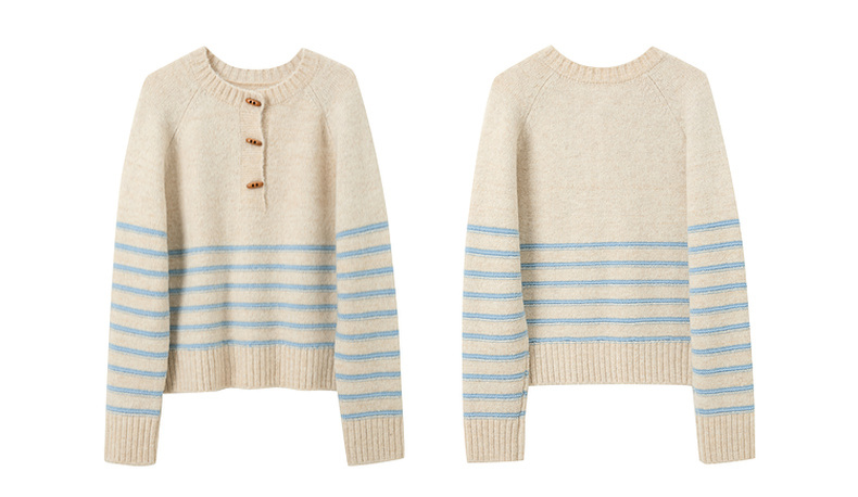 三彩2025冬季新款圆领条纹针织衫宽松长袖简约套头衫上衣M
