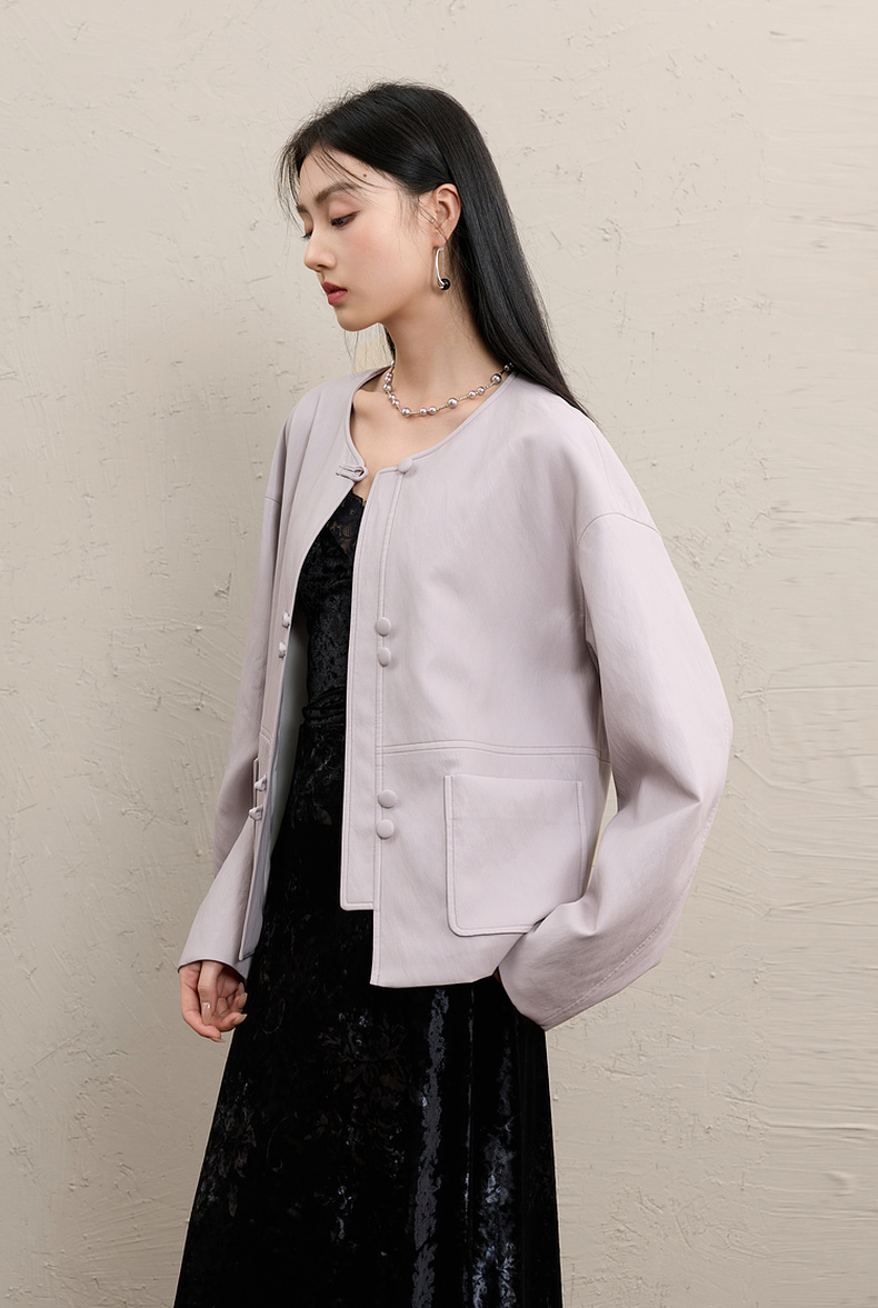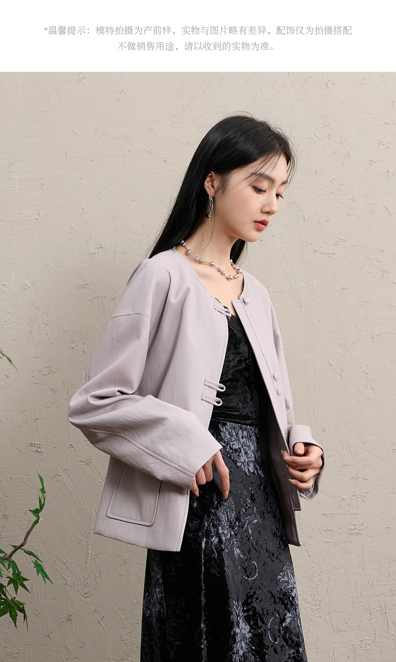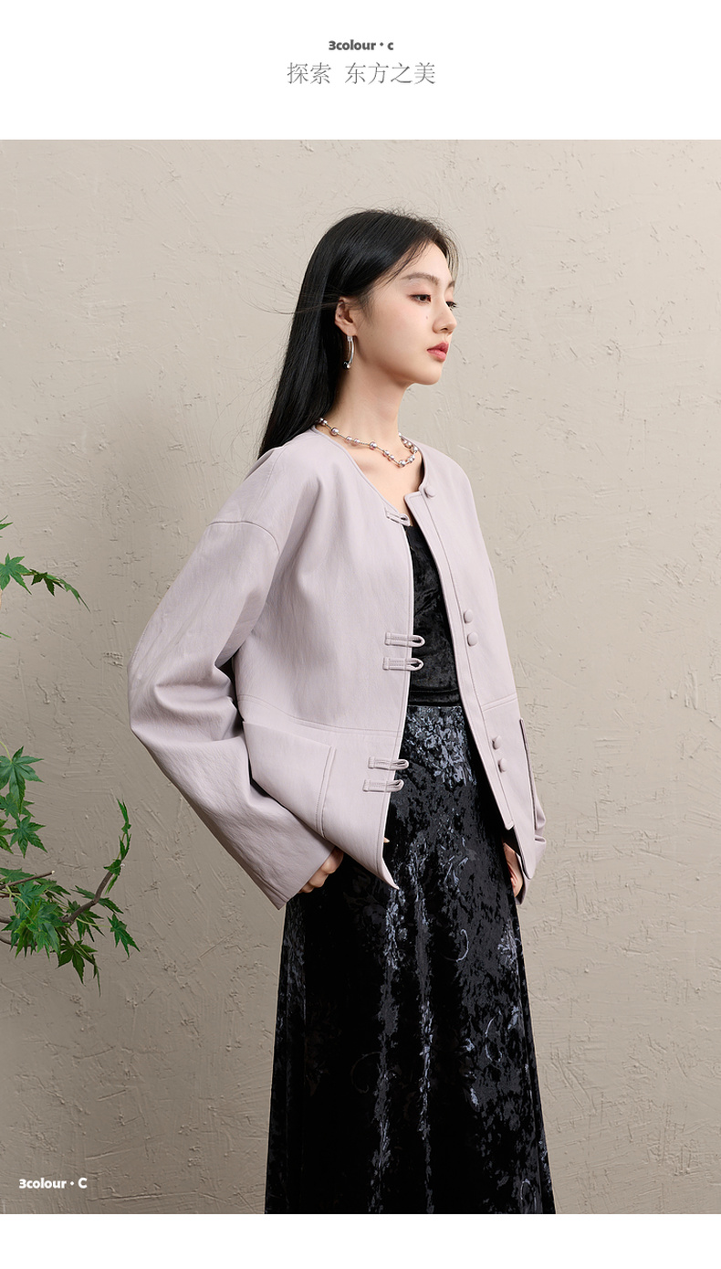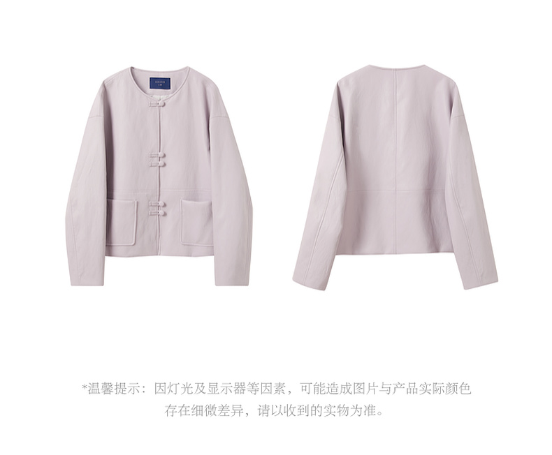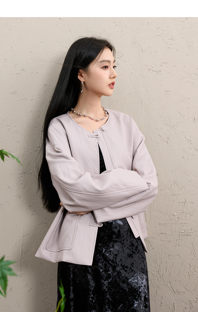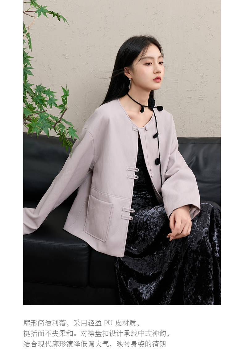 三彩【长乐未央】2025冬季新款PU仿皮外套宽松简约上衣单排扣C