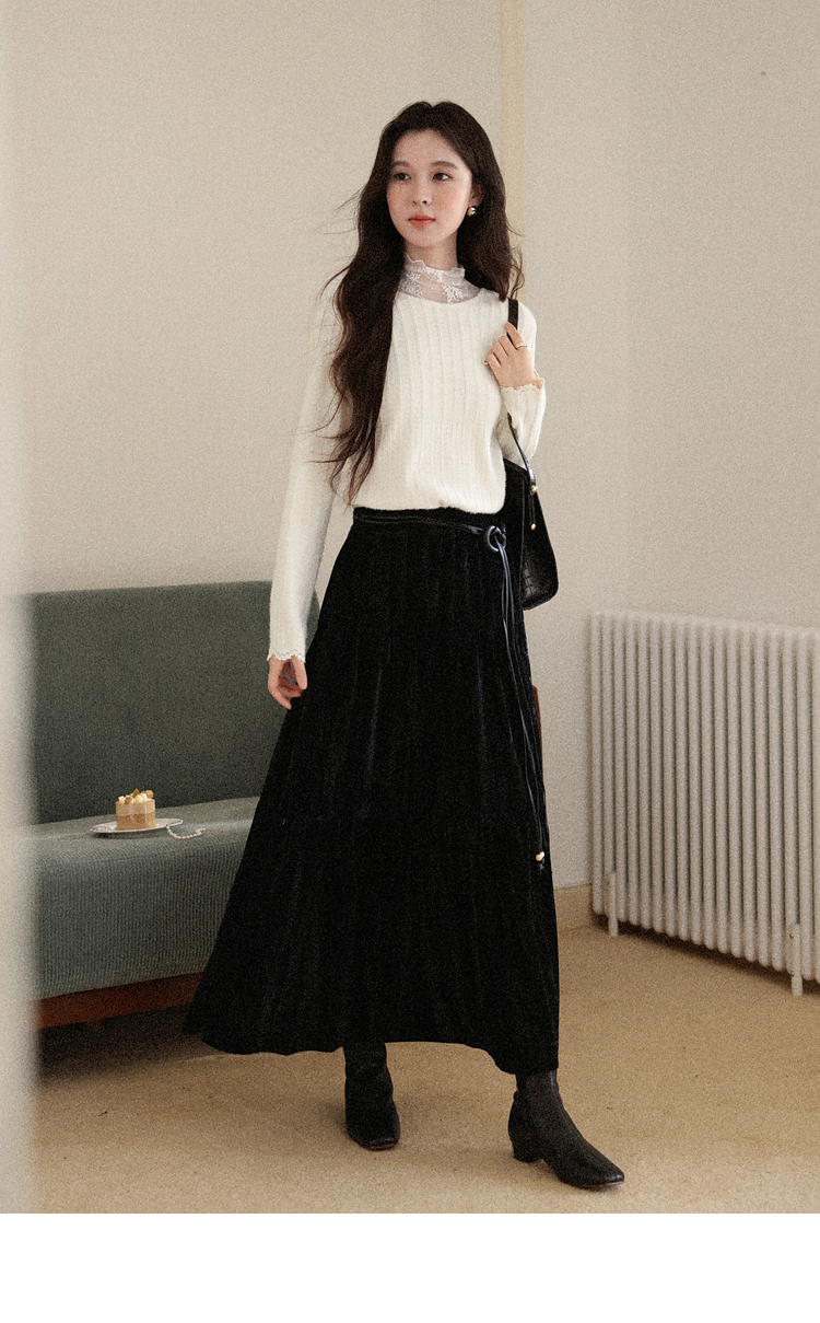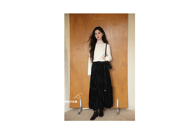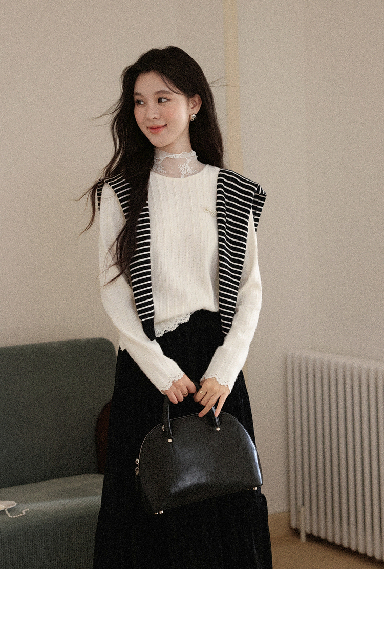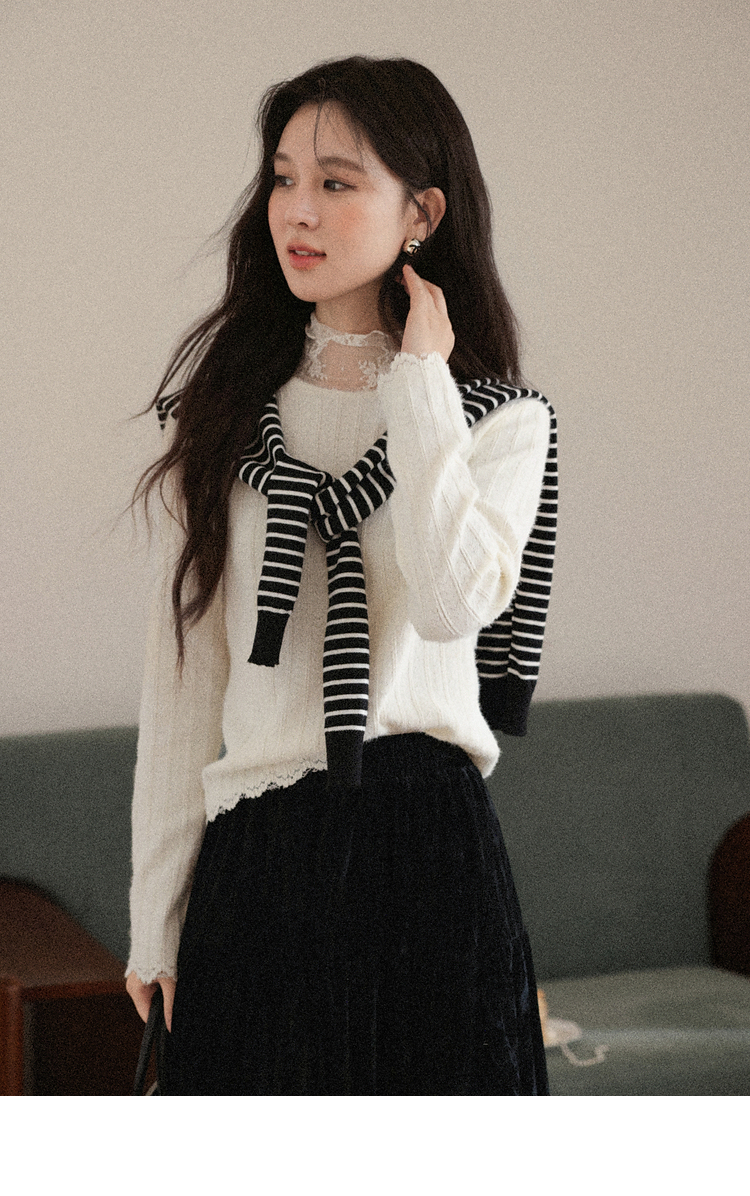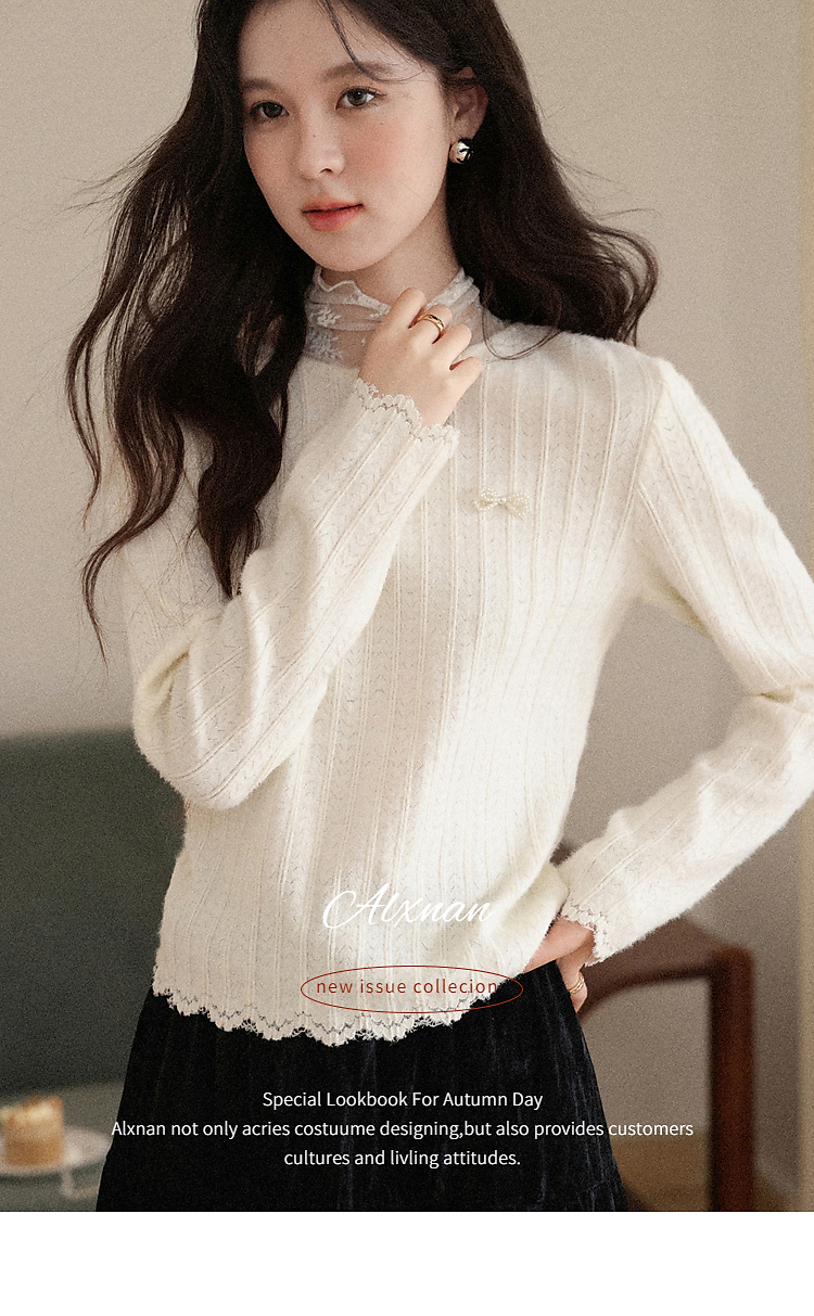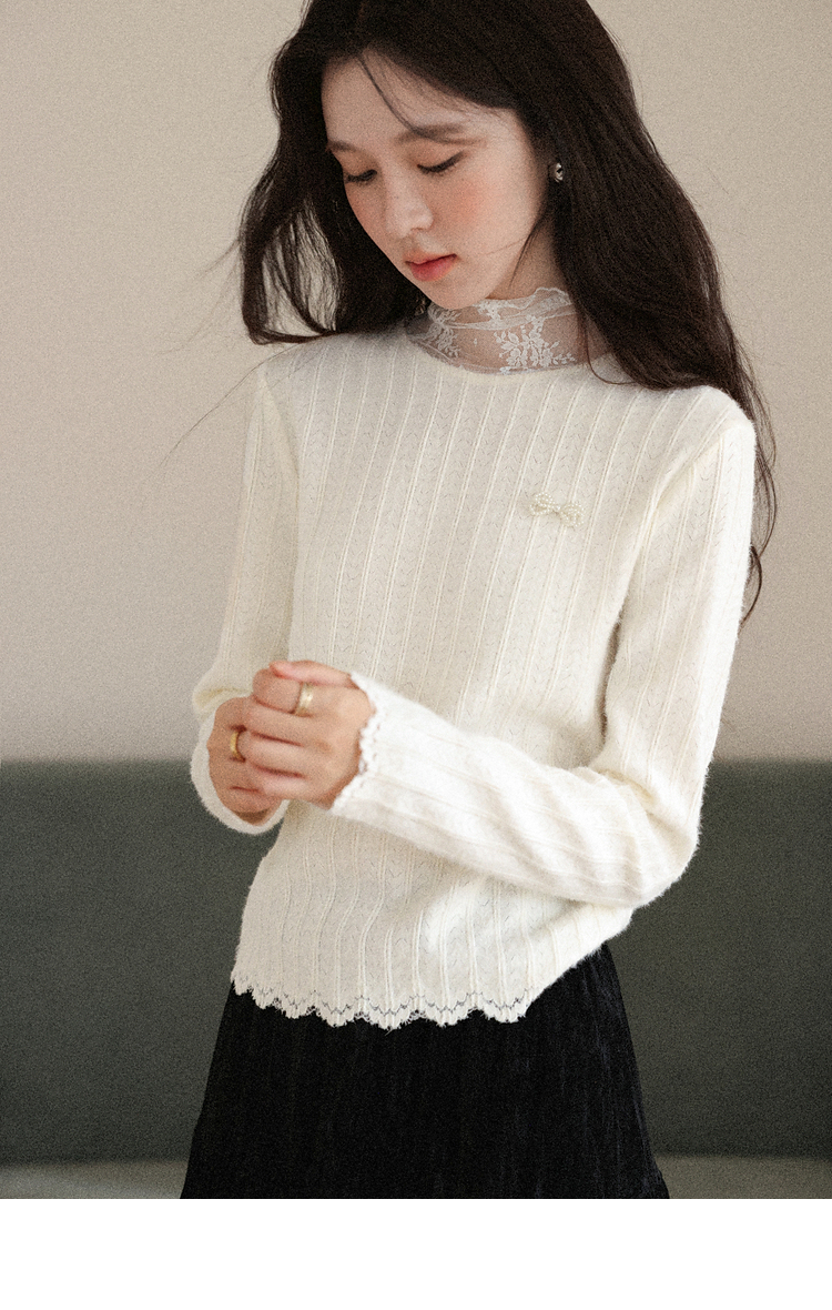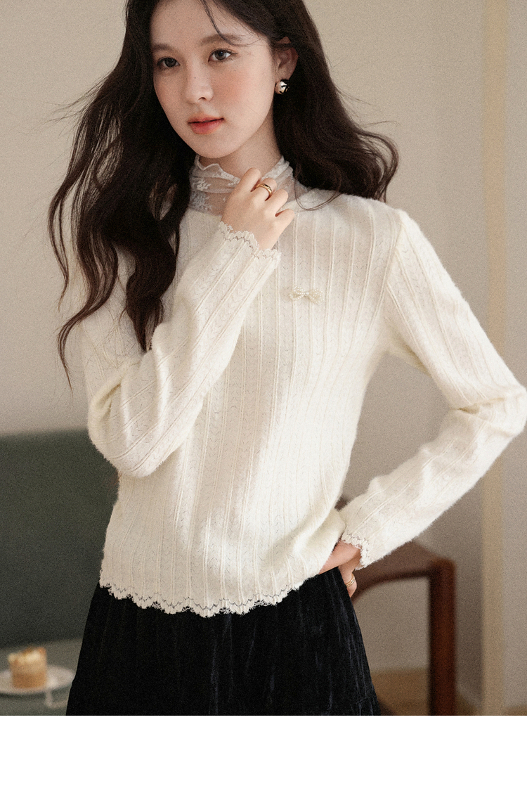鹿向南「雪舞晶灵」杏色假两件蕾丝拼接长袖毛针织衫秋新款上衣女