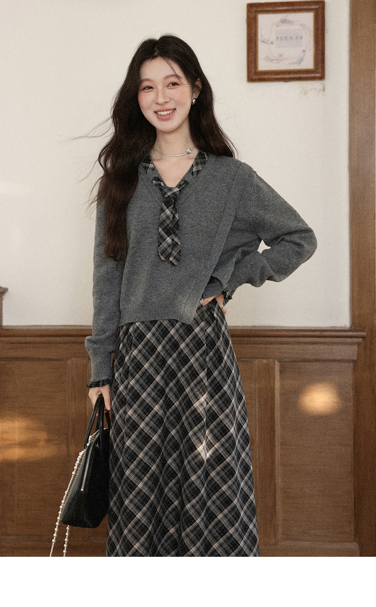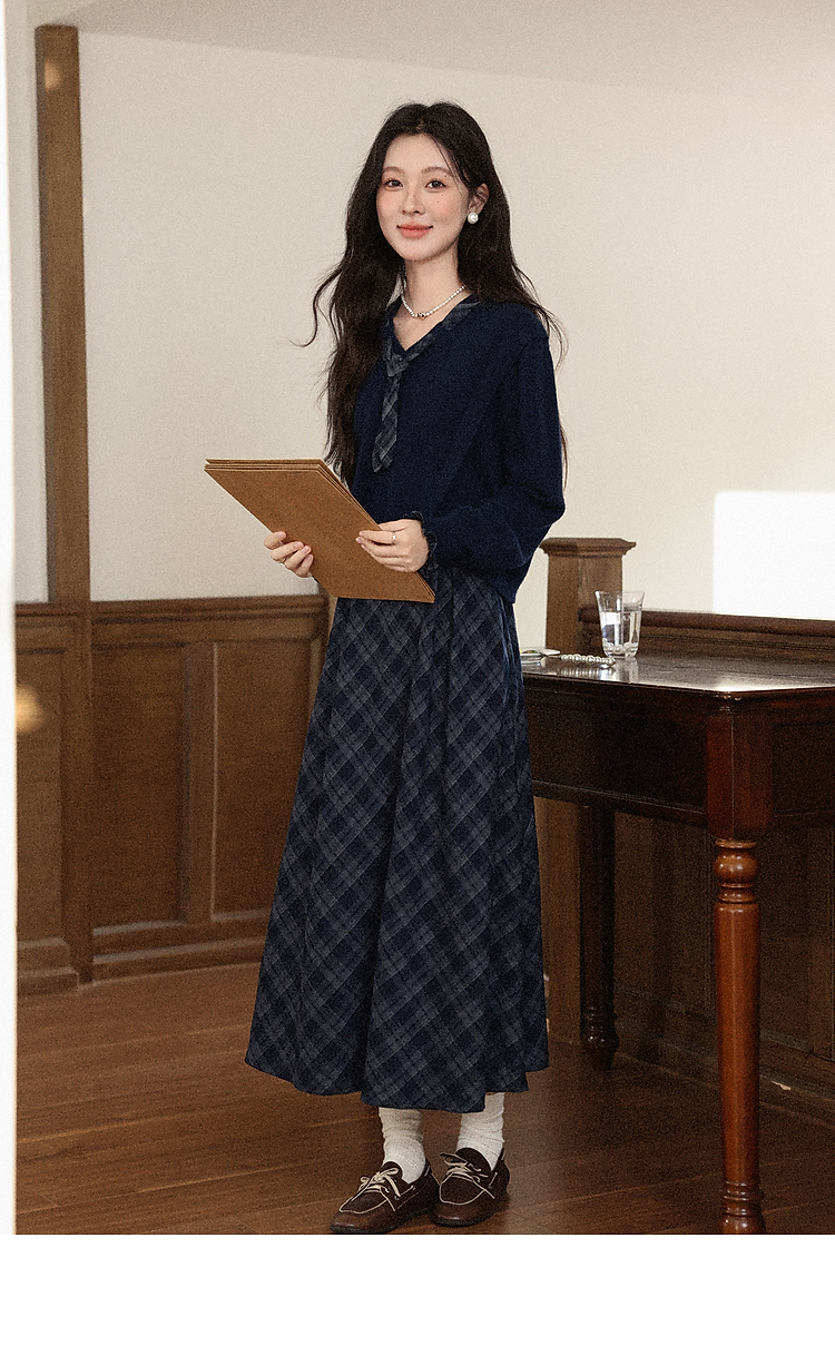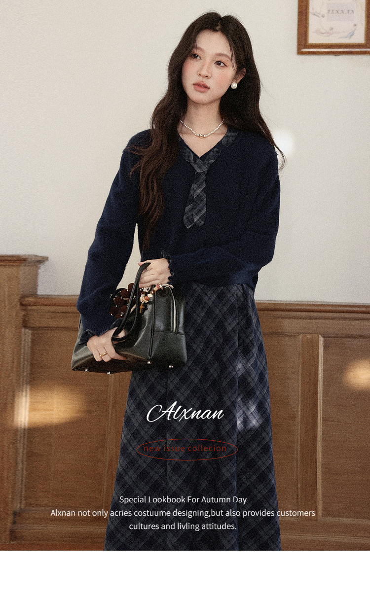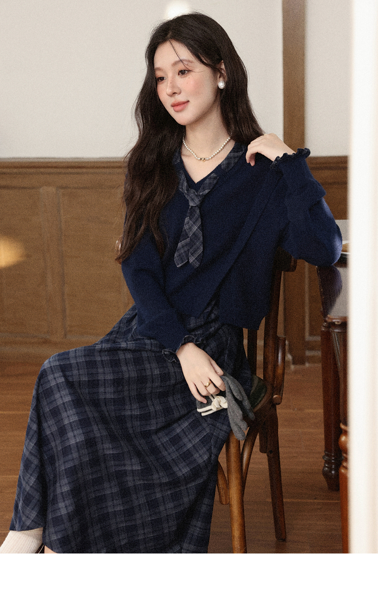 鹿向南「雾都黎明」学院风减龄蓝色格子连衣裙藏蓝色毛衣套装女秋