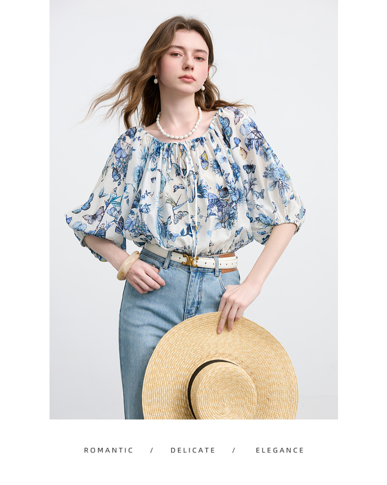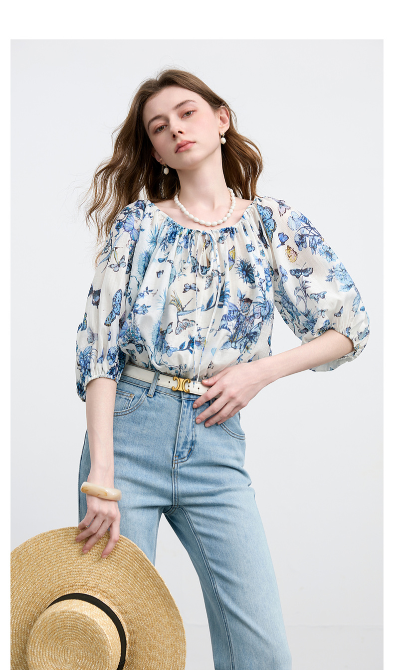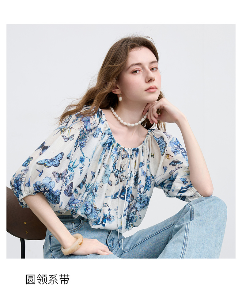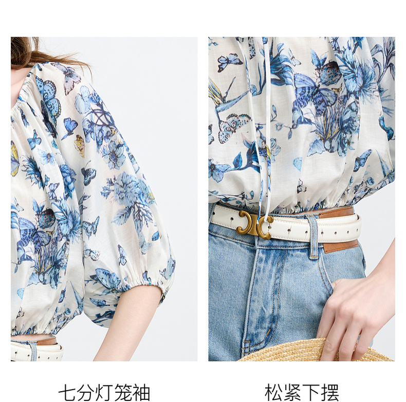 【莱赛尔+亚麻】三彩2025夏季新款繁花小衫圆领系带七分灯笼袖莱赛尔宽松短款M