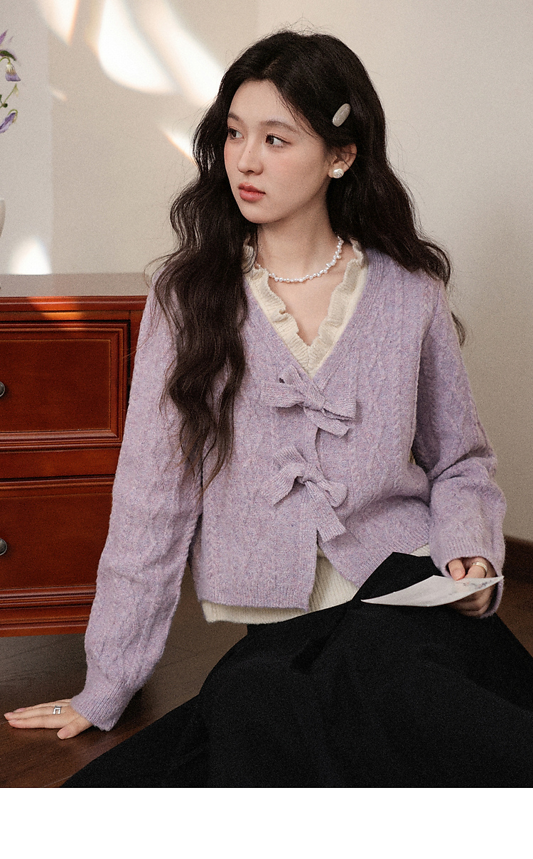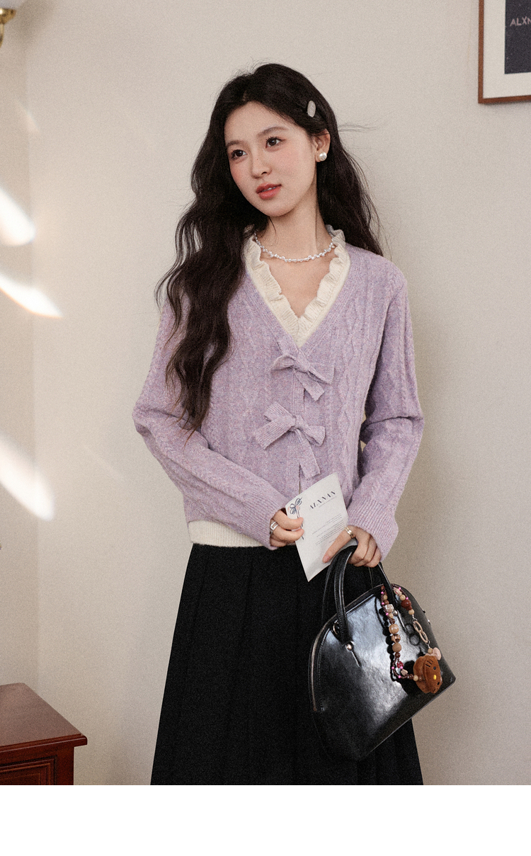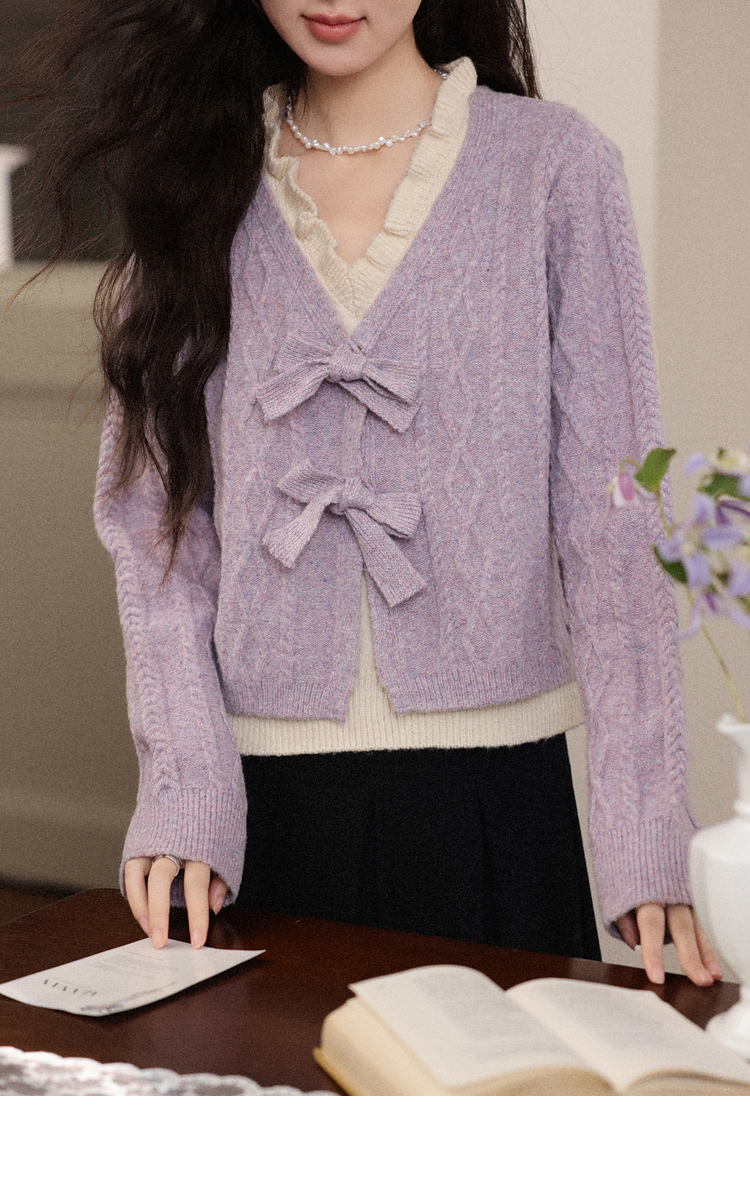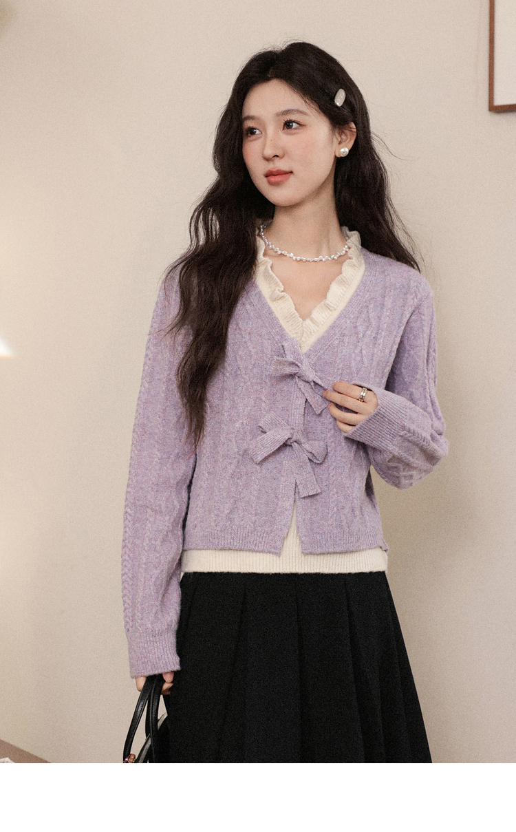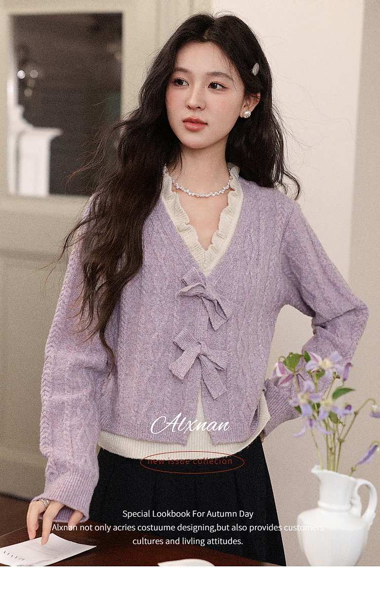 鹿向南「柔紫绞花」假两件紫色蝴蝶结毛衣女秋冬新款法式慵懒上衣