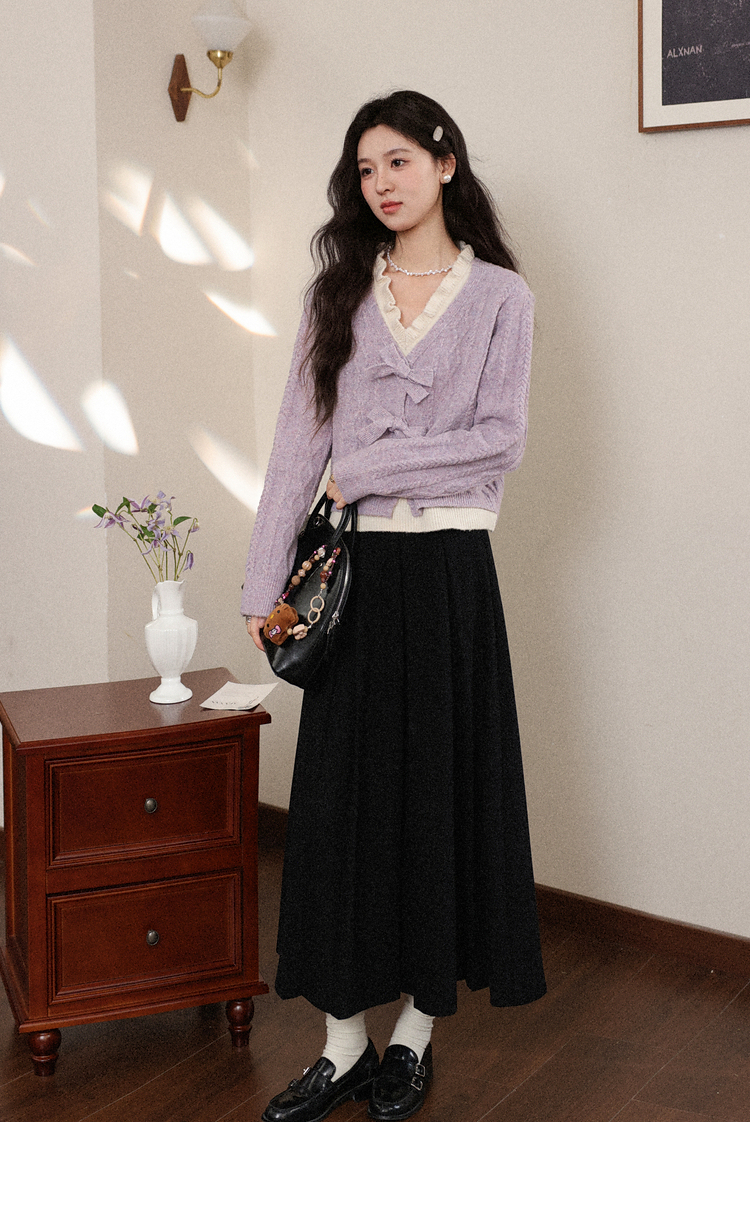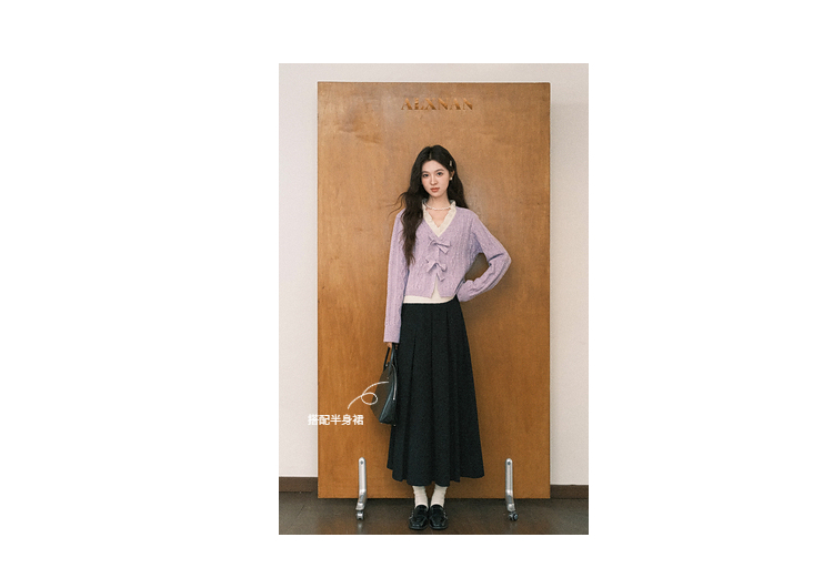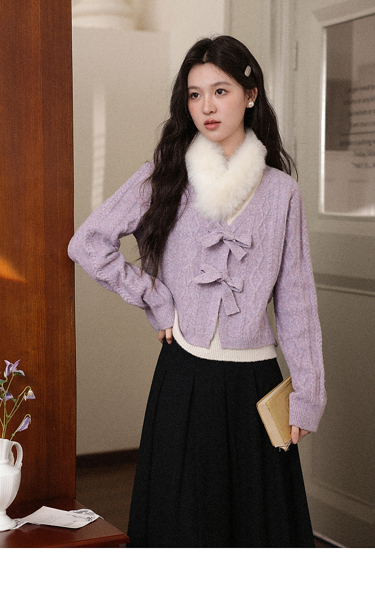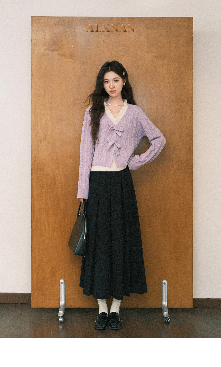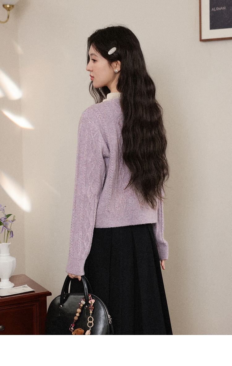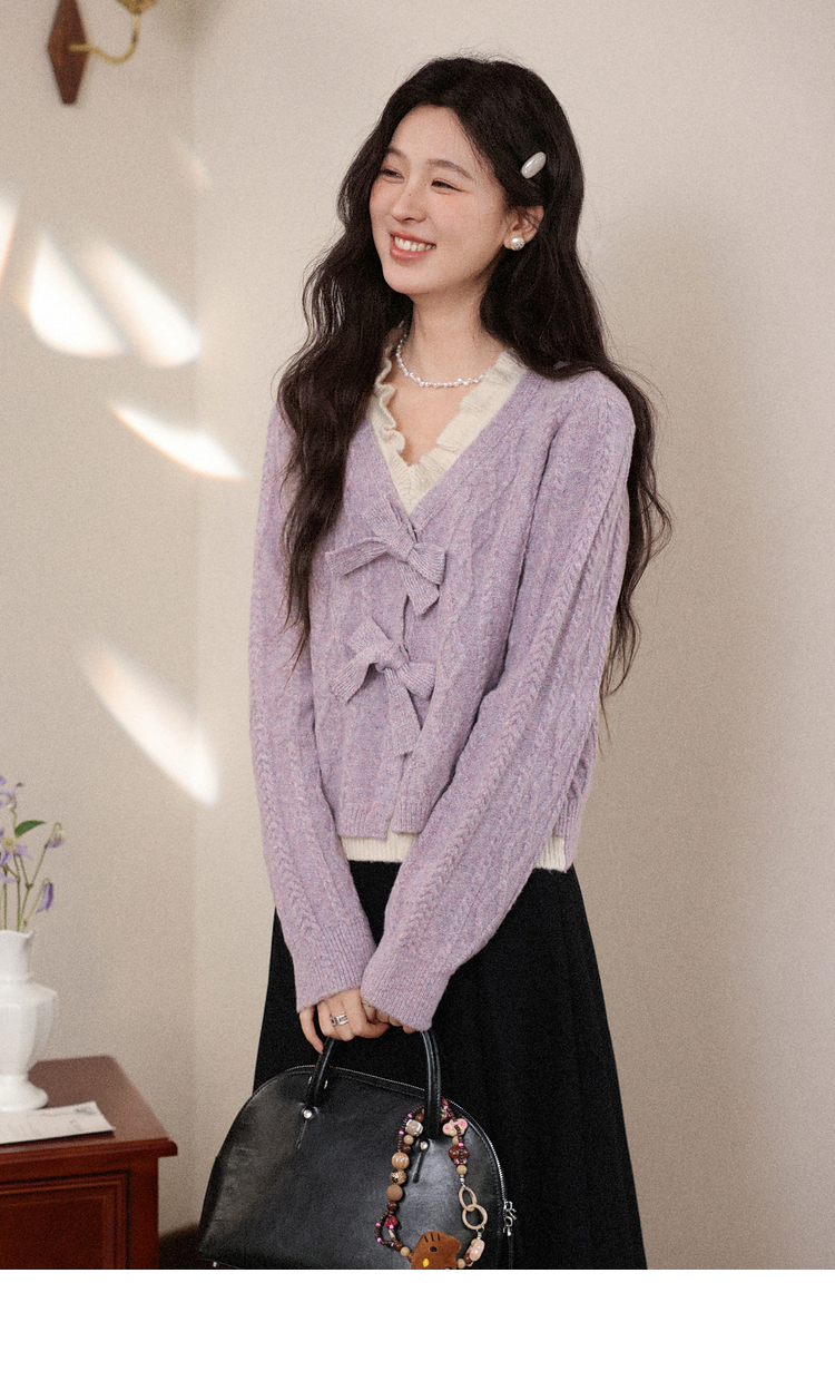 鹿向南「柔紫绞花」假两件紫色蝴蝶结毛衣女秋冬新款法式慵懒上衣