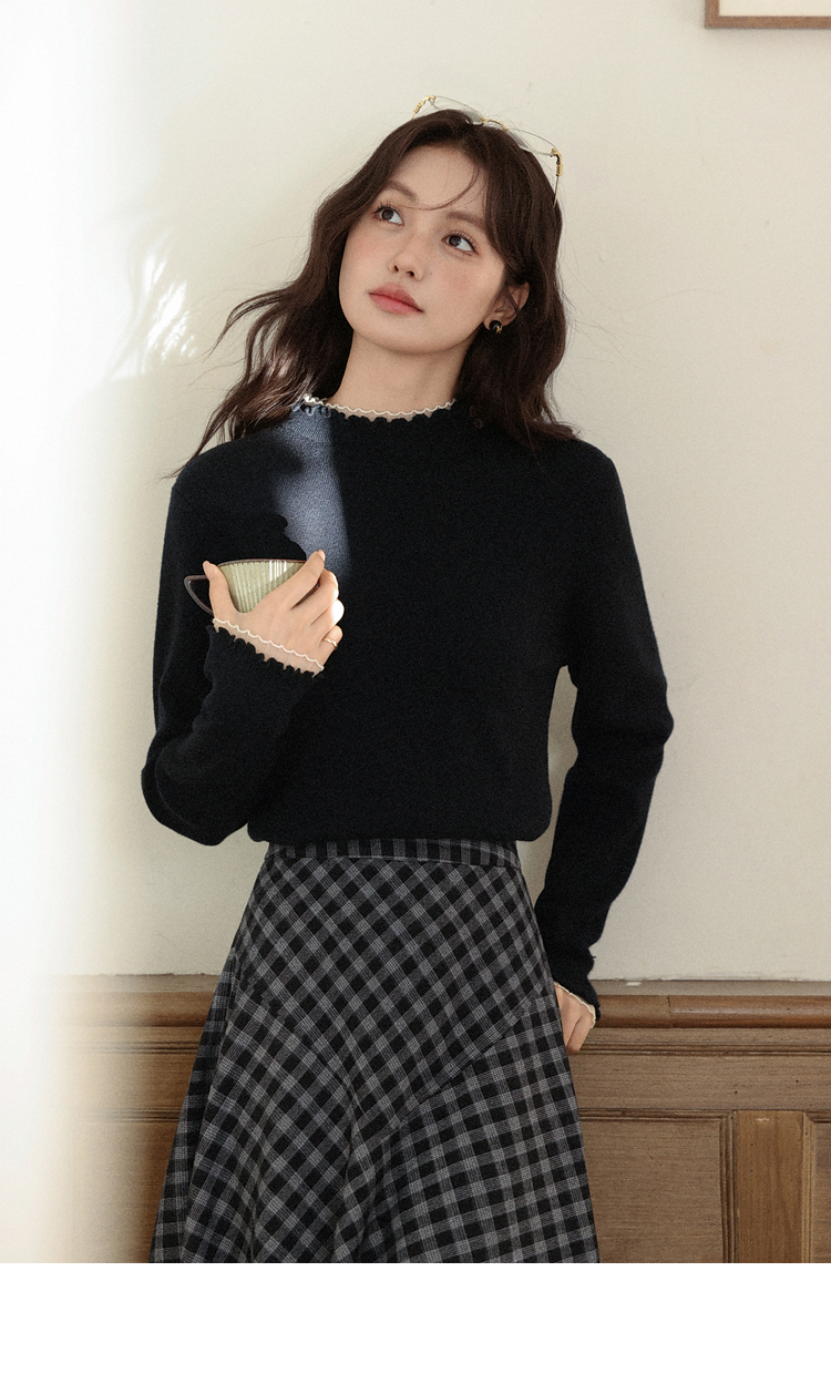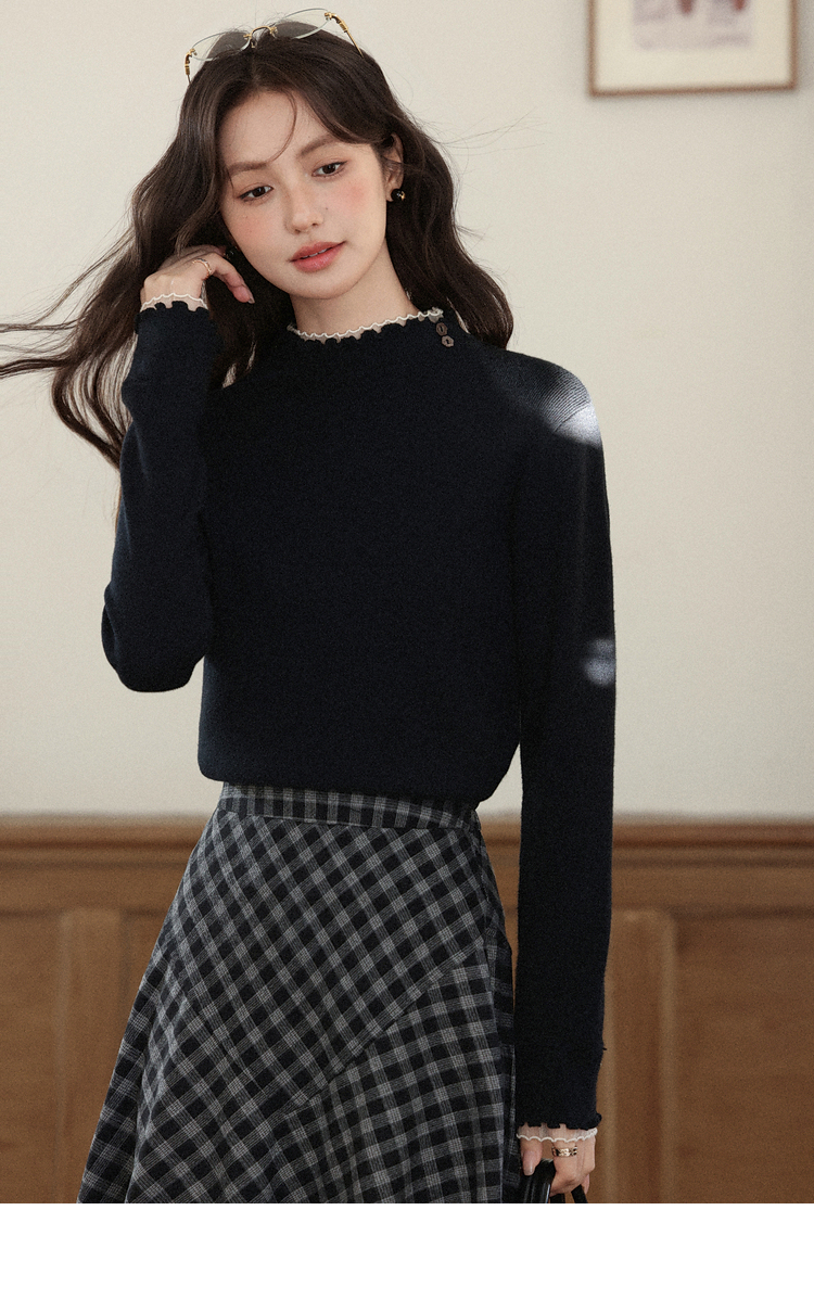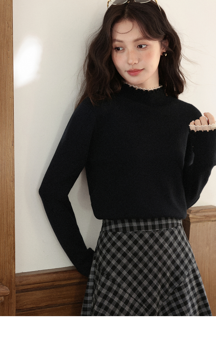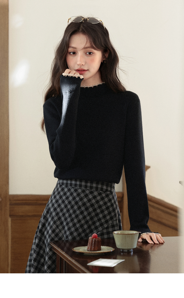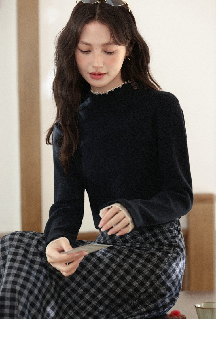 鹿向南「日与月光」黑色木耳边针织衫女秋新款内搭显瘦打底衫上衣