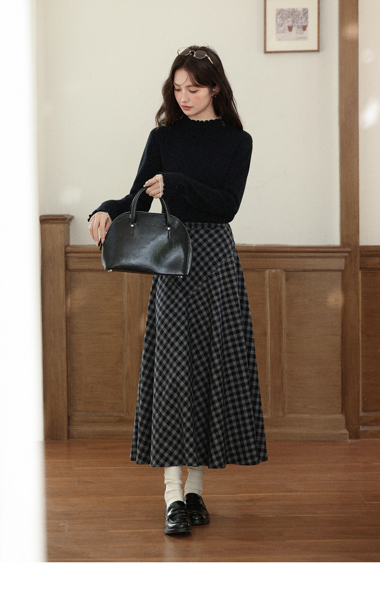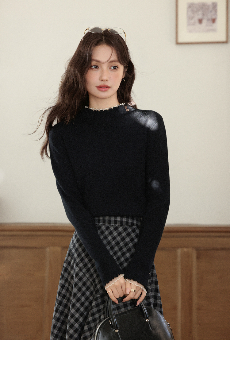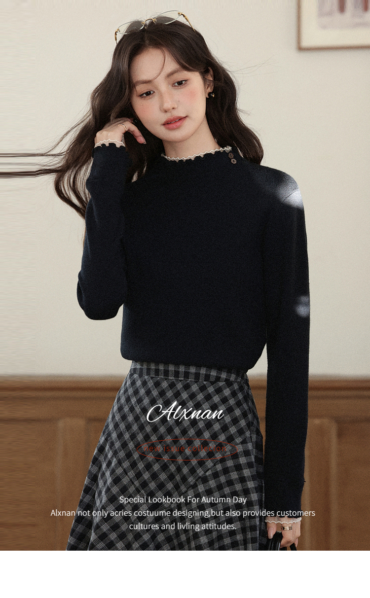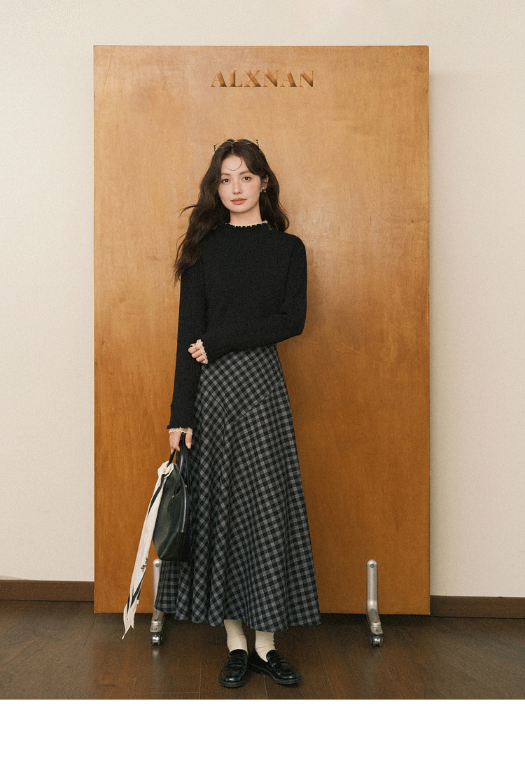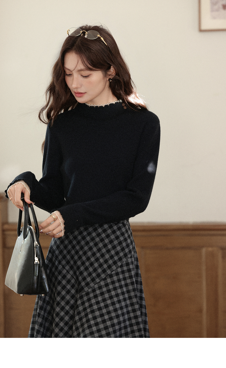 鹿向南「日与月光」黑色木耳边针织衫女秋新款内搭显瘦打底衫上衣