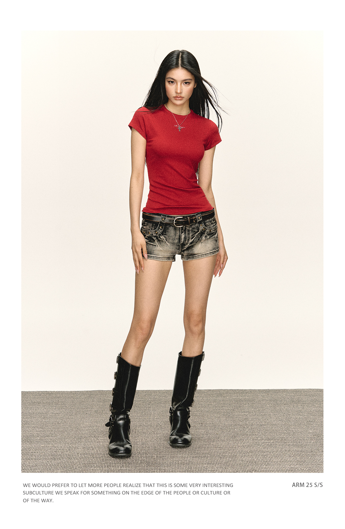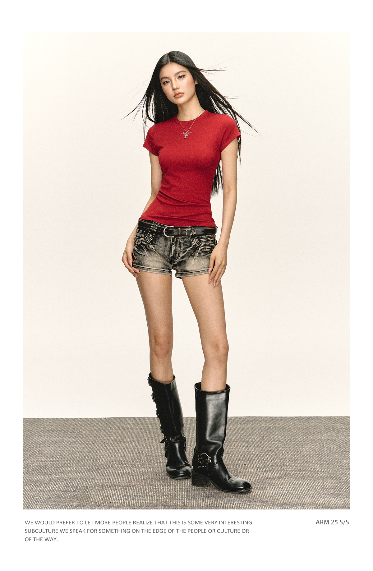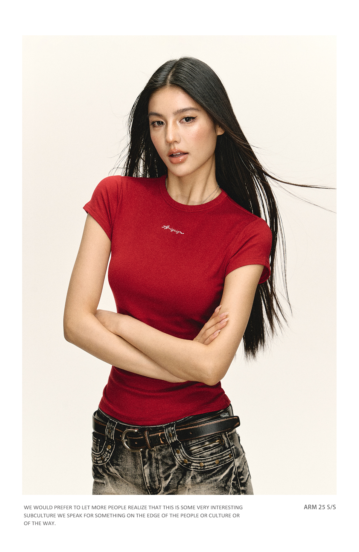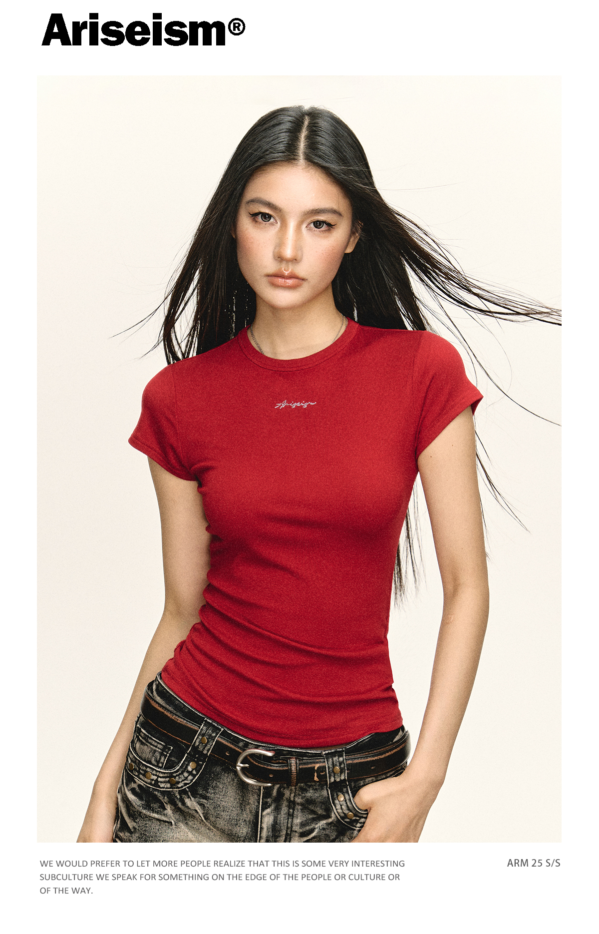 Ariseism 美式复古辣妹红色正肩短袖T恤女2025夏季新款修身上衣