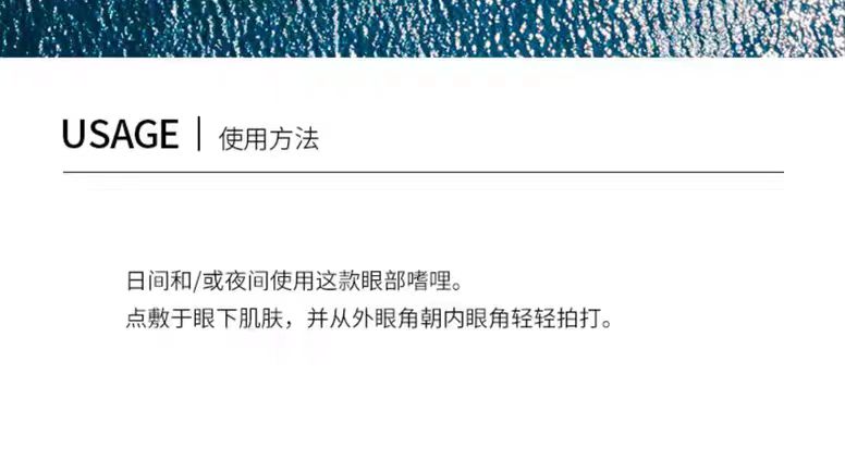 早上和/或晚间使用这款眼部啫喱。点敷于眼下肌肤,并从外眼角朝内眼角轻轻拍打。