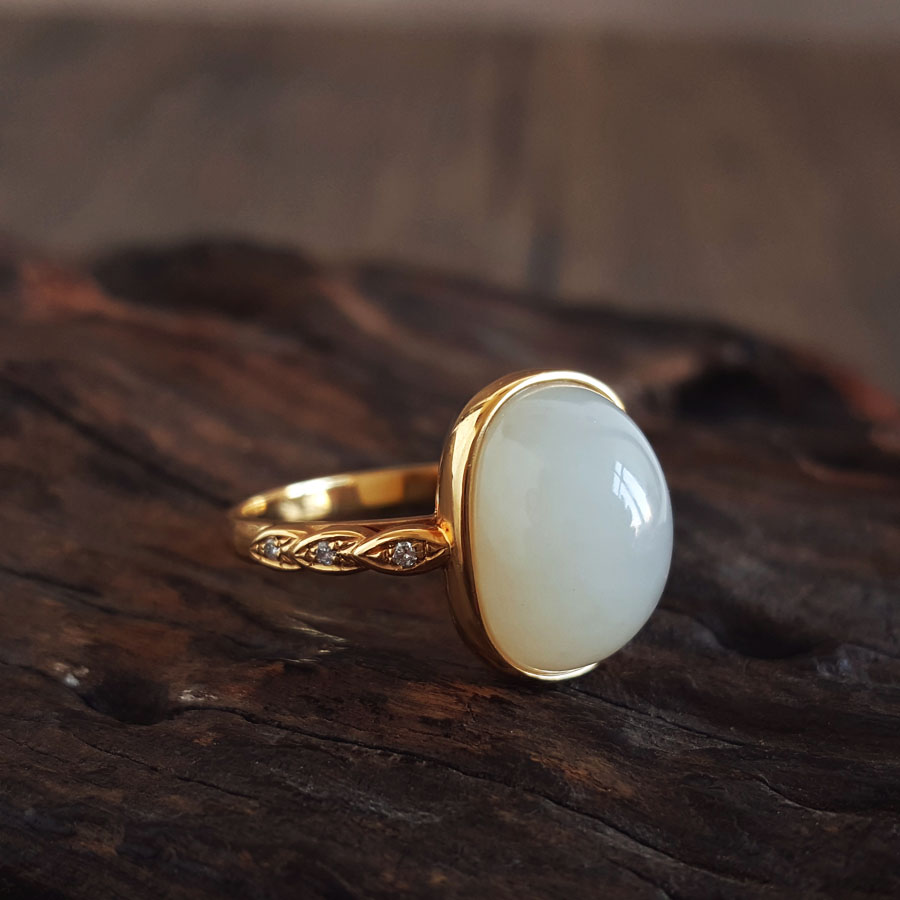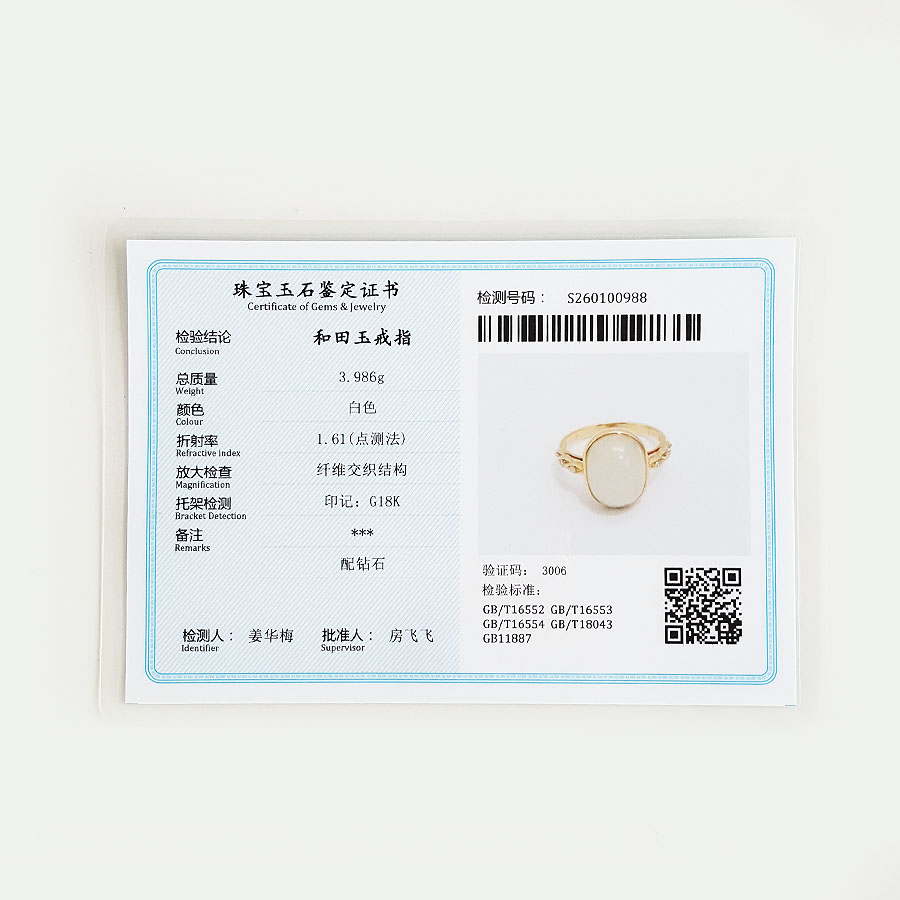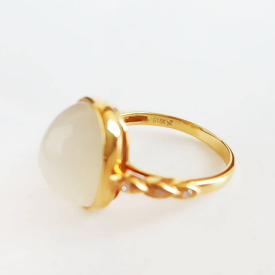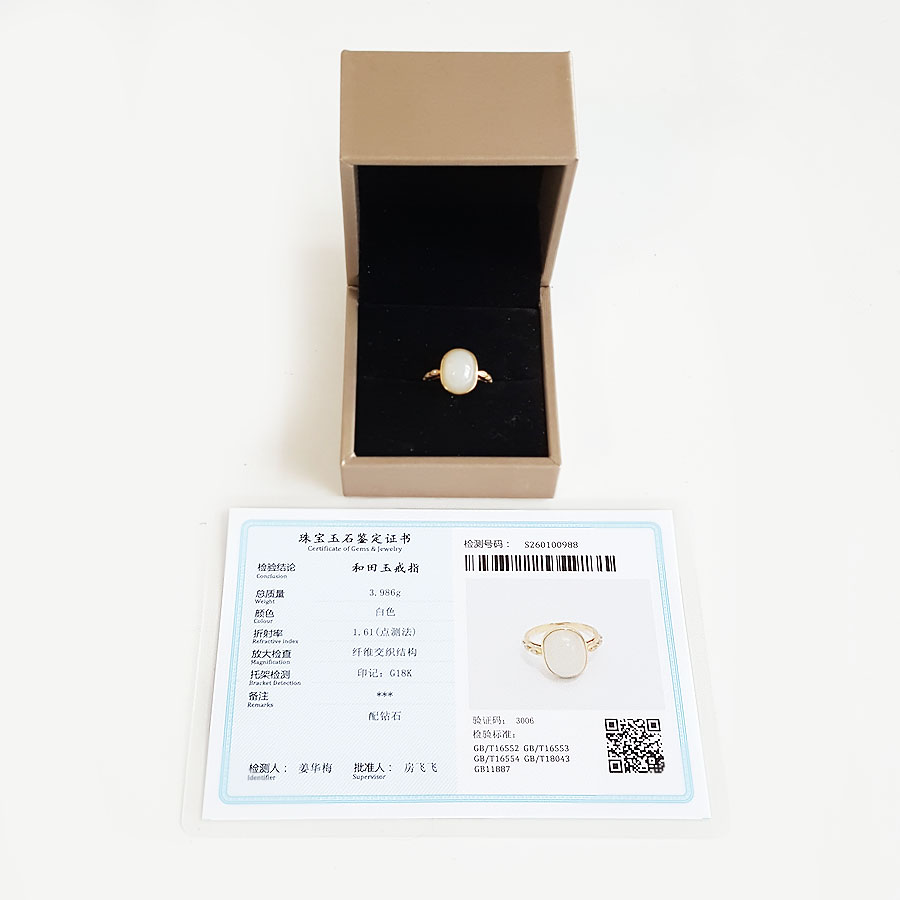 名称 | AU750黄金镶钻镶天然新疆籽料细腻一级白油润度佳蛋面和田玉戒指 |
