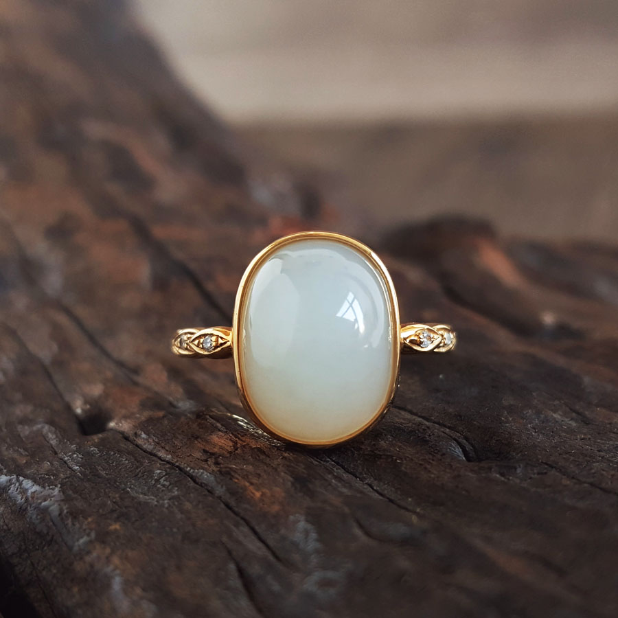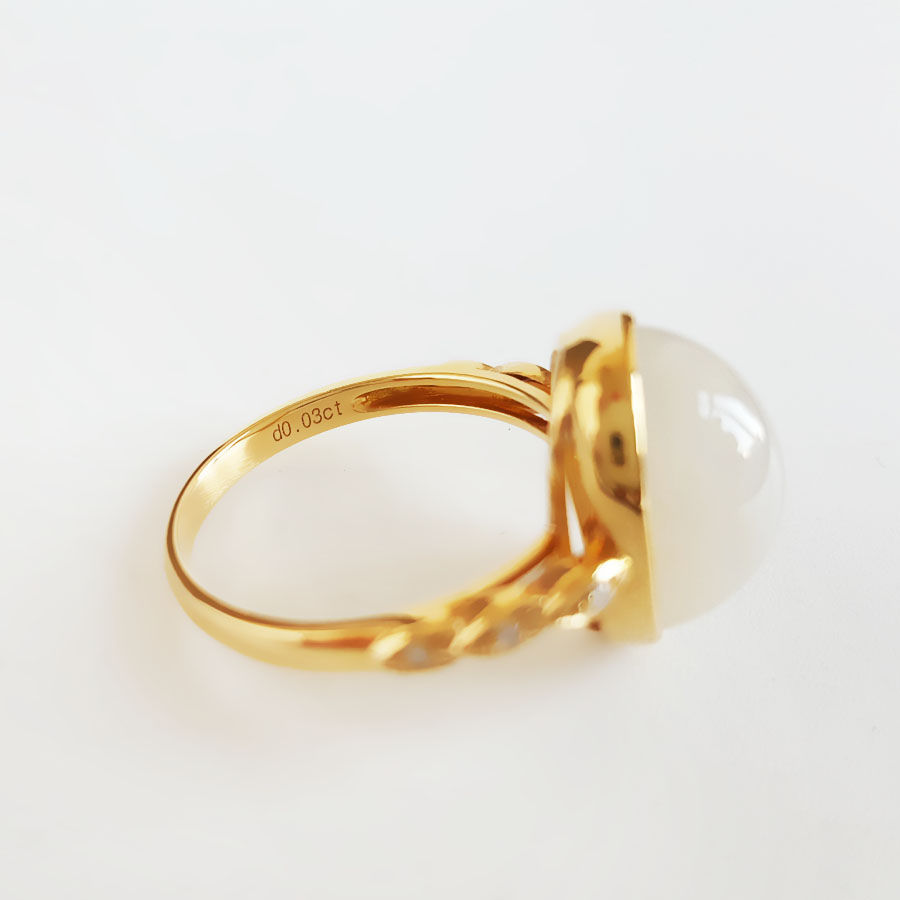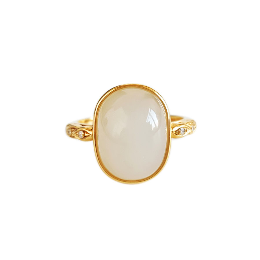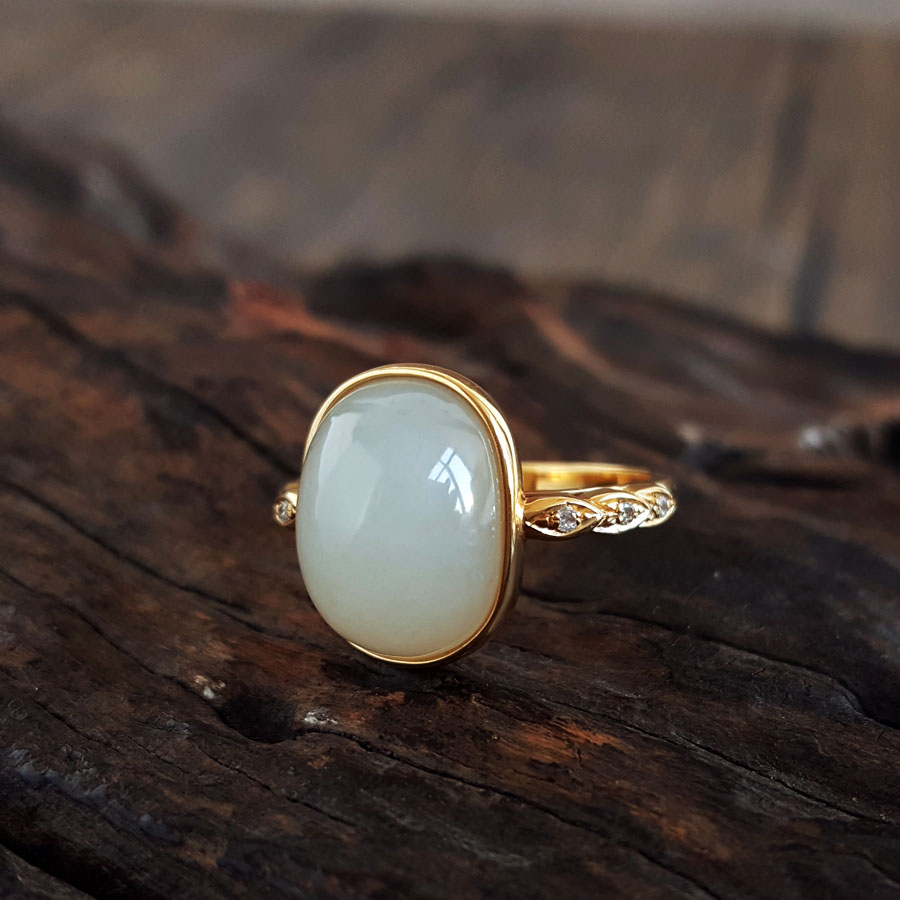 名称 | AU750黄金镶钻镶天然新疆籽料细腻一级白油润度佳蛋面和田玉戒指 |