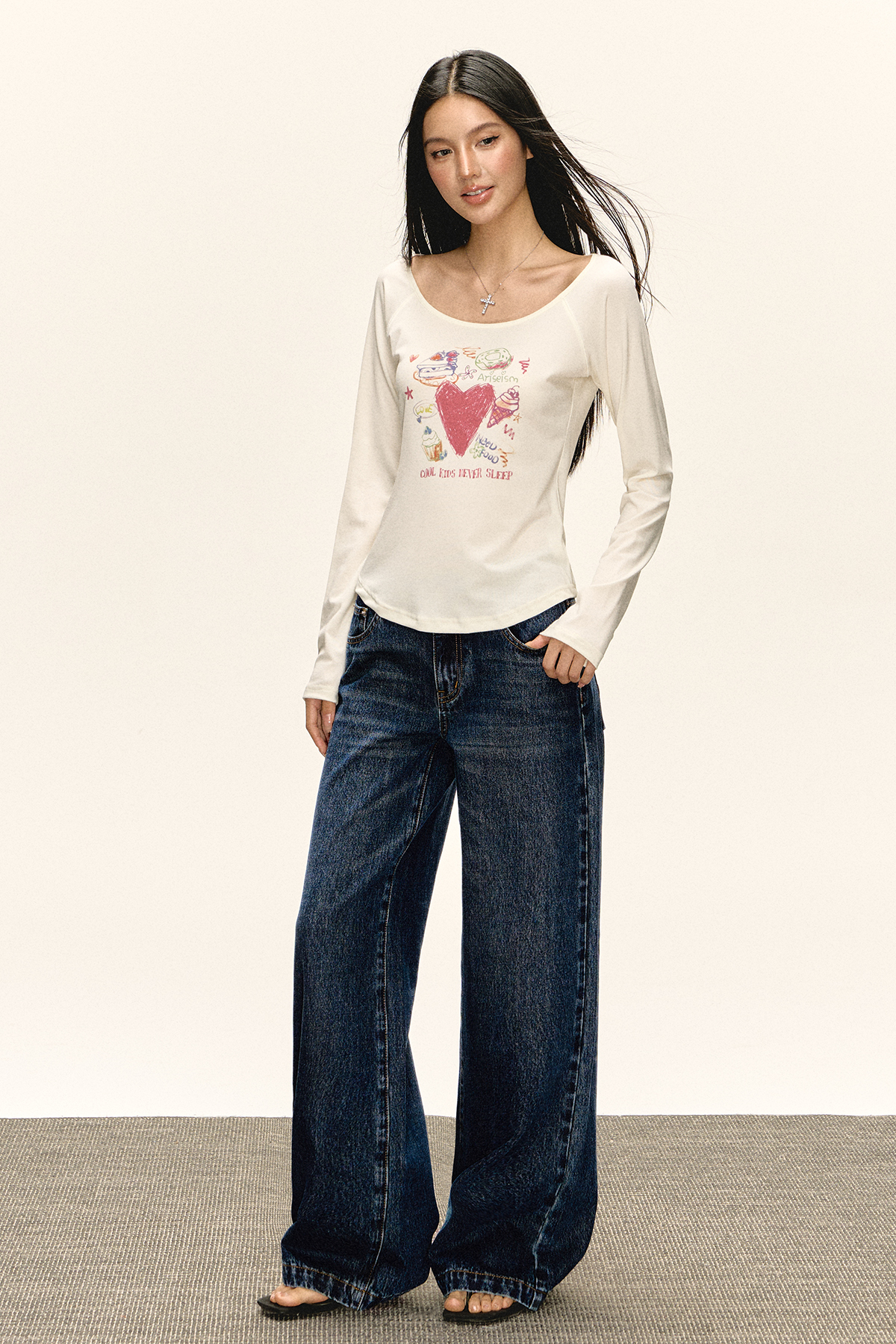 Ariseism 美式复古设计感蕾丝斜肩长袖T恤女春季新款内搭上衣