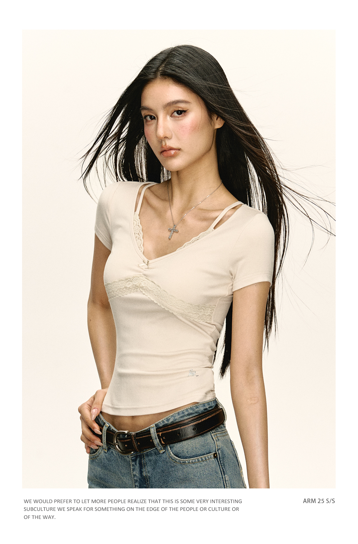 Ariseism美式复古辣妹假两件V领短袖T恤女夏季新款修身显瘦上衣