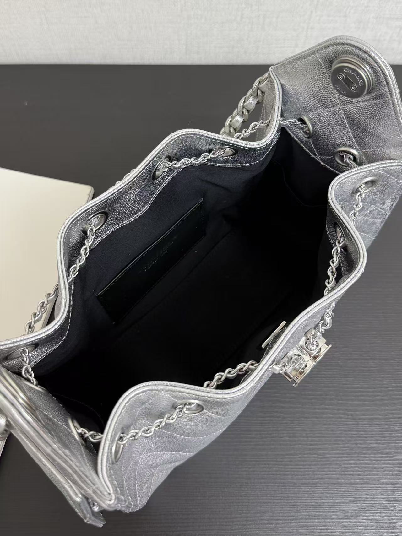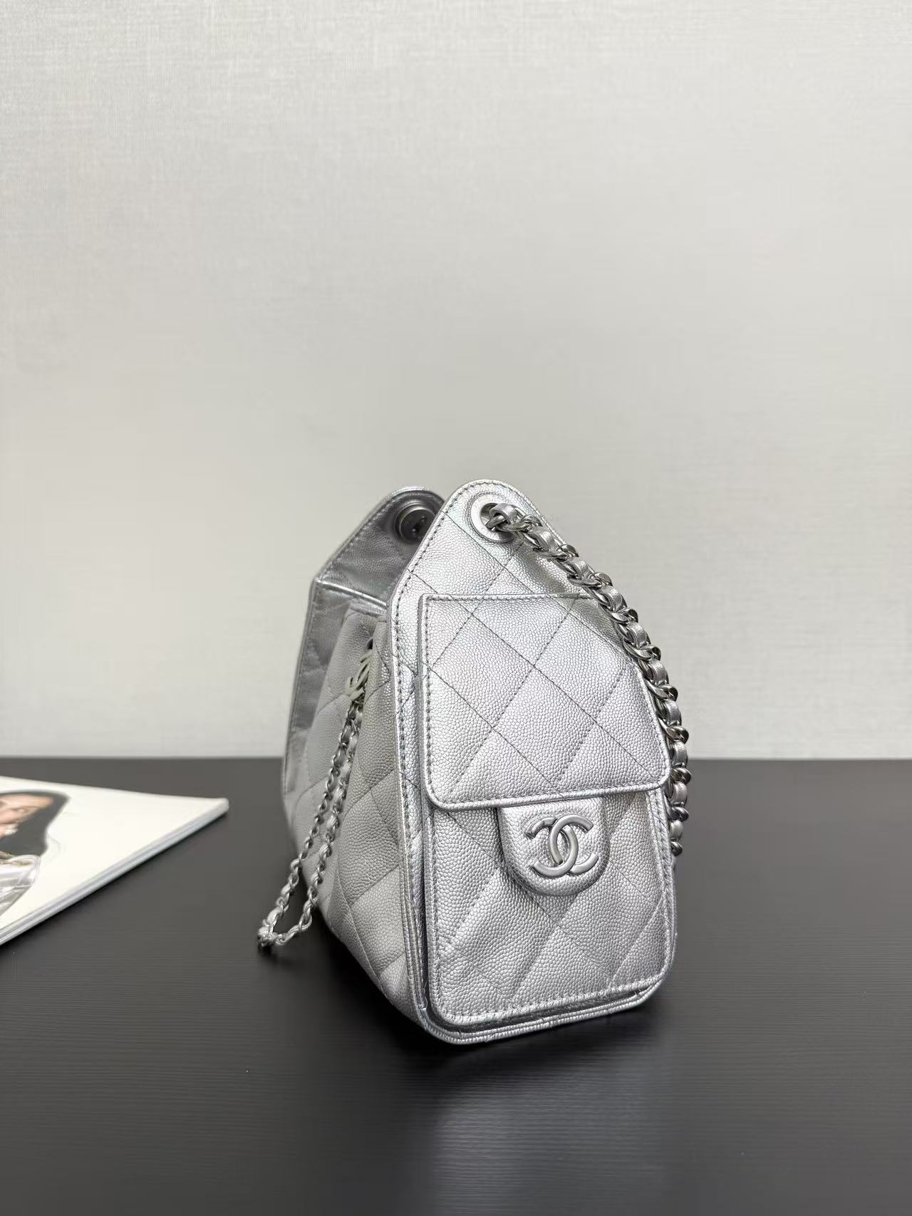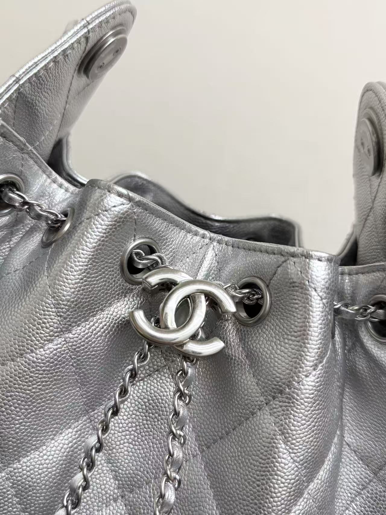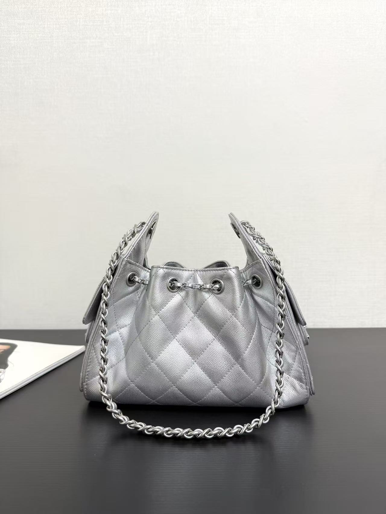 现货25水桶抽绳包!鱼子酱mini 新添一个小可爱,它的本体其实是一个小水桶包,鱼子酱牛皮皮质是摸起来比较柔软的,很像刻意而为之的精心搭配.大大的双C logo设计,可以调动!迷人的小细节,⛓链条不可调节、溜金搭配,五金选用的复古做旧金,非常有中古的味道,忍不住称绝的一款✨ 尺寸22*20*12.5