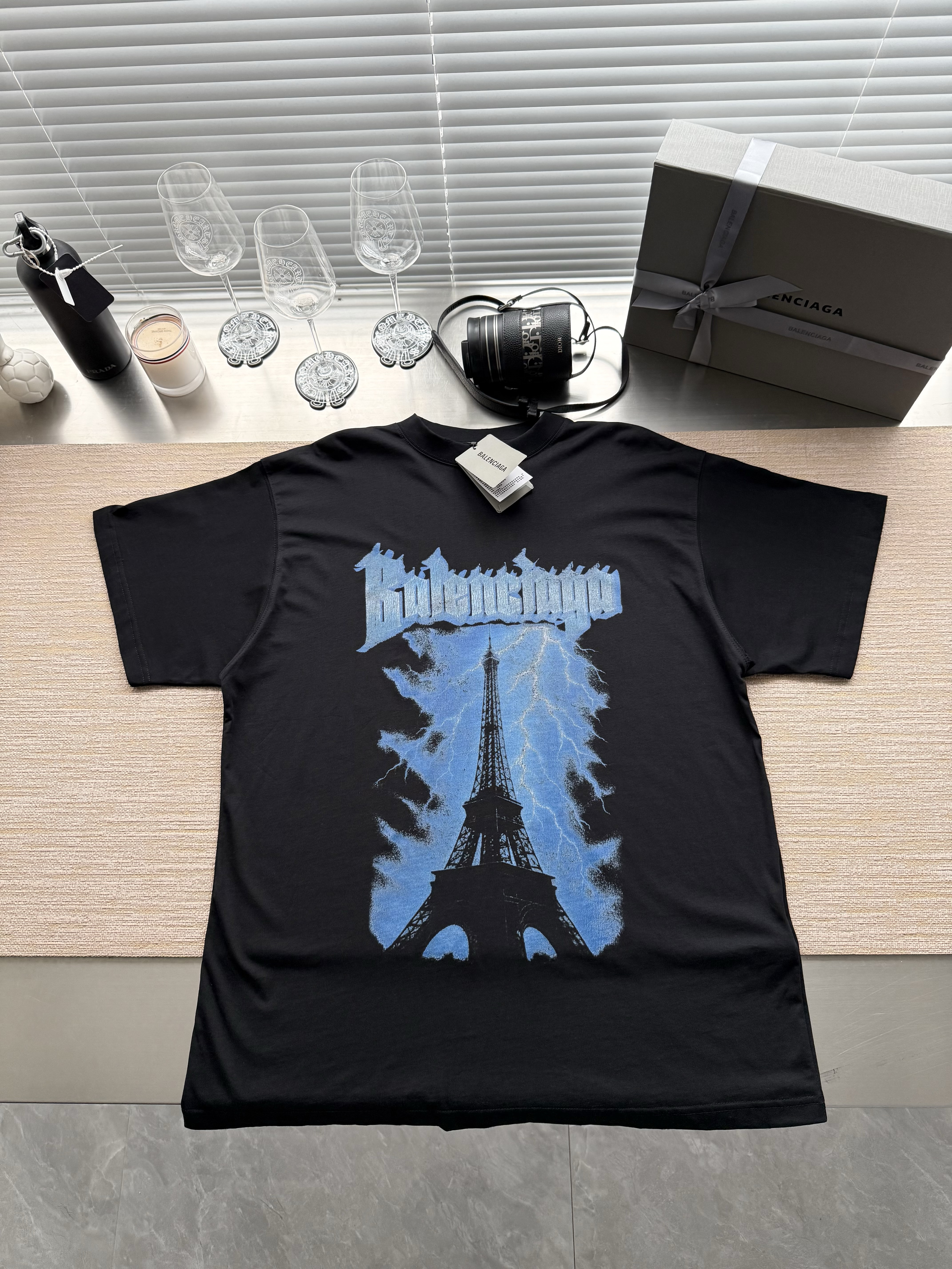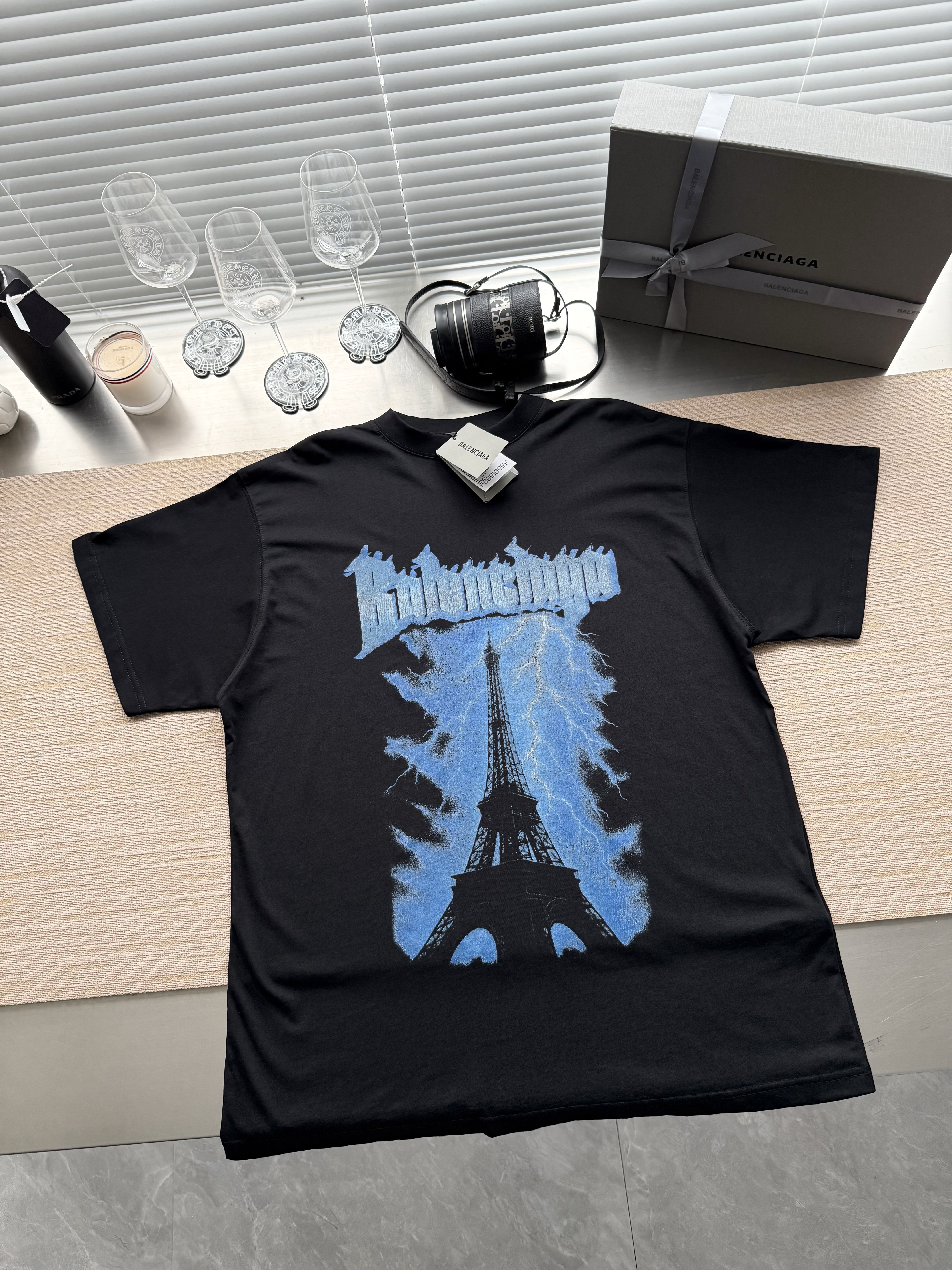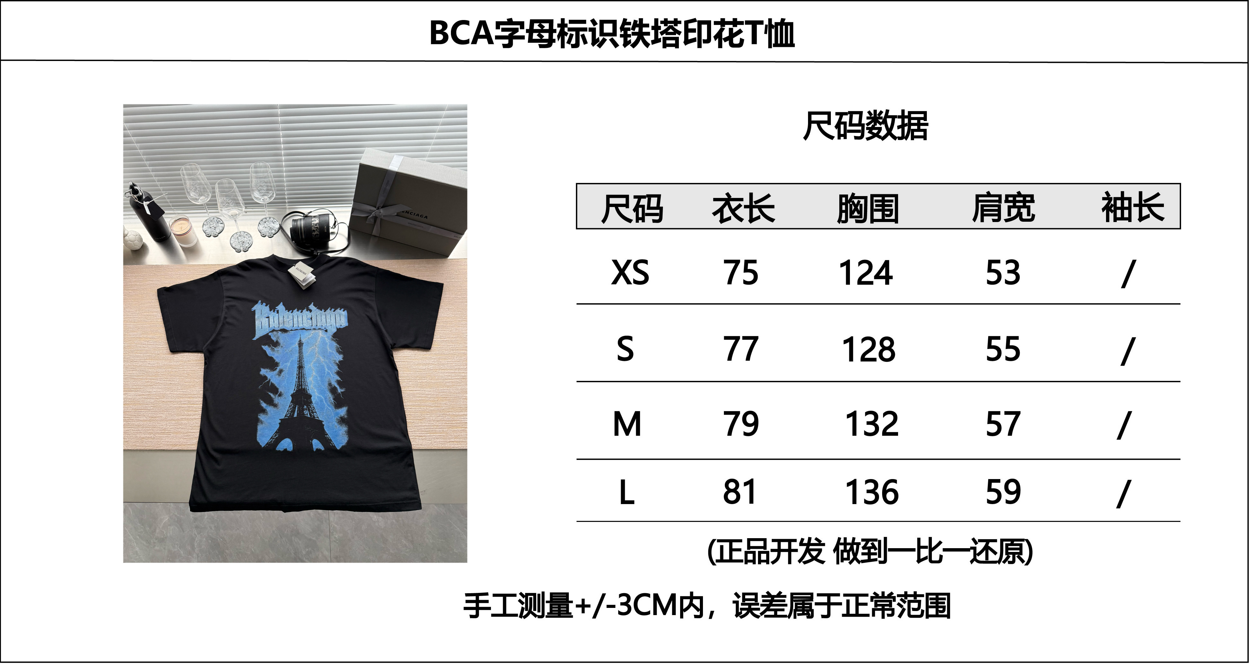 Balenciaga巴黎世家26ss字母标识铁塔印花T恤‼️整件衣服7000购买ZP拆解打造,定制黑色平纹针织面料,做到100%全棉进口纱线,前幅饰以Paris thunderstorm艺术作品印花,定制标志性罗纹领口,超紧密度局部编织,袖口 下摆双层锁边超高密度走线,真正做到1:1copy 闭眼入 码数:XS S M L
