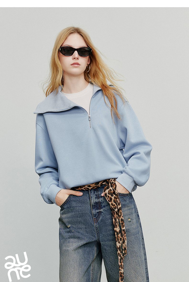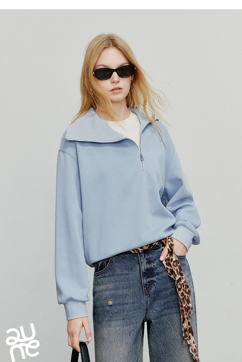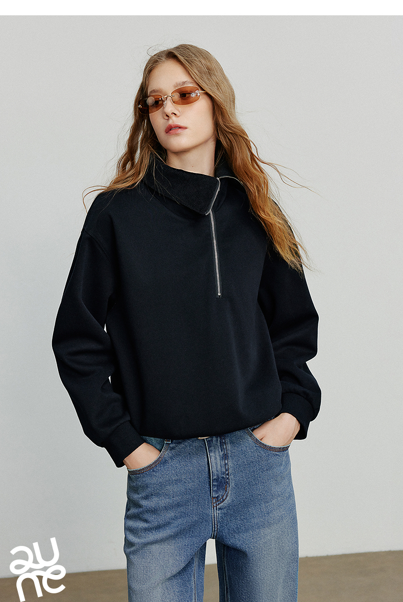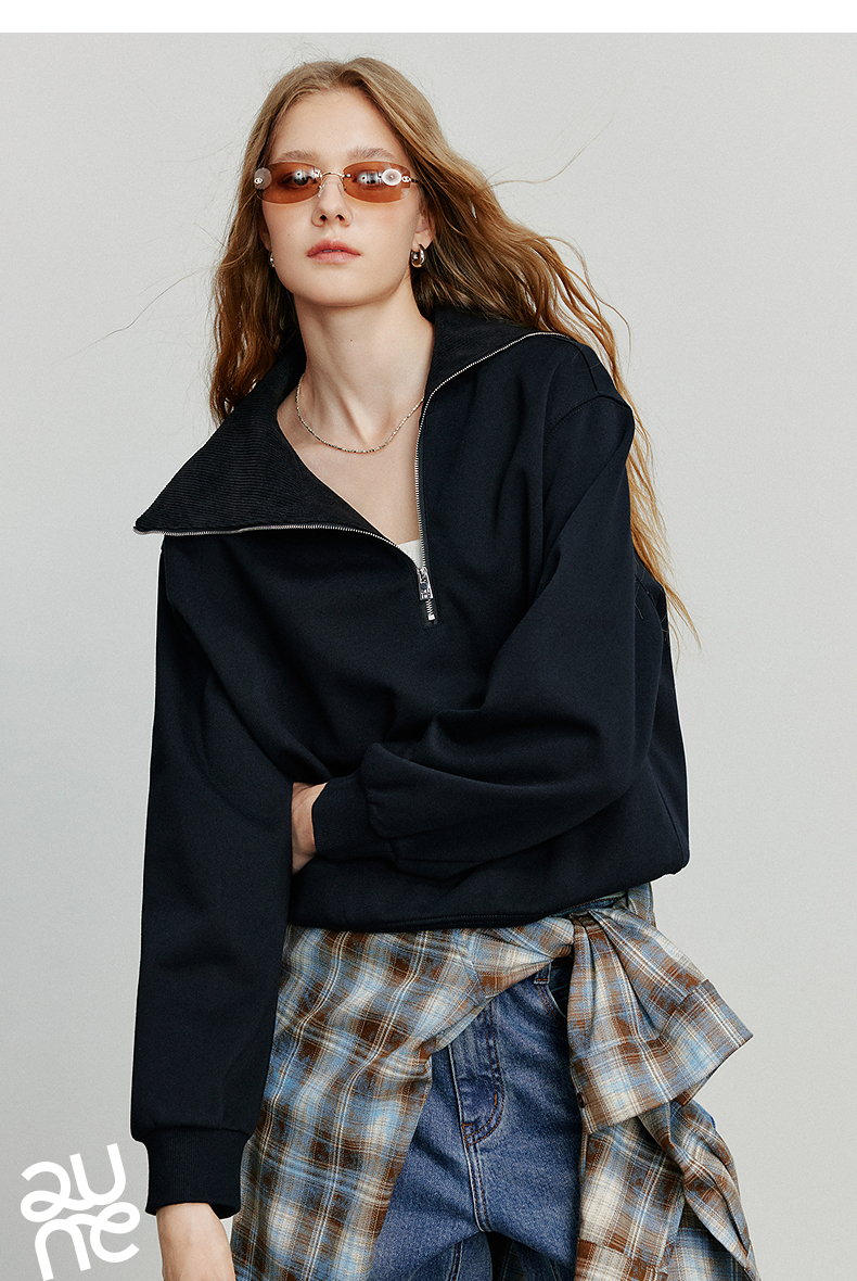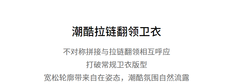 初语 2025新款卫衣女 不对称拉链大翻领长袖时髦拼接设计感潮酷上衣