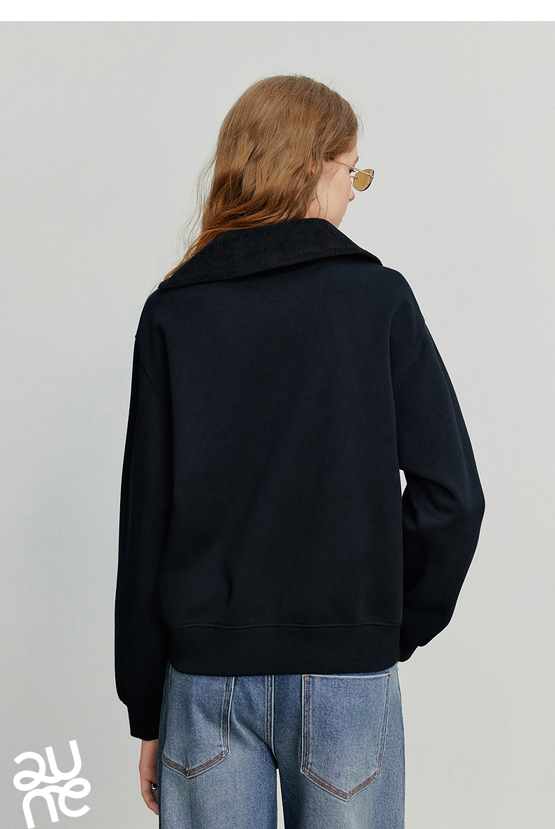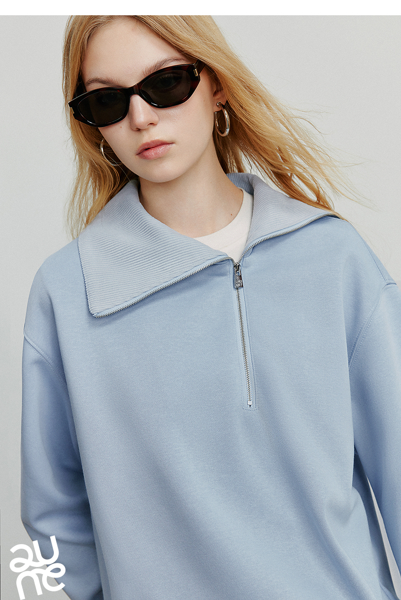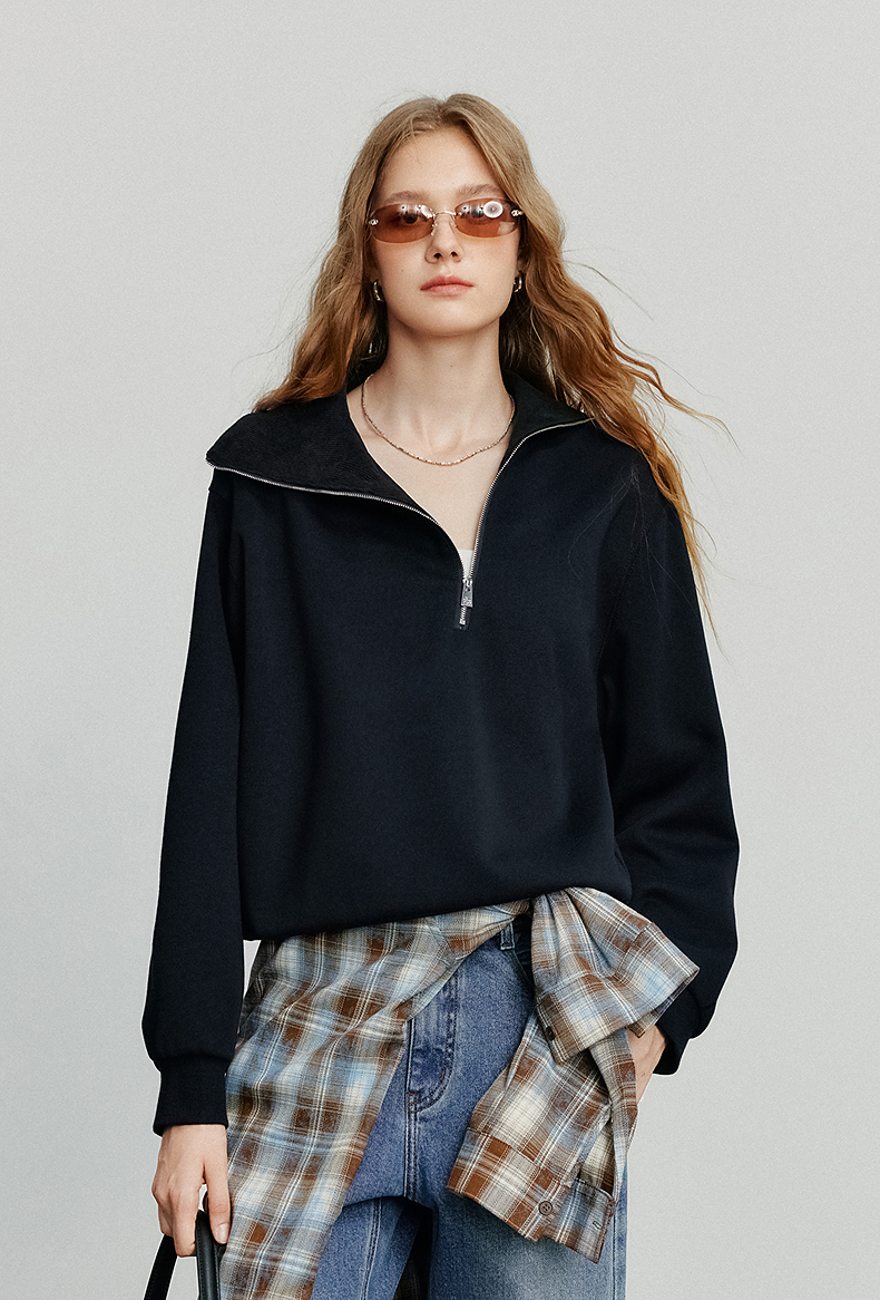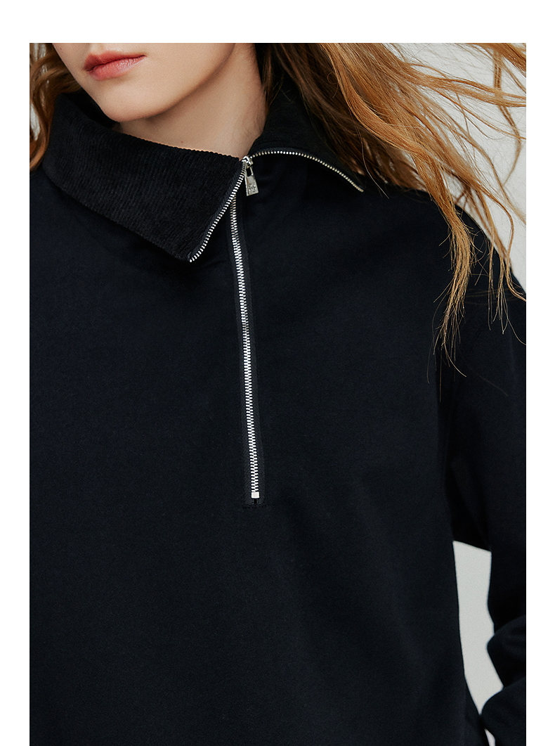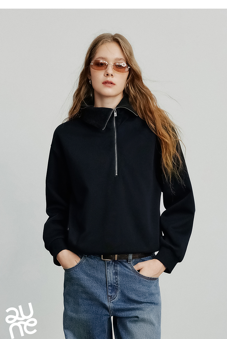 初语 2025新款卫衣女 不对称拉链大翻领长袖时髦拼接设计感潮酷上衣