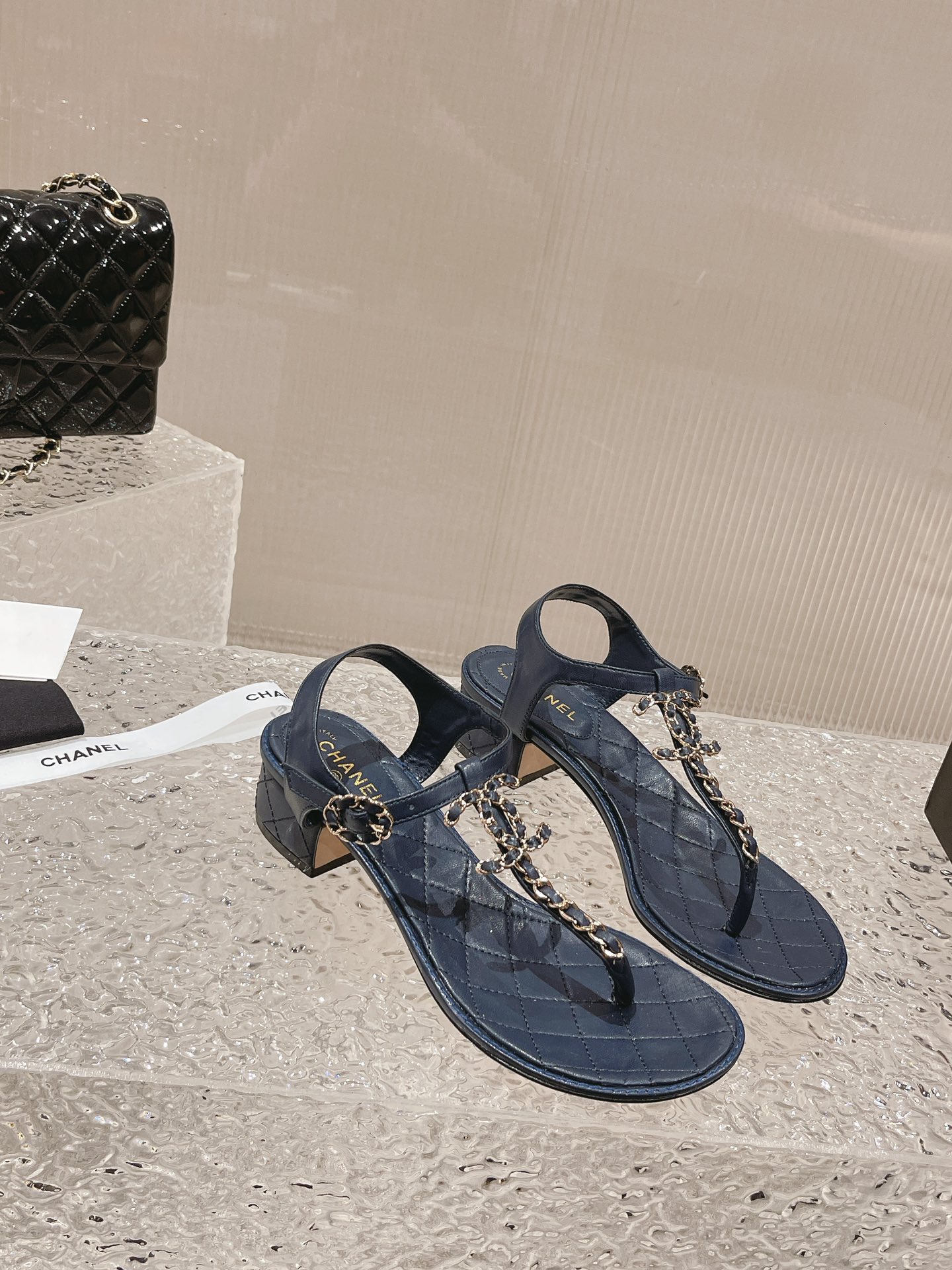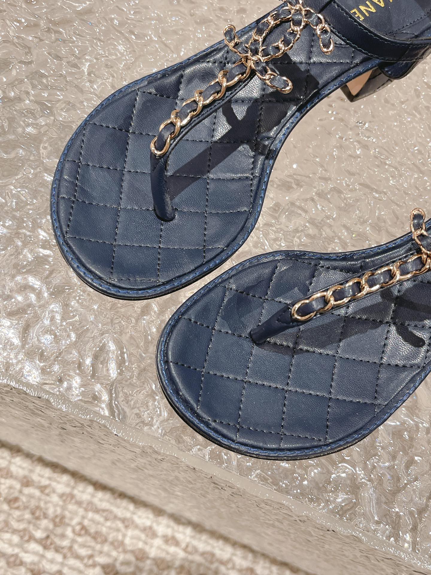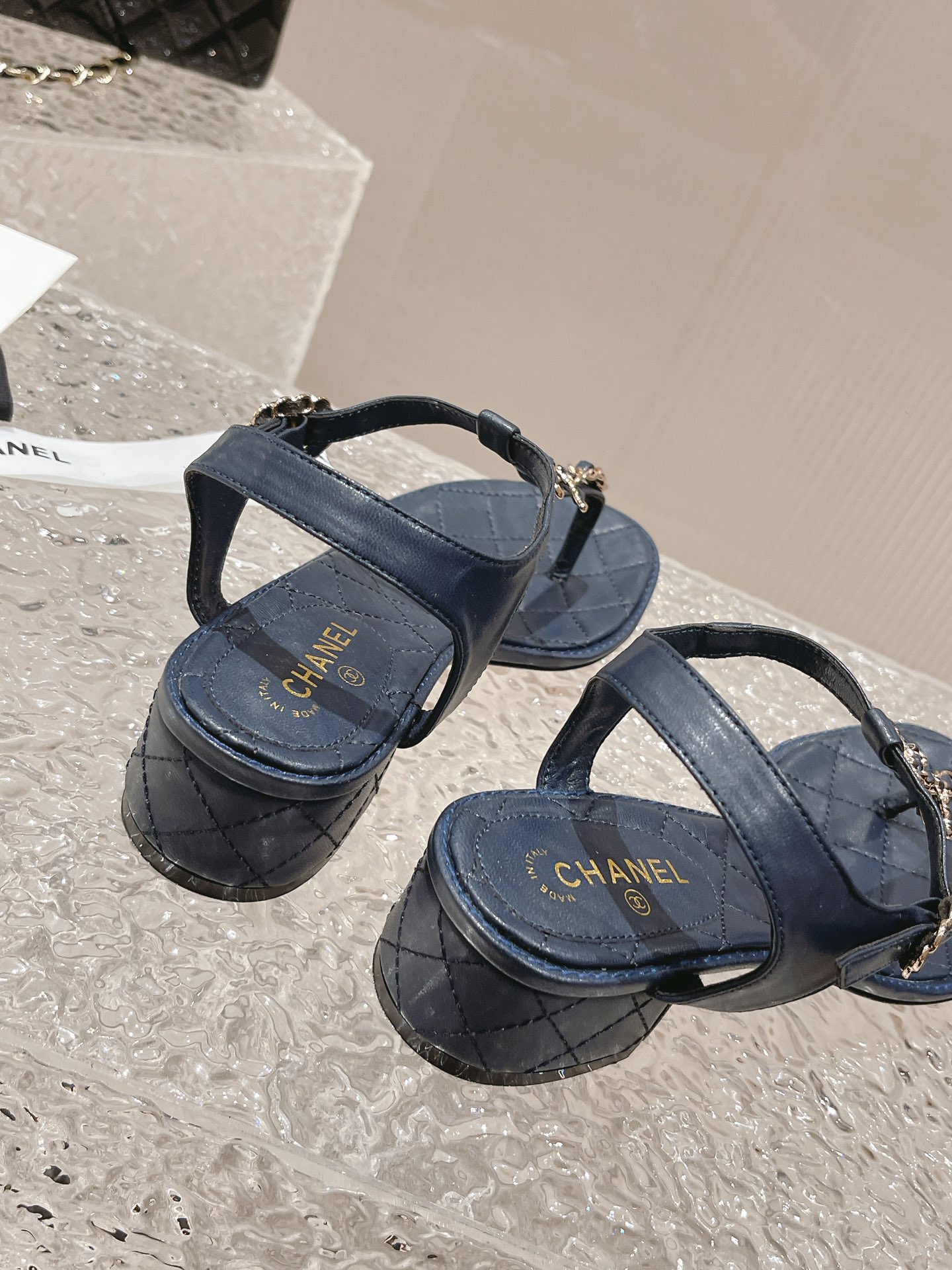 小香 春夏新幻彩珍珠扣经典夹趾凉鞋