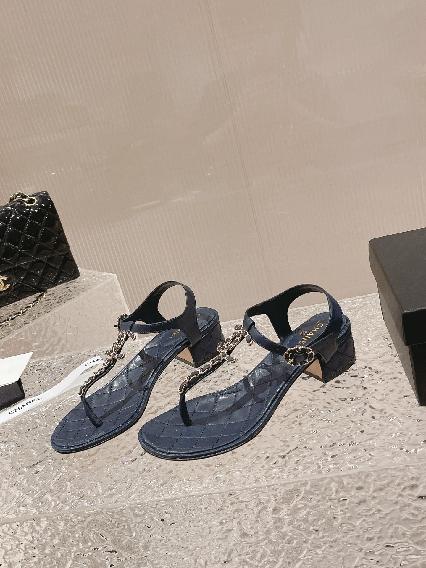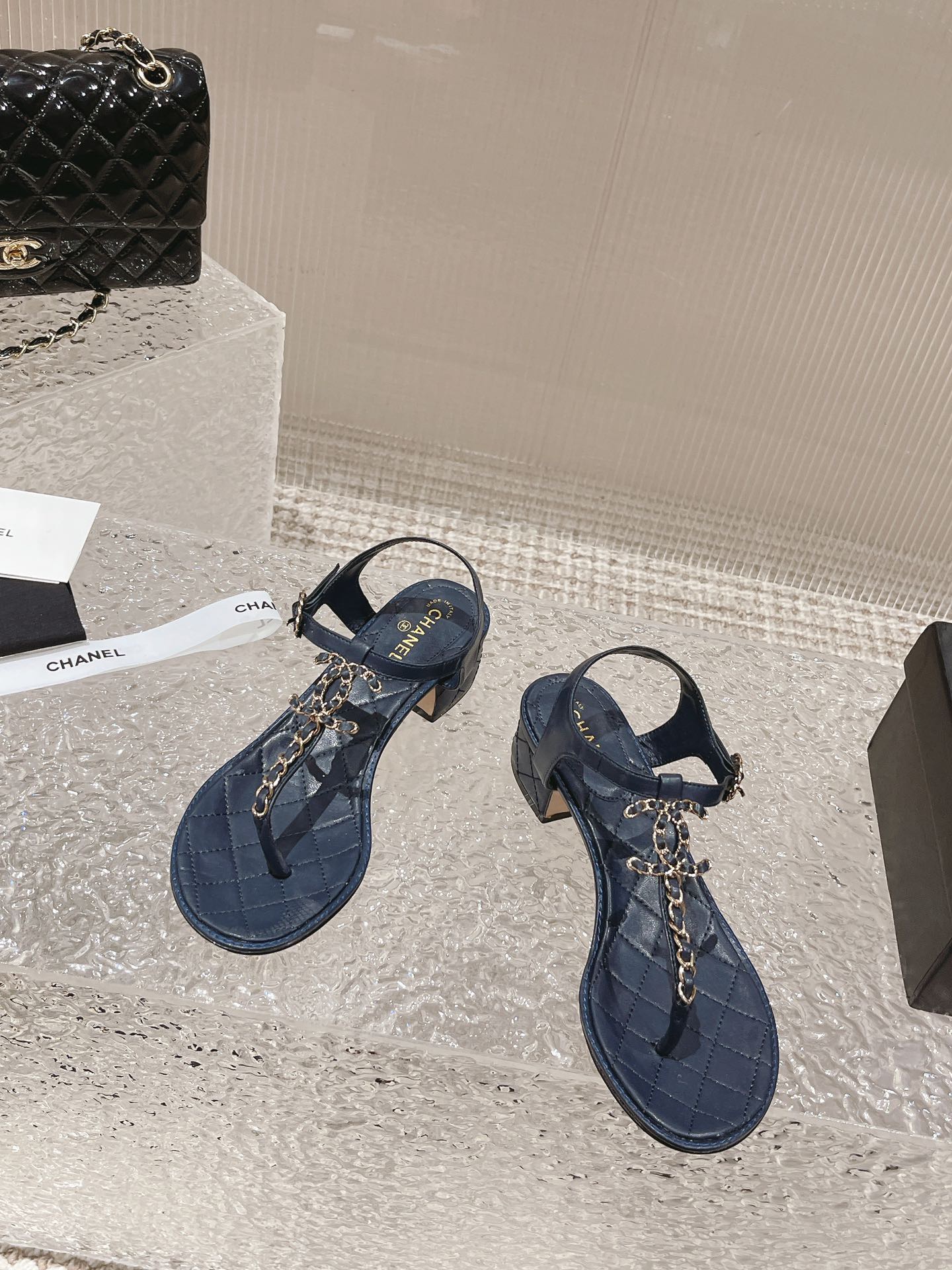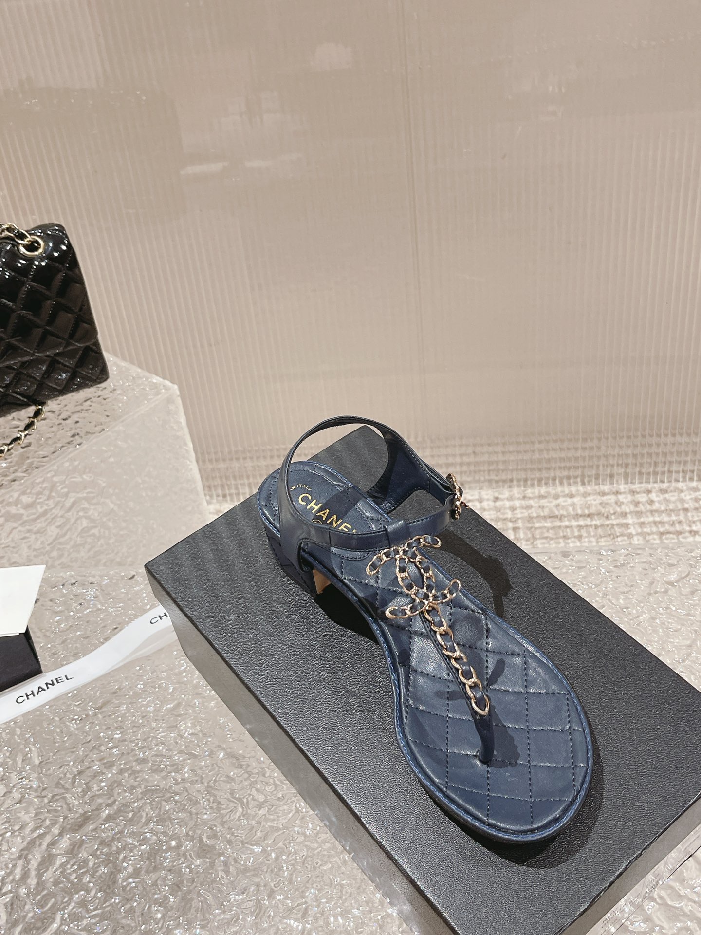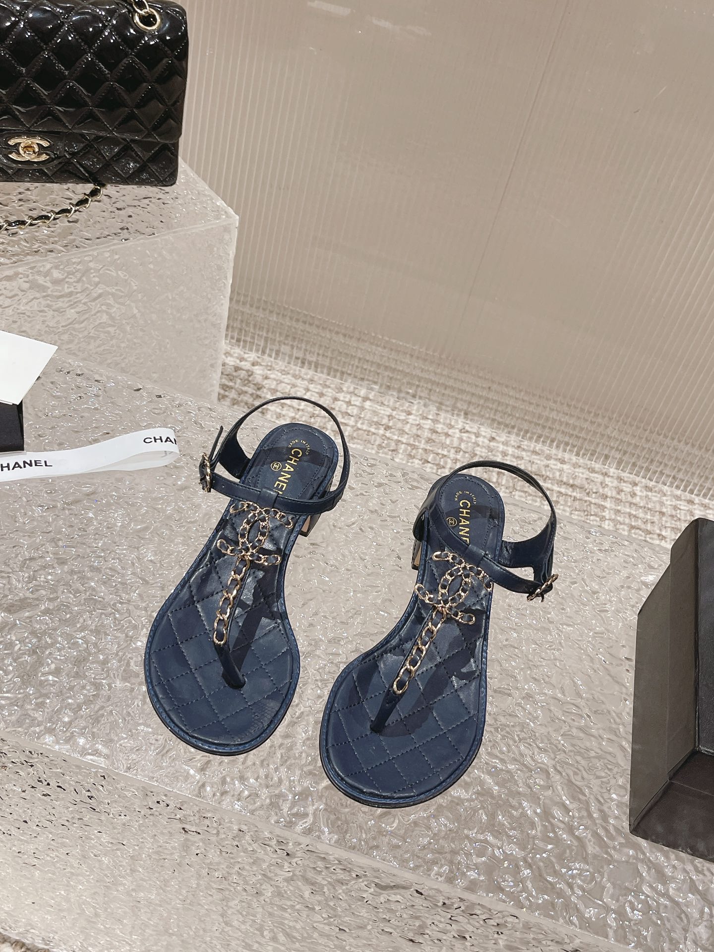 小香 春夏新幻彩珍珠扣经典夹趾凉鞋