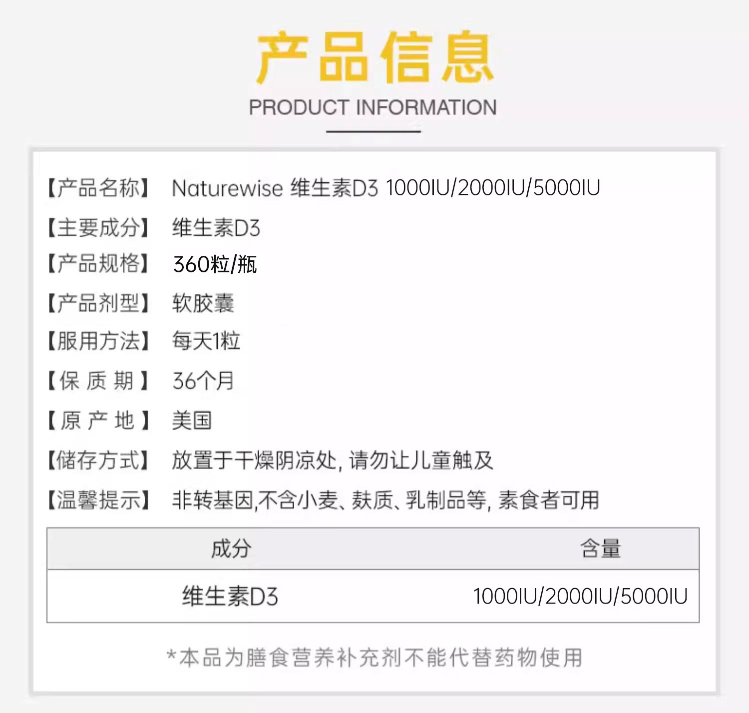 Naturewise 维生素D3(1000IU&2000IU&5000IU)360粒/瓶 活性25羟基维生素d3阳光瓶