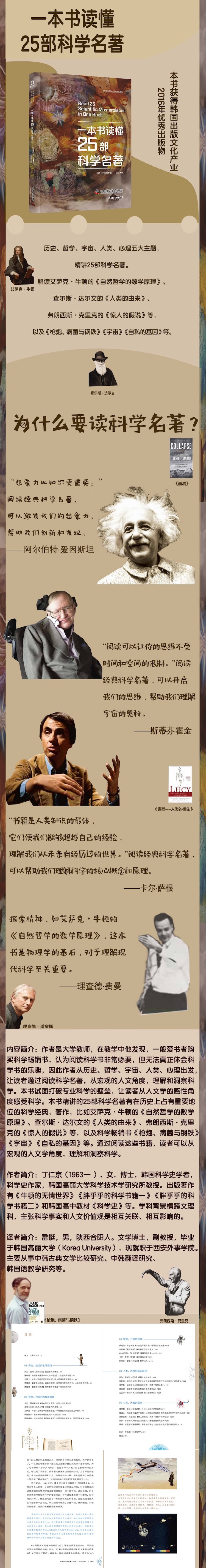 作者是大学教师,在教学中他发现,一般爱书者购买科学畅销书,认为阅读科学书非常必要,但无法真正体会科学书的乐趣,因此作者从历史、哲学、宇宙、人类、心理出发,让读者通过阅读科学名著,从宏观的人文角度,理解和洞察科学。本书试图打破专业科学的壁垒,让读者从人文学的感性角度感受科学。本书精讲的25部科学名著有在历史上占有重要地位的科学经典,著作,比如艾萨克·牛顿的《自然哲学的数学原理》、查尔斯·达尔文的《人类的由来》、弗朗西斯·克里克的《惊人的假说》等,以及科学畅销书《枪炮、病菌与钢铁》《宇宙》《自私的基因》等。通过阅读这些书籍,读者可以从宏观的人文学角度,理解和洞察科学。