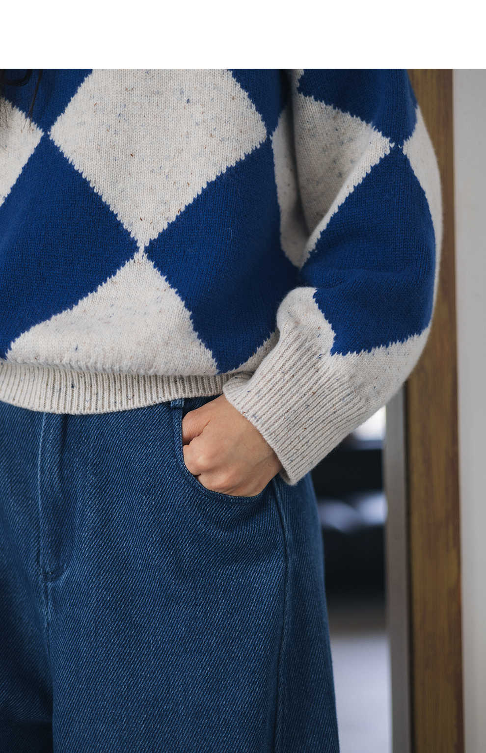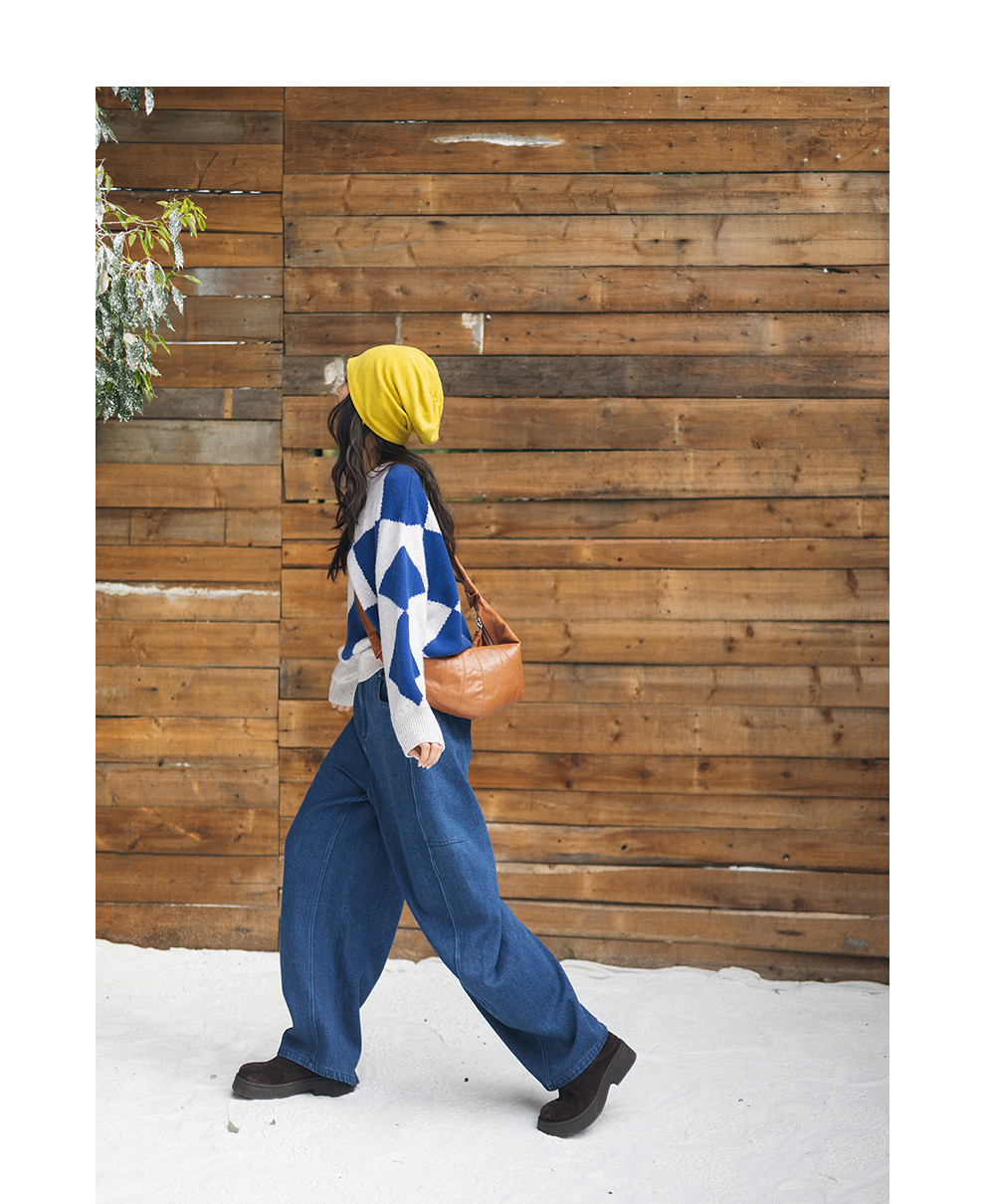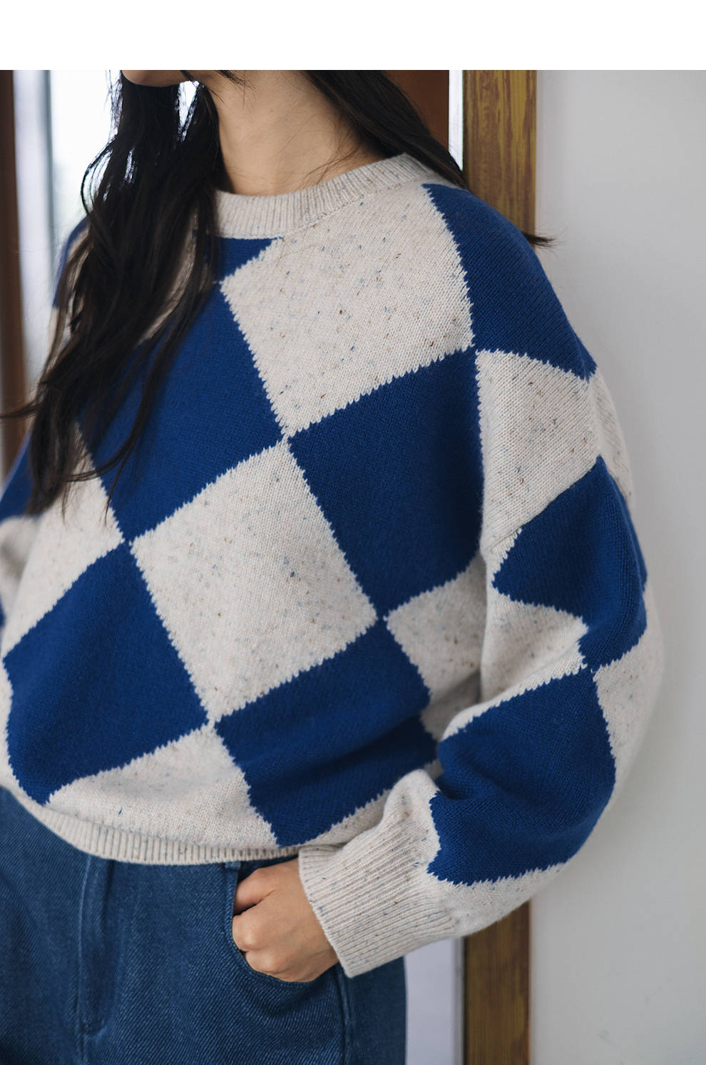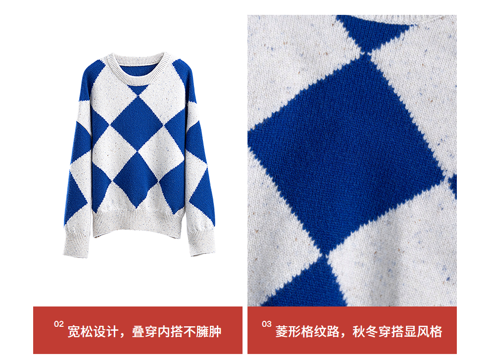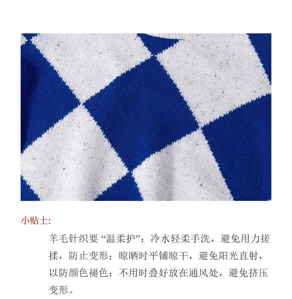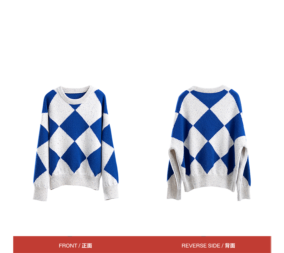 绽放857朵/蓝菱格·纯羊毛蓝白菱形格圆领宽松长袖毛衣新款羊毛衫