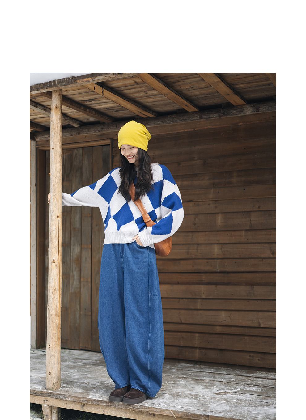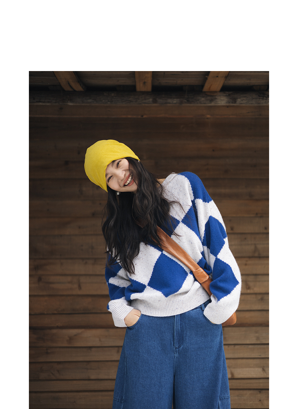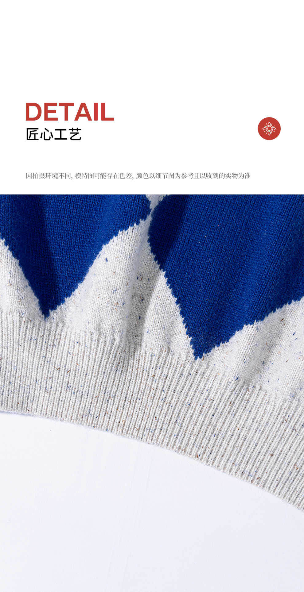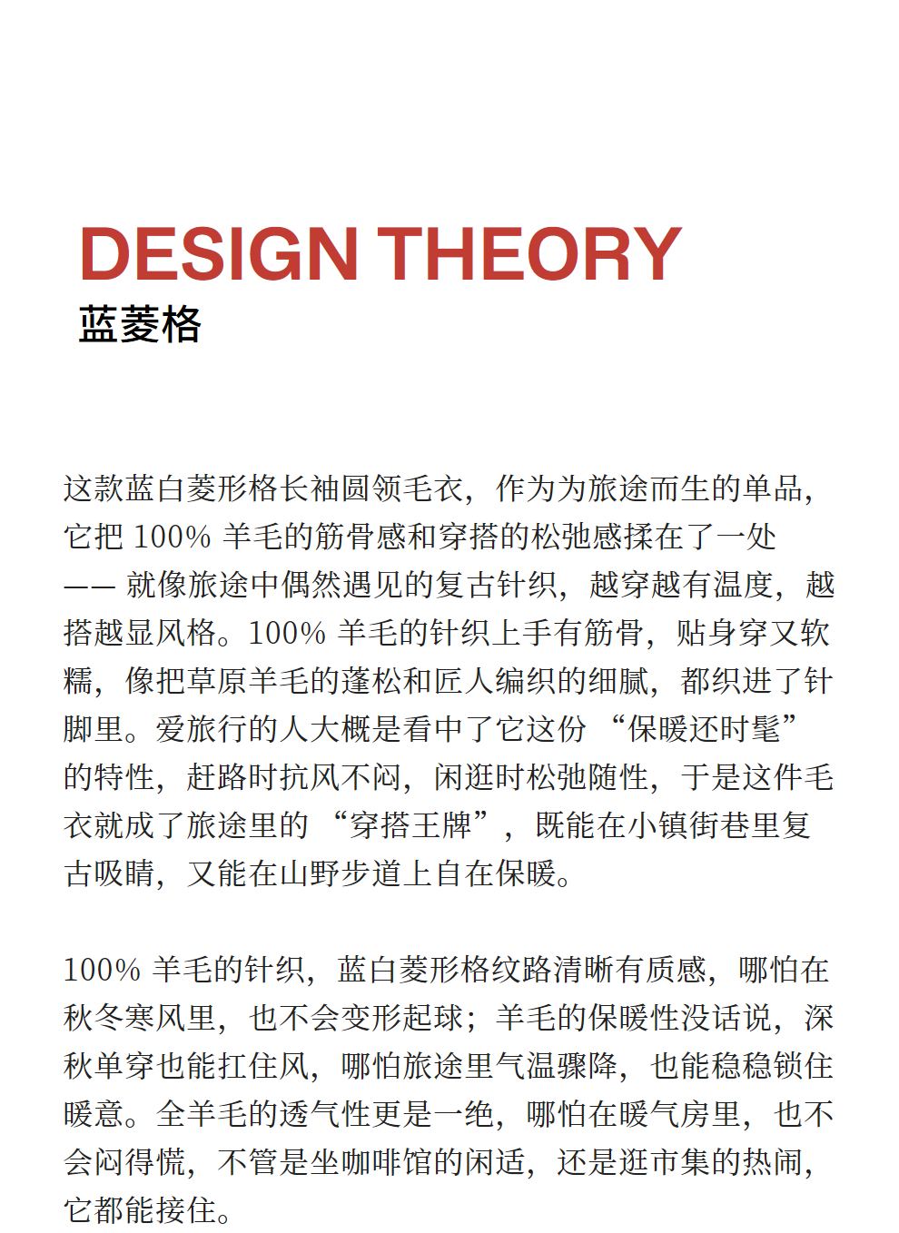 绽放857朵/蓝菱格·纯羊毛蓝白菱形格圆领宽松长袖毛衣新款羊毛衫