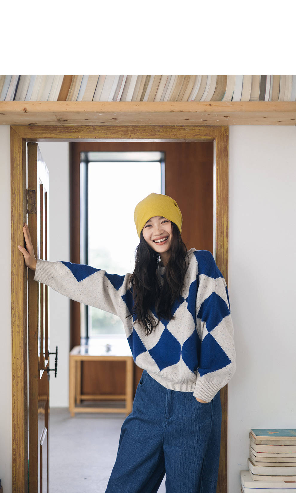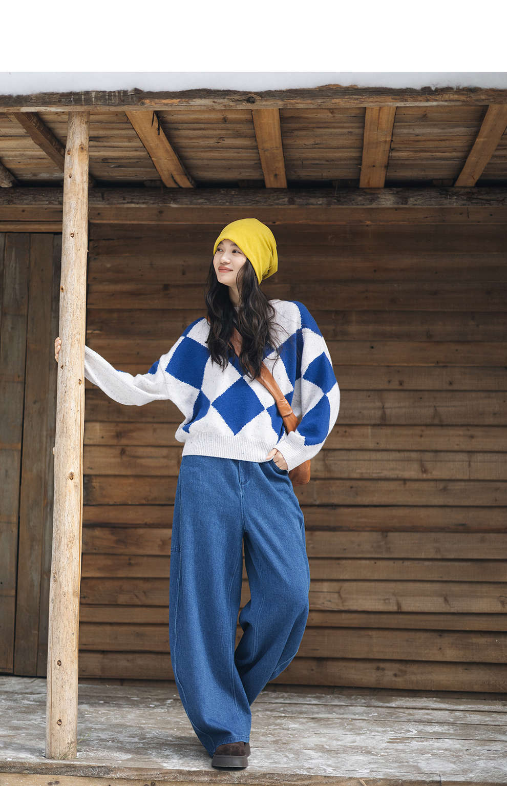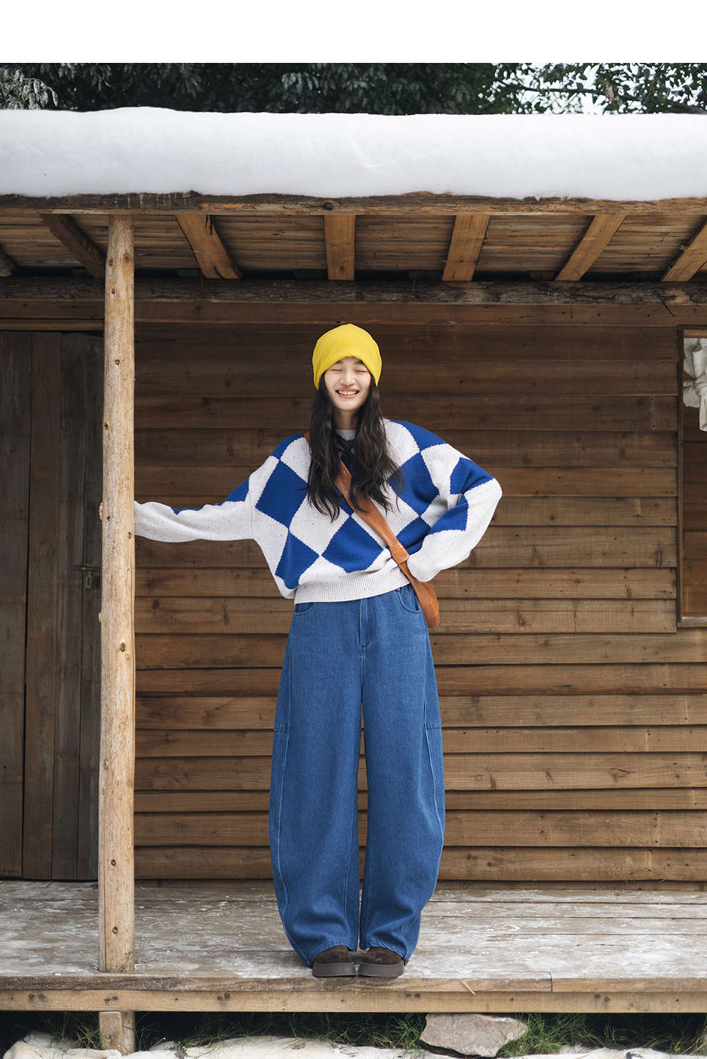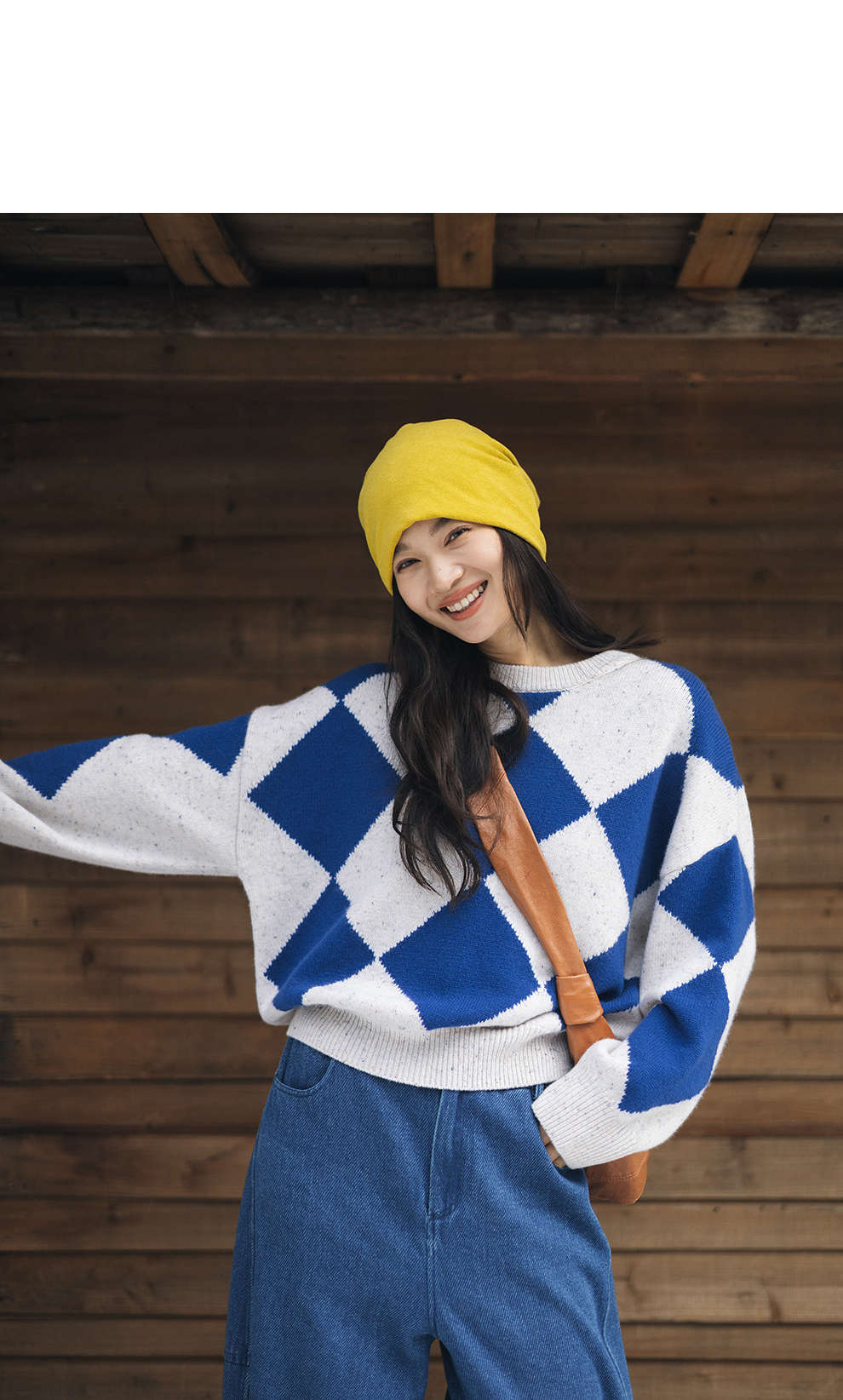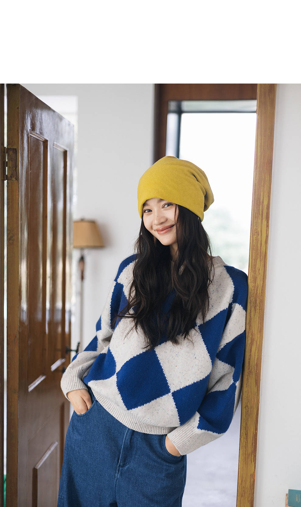 绽放857朵/蓝菱格·纯羊毛蓝白菱形格圆领宽松长袖毛衣新款羊毛衫
