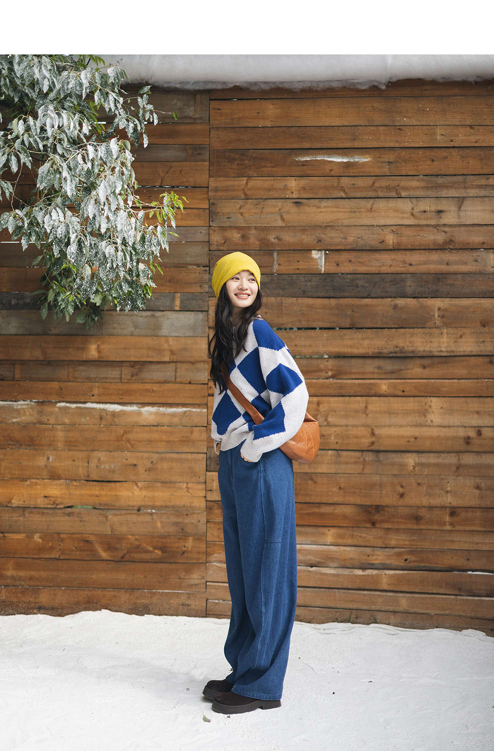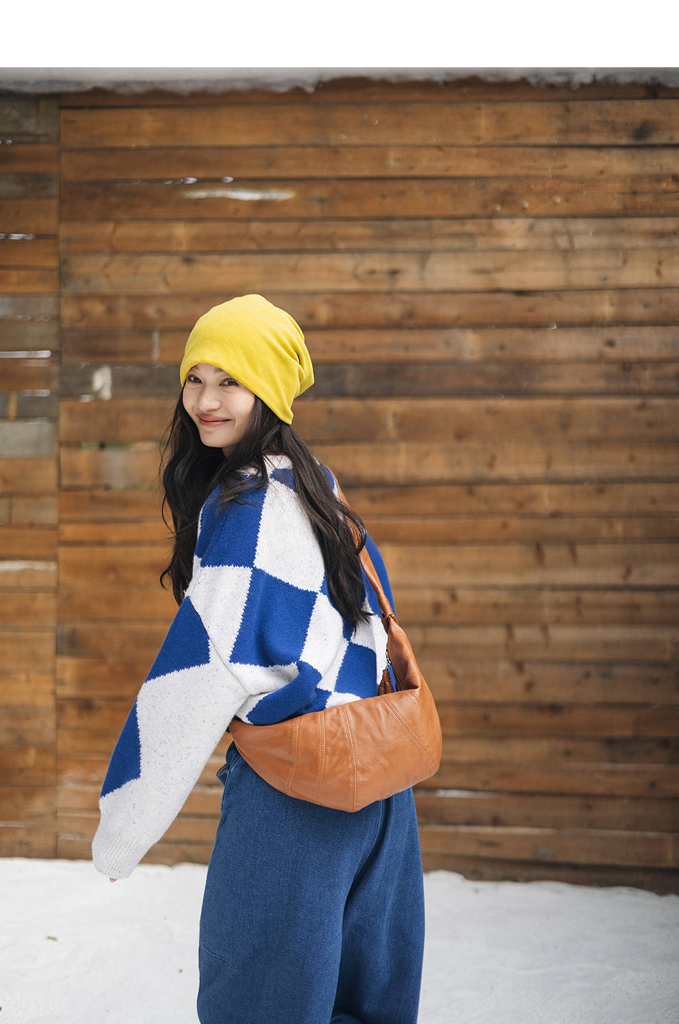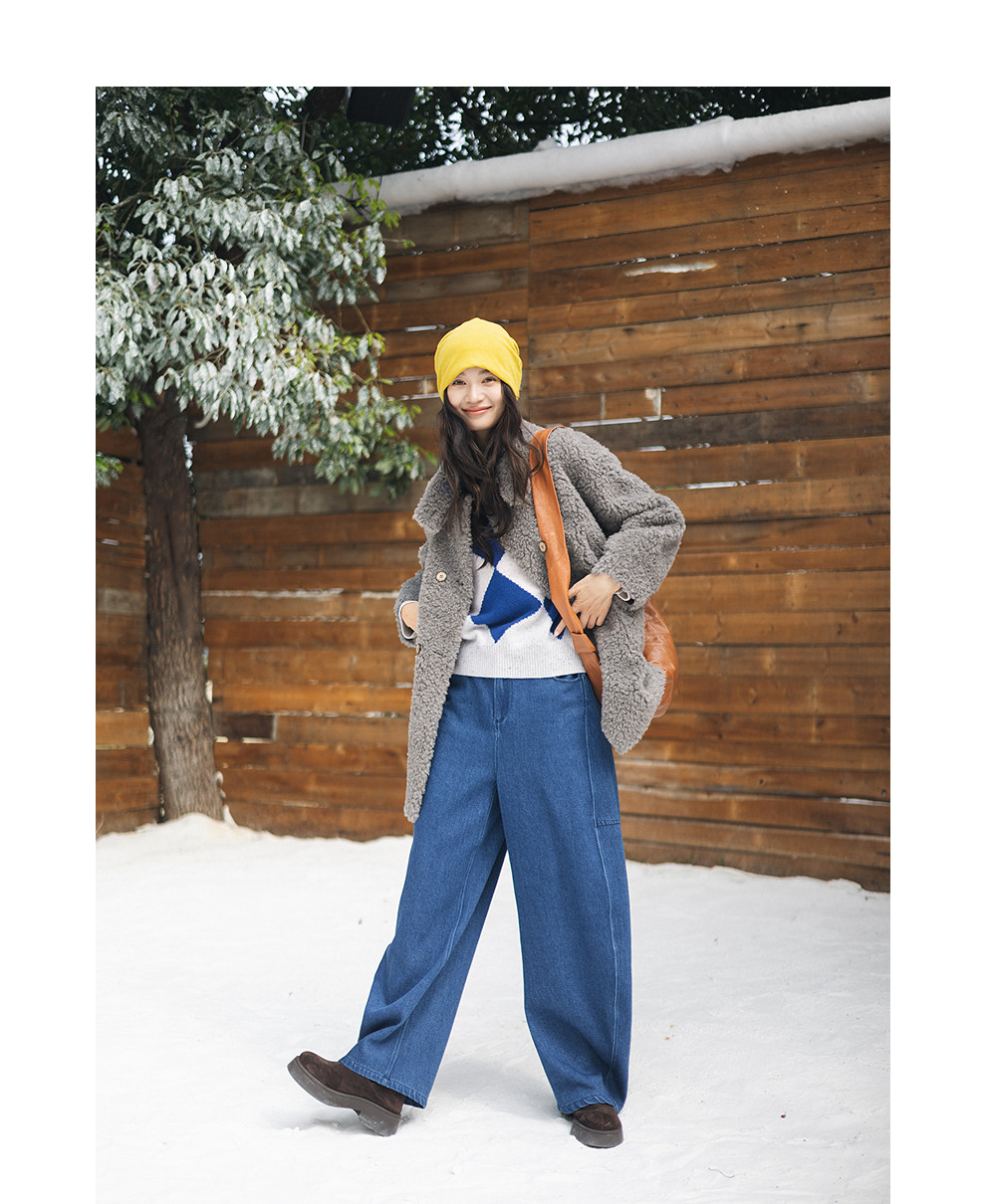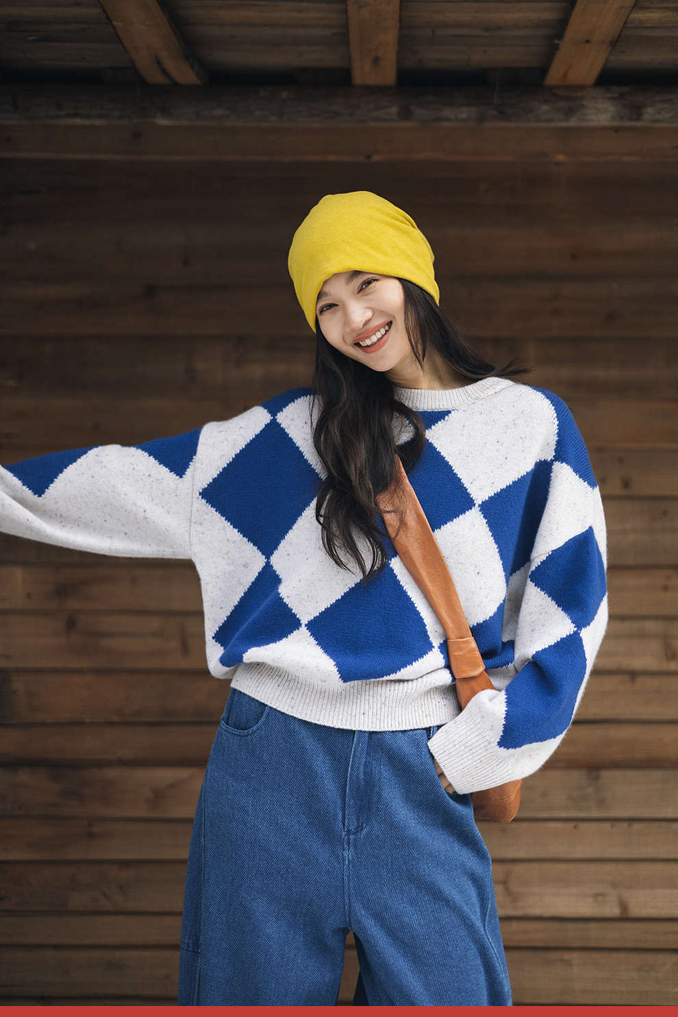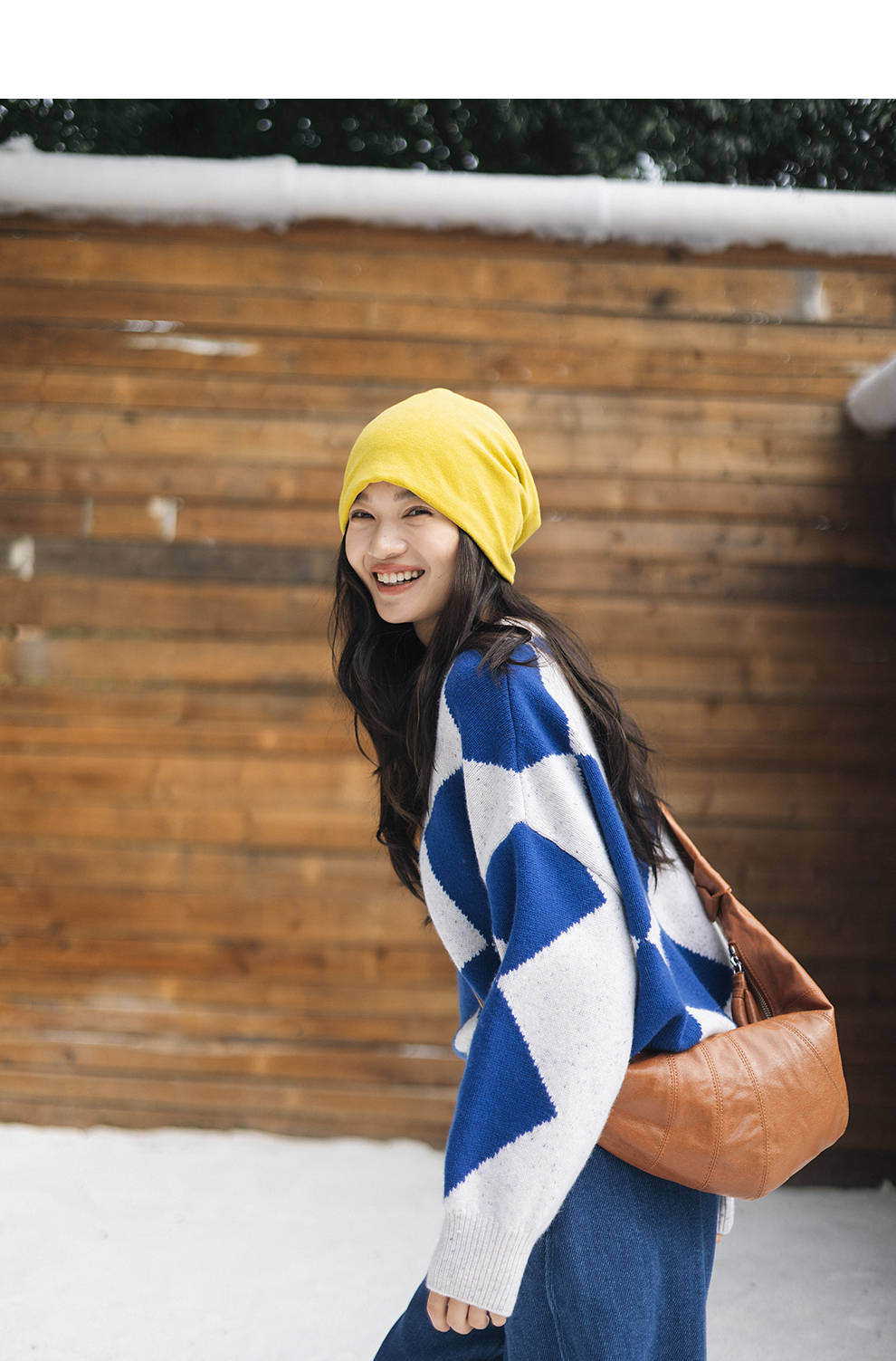 绽放857朵/蓝菱格·纯羊毛蓝白菱形格圆领宽松长袖毛衣新款羊毛衫