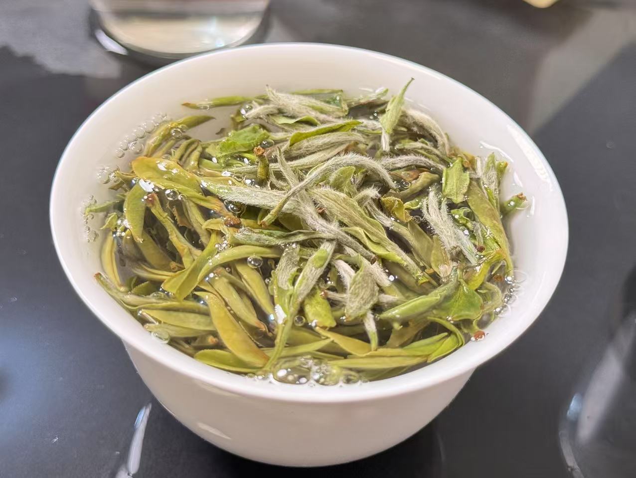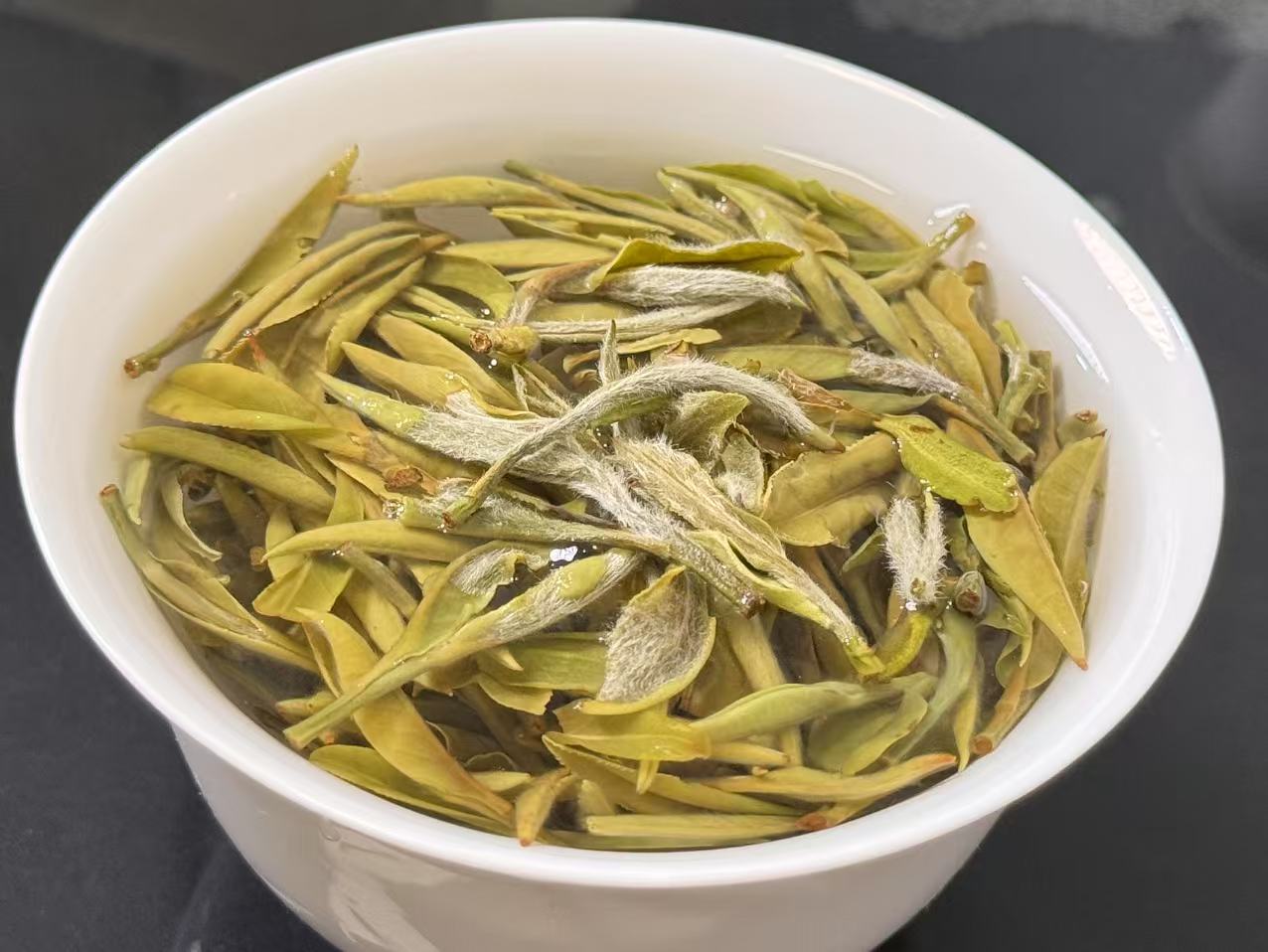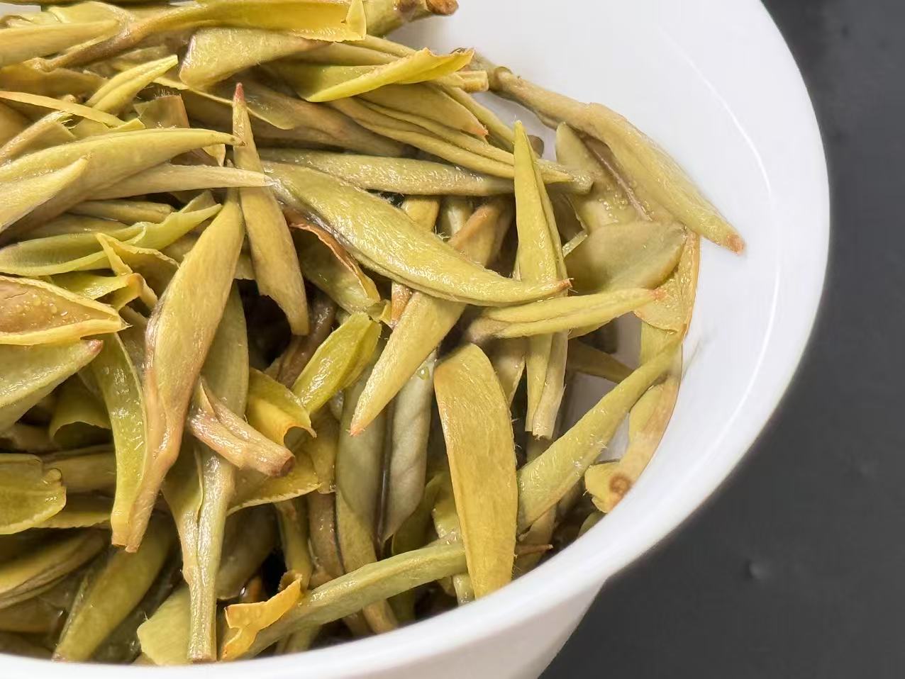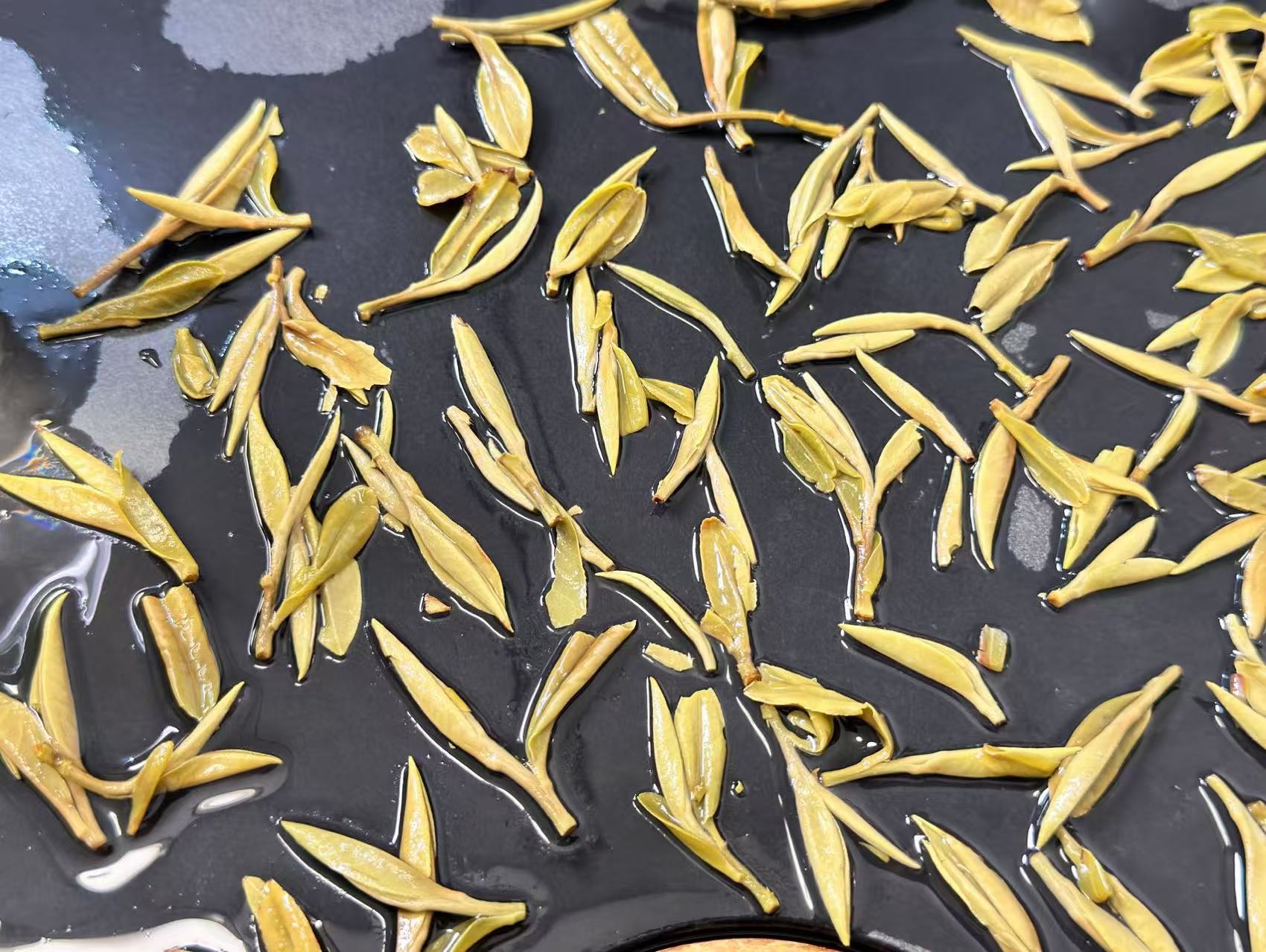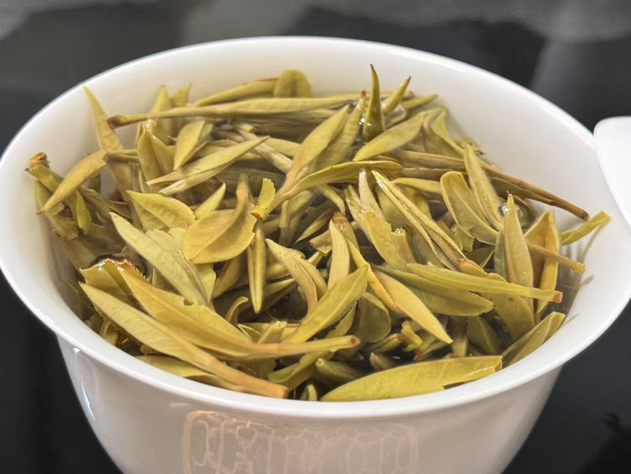 第四道:这个时候,芽头经过闷泡吸水后,已经可以看出来肥壮,也能看出来叶张很小,同时大家看成色,奶黄感均匀,不是吹牛,好原料,好工艺才能这样,很多同行是拿不出来这样的货的。这就是咱们深耕青龙山腹地的原因和结果。