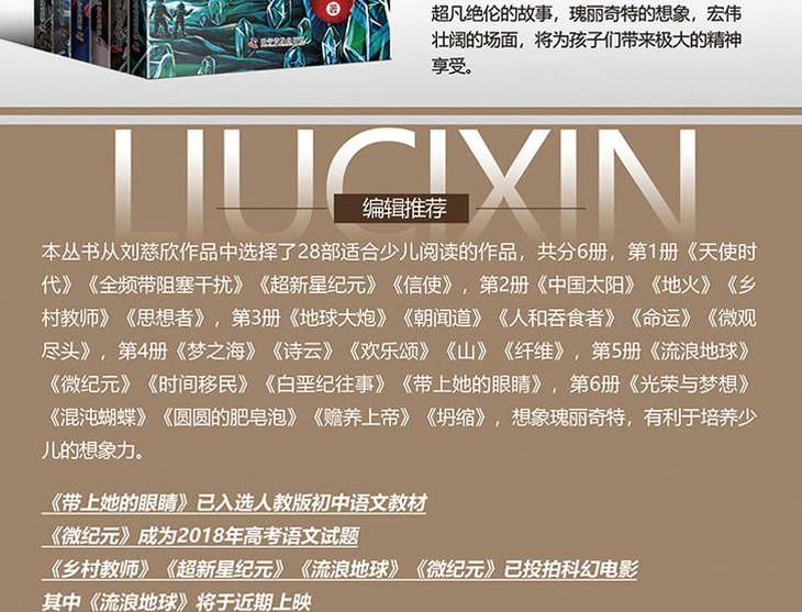 本丛书从刘慈欣作品中选择了28部适合少儿阅读的作品,共分6册,第1册《天使时代》《全频带阻塞干扰》《超新星纪元》《信使》,第2册《中国太阳》《地火》《乡村教师》《思想者》,第3册《地球大炮》《朝闻道》《人和吞食者》《命运》《微观尽头》,第4册《梦之海》《诗云》《欢乐颂》《山》《纤维》,第5册《流浪地球》《微纪元》《时间移民》《白垩纪往事》《带上她的眼睛》,第6册《光荣与梦想》《混沌蝴蝶》《圆圆的肥皂泡》《赡养上帝》《坍缩》,想象瑰丽奇特,有利于培养少儿的想象力。