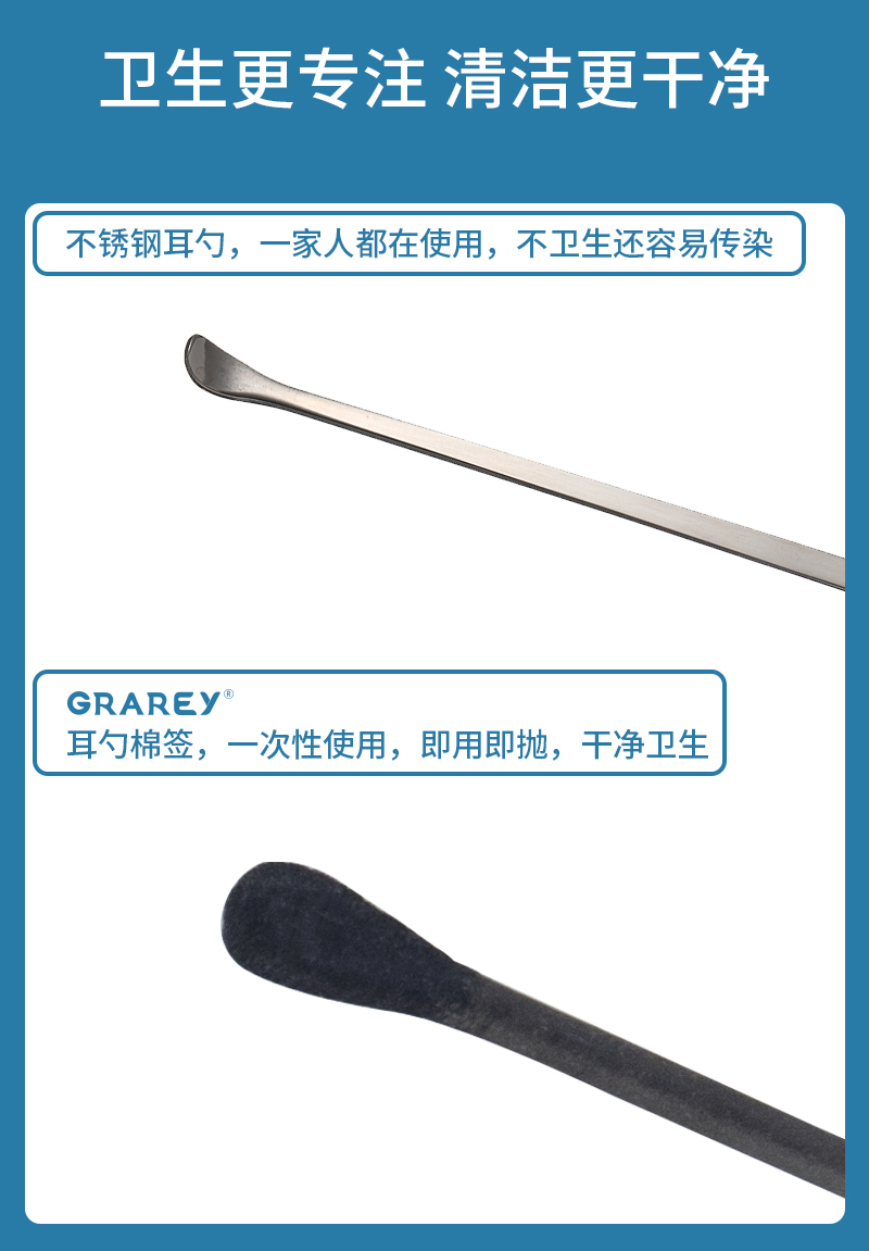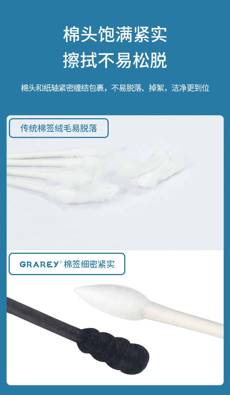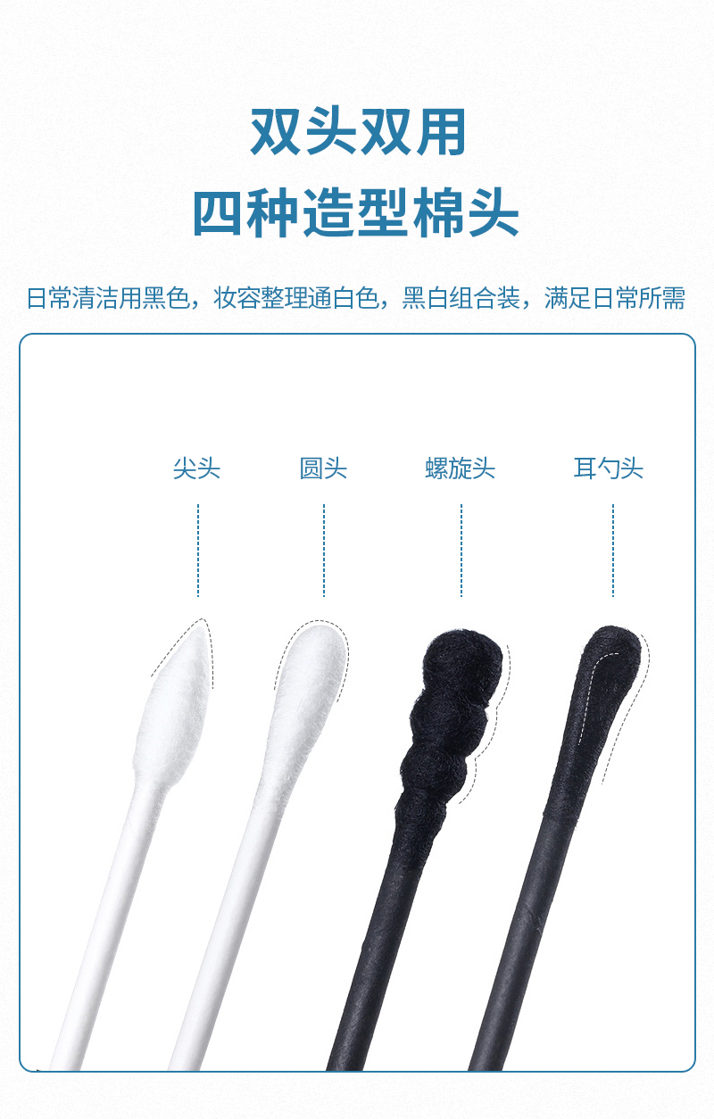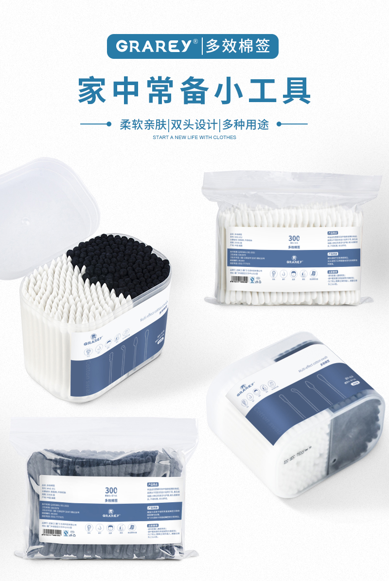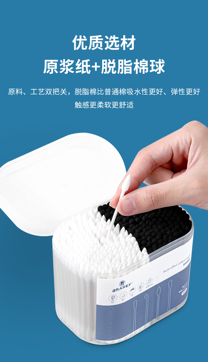GRAREY多效棉签,黑白两色,四种棉头,品质秒杀!棉签选用韧性很强的原浆纸棒,粗细均匀,光滑不扎手,拿捏顺手;棉头选用的是脱脂棉,吸水性、弹性和触感都会比普通棉更好;棉签用了双头设计,包括了白色尖头&圆头,黑色螺旋头&耳勺头四种造型,满足日常所需。尖头用作眼唇妆容补妆/卸妆/美甲修补/眼部死角清理等;圆头一般是常规用法,伤口清理、首饰/手机/键盘等污垢处理;螺旋头用于耳道残留清理,也可用于日常清洁;耳勺头顾名思义就是用来掏耳朵的,对比金属掏耳勺更柔软舒适,不易伤耳!四种棉头各有用途,一次性使用,安全卫生!