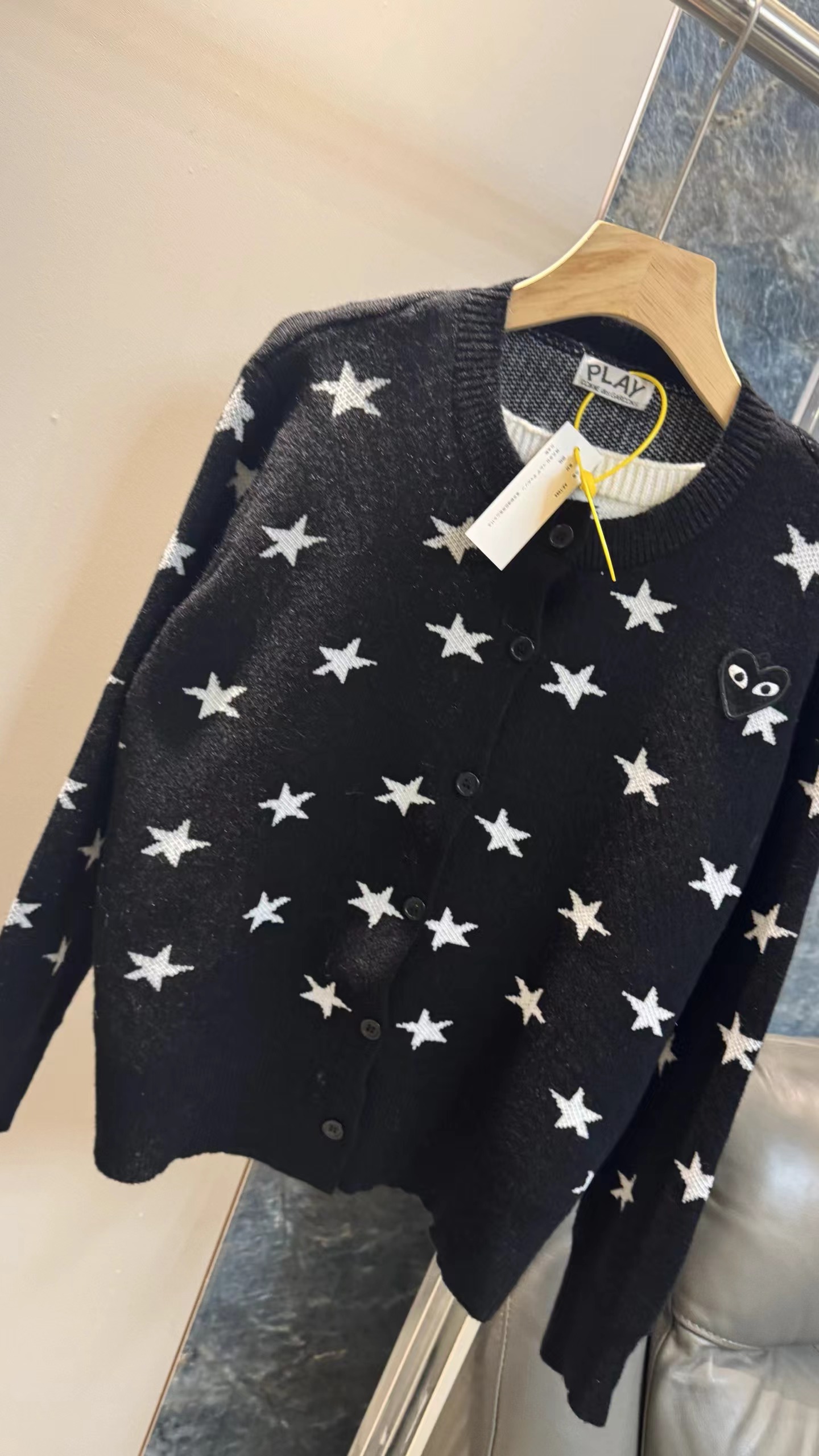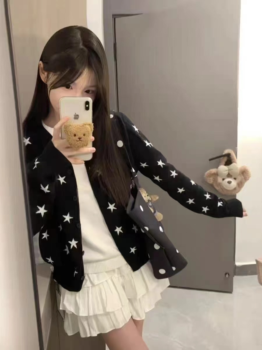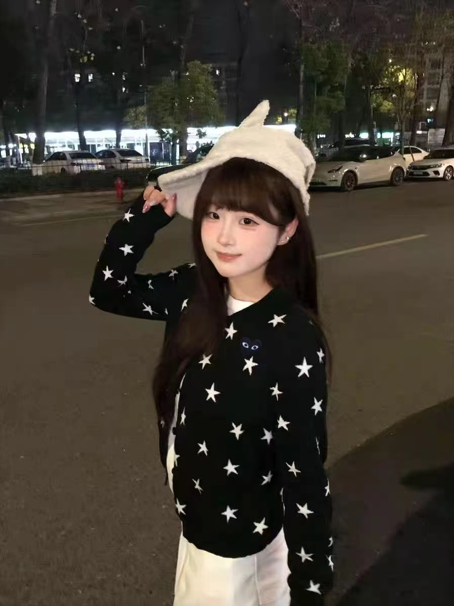 黑底白星圆领针织开衫jing典黑色底+满幅白色五角星印花,黑白对比强烈,视觉活泼又充满童趣,自带甜酷少女感。微宽松直筒版型,衣长适中,不挑身材,能轻松营造随性休闲的氛围。小圆领设计,简约利落,可露出内搭领口,增加穿搭层次感。细腻针织面料,纹理轻薄柔软,透气亲肤,适合春秋季节叠穿或单穿。单排黑色圆形纽扣,与衣身同色,低调简约,保持整体图案的完整性。左胸位置标志性黑色爱心刺绣,爱心内带眼睛图案,是jing典设计标识,在满版星星中增添了jing致细节与辨识度长袖设计,袖口微收,贴合手腕,既保暖又避免袖口拖沓。甜酷少女风、日系休闲风、复古童趣风,适配日常出街、约会、校园等场景。
