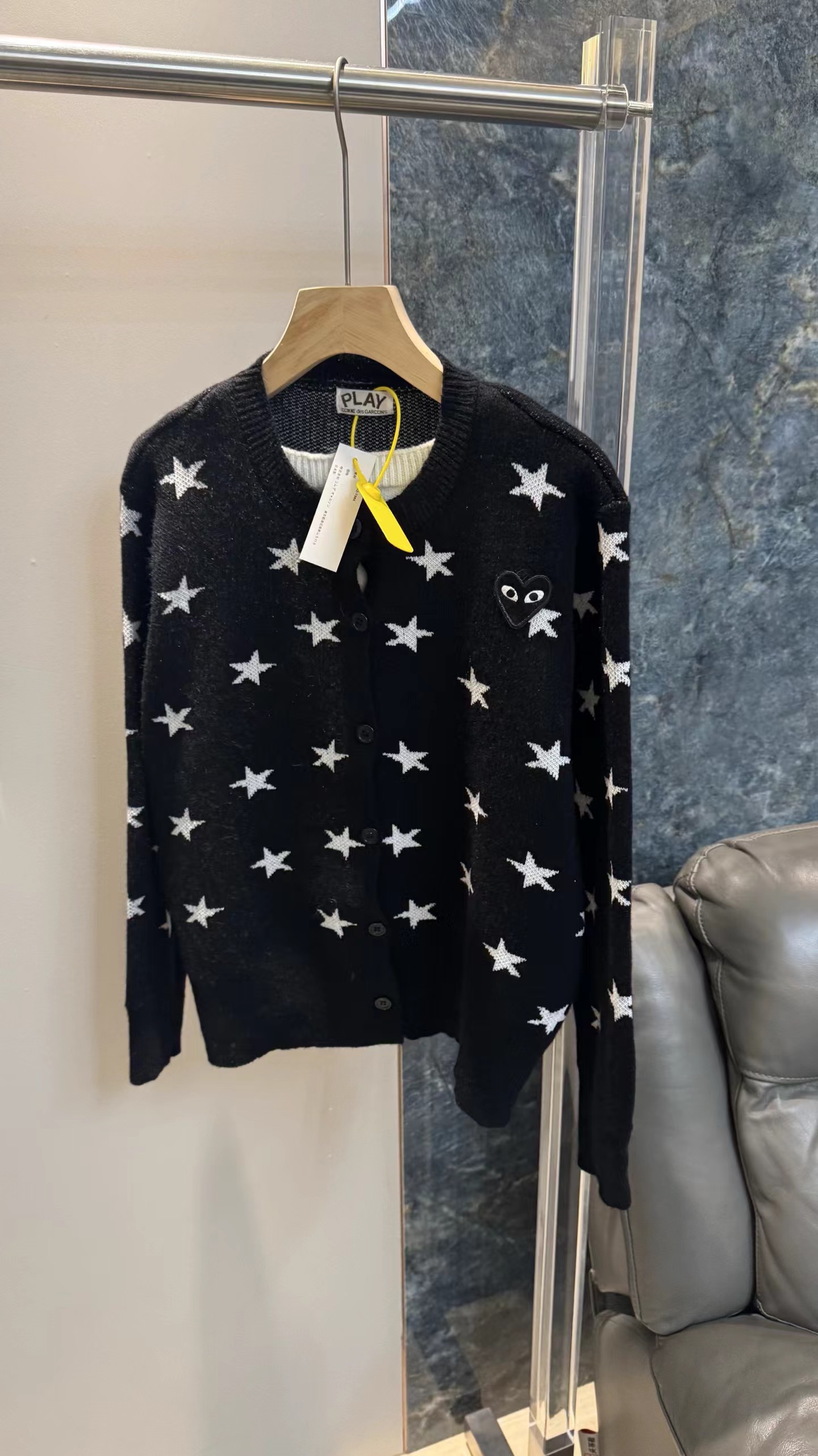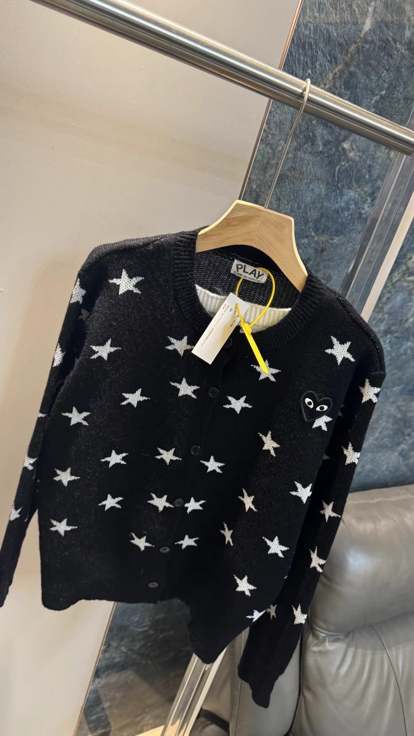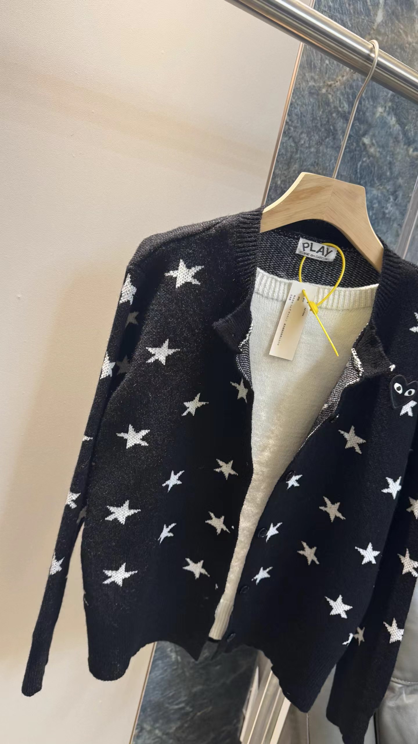 黑底白星圆领针织开衫jing典黑色底+满幅白色五角星印花,黑白对比强烈,视觉活泼又充满童趣,自带甜酷少女感。微宽松直筒版型,衣长适中,不挑身材,能轻松营造随性休闲的氛围。小圆领设计,简约利落,可露出内搭领口,增加穿搭层次感。细腻针织面料,纹理轻薄柔软,透气亲肤,适合春秋季节叠穿或单穿。单排黑色圆形纽扣,与衣身同色,低调简约,保持整体图案的完整性。左胸位置标志性黑色爱心刺绣,爱心内带眼睛图案,是jing典设计标识,在满版星星中增添了jing致细节与辨识度长袖设计,袖口微收,贴合手腕,既保暖又避免袖口拖沓。甜酷少女风、日系休闲风、复古童趣风,适配日常出街、约会、校园等场景。