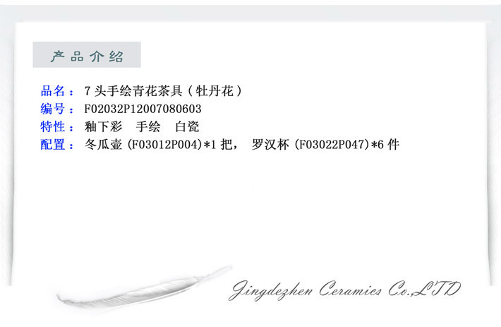 景德镇陶瓷 国瓷红叶 7头手绘青花茶具(牡丹花)