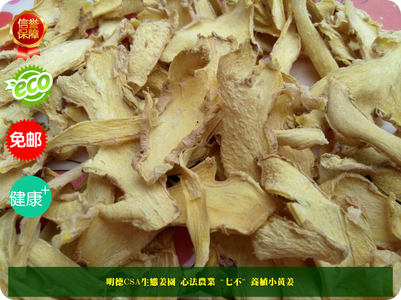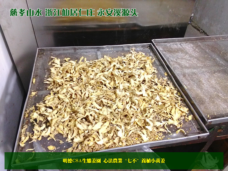 明德CSA生态姜园心法农业最好的鲜姜发客户和制作干姜片和姜粉。次等的残缺的鲜姜用来做姜素。“七不”小黄姜生姜洗净,不去皮,切掉坏的,以榨汁机榨取生姜汁。待其沉淀2小时后,倒出姜汁,取底层白色粉状沉淀物晒干(约需一天),初姜素再次清水溶解过滤沉淀得第二遍姜素。再置入不锈钢锅中,以小火慢炒,边炒边将细碎片块状的生姜素捣碎,约15分钟,色转米黄,即可起锅,经磨粉后,即制成生姜素。