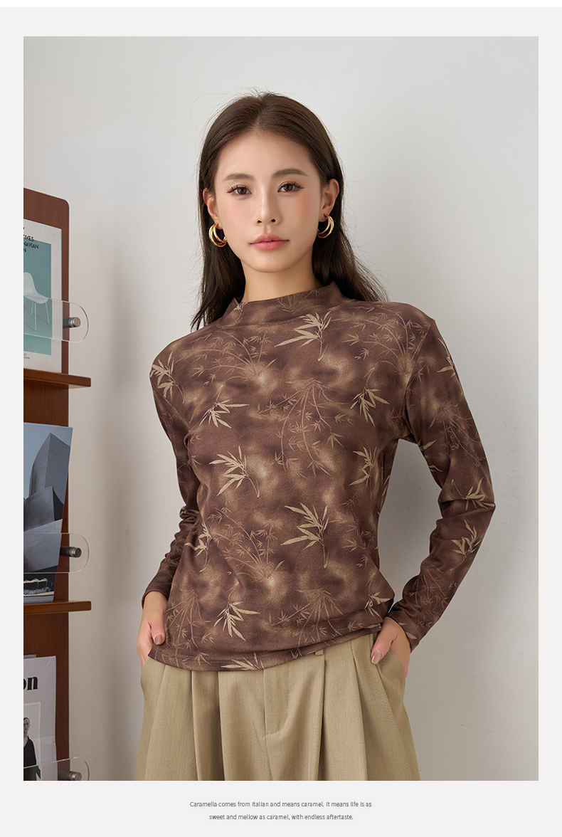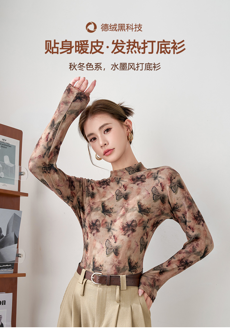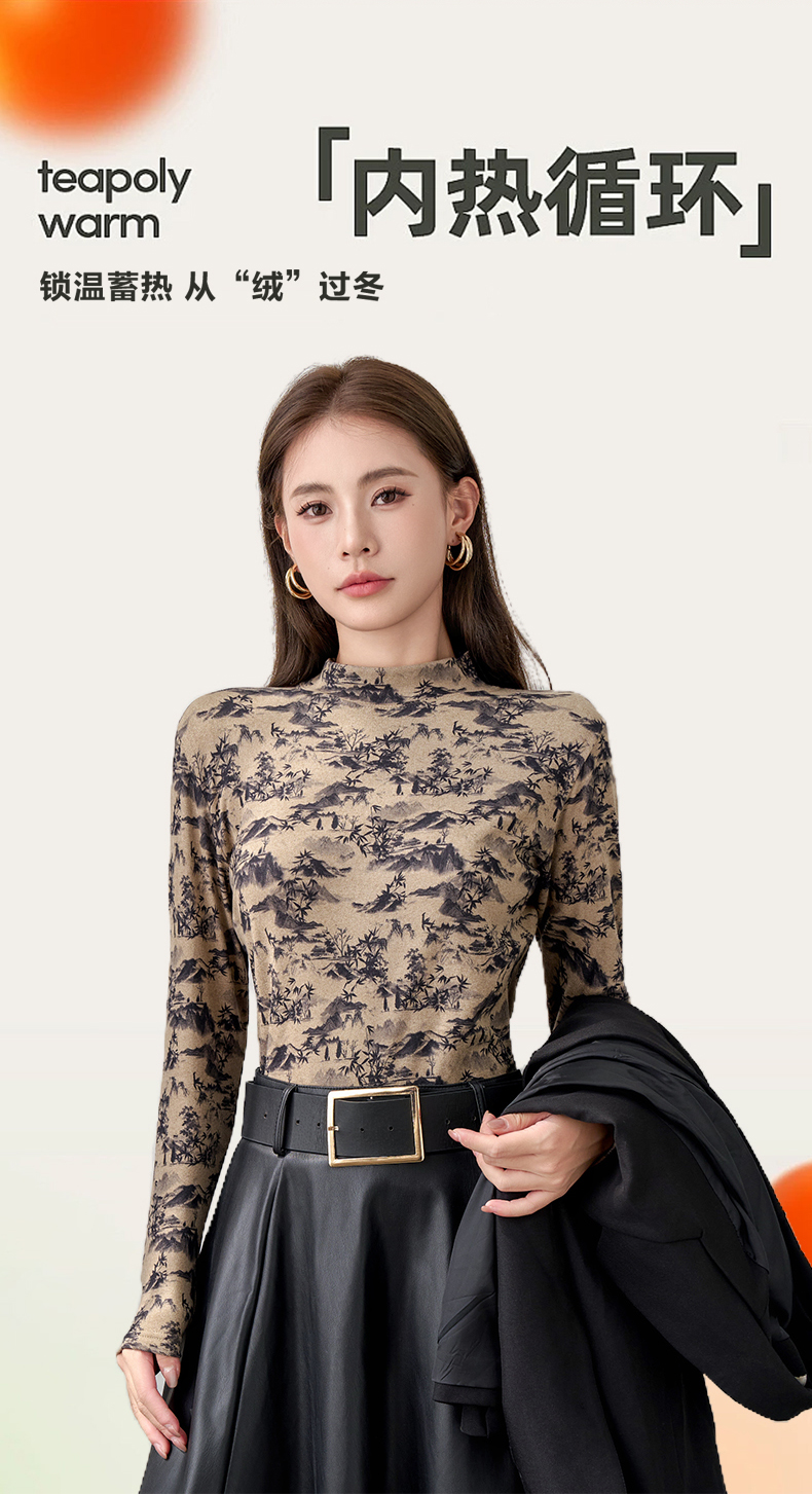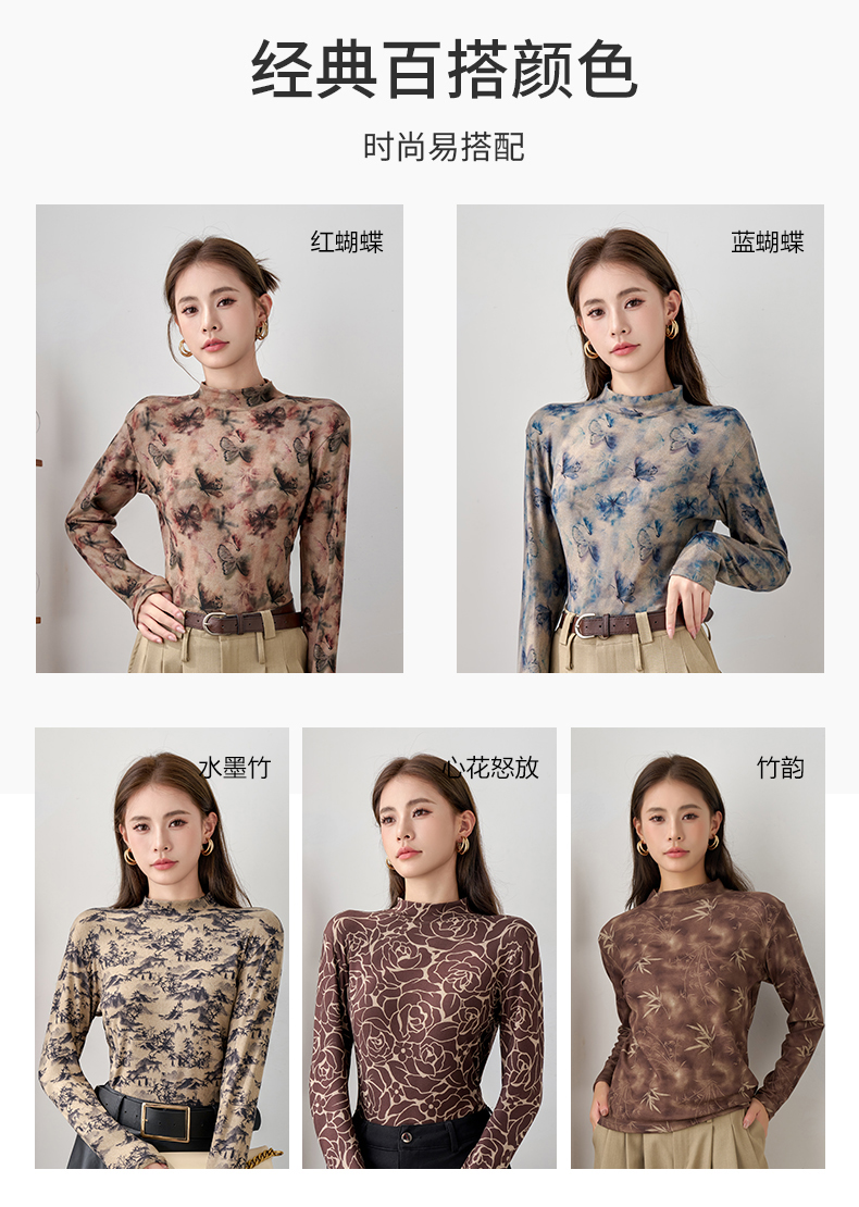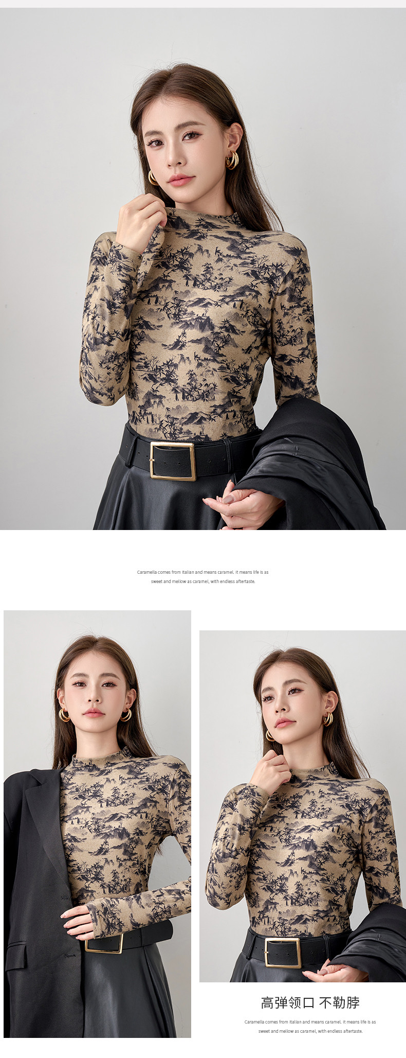 水墨风印花新中式打底衫百搭女士秋季薄款修身柔软优雅