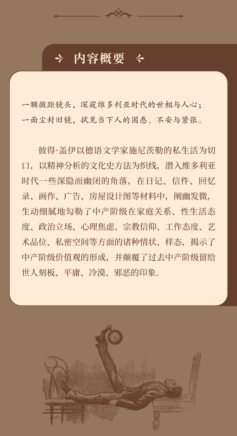 彼得盖伊以德语文学家施尼茨勒的私生活为切口,以精神分析的文化史方法为织线,潜入维多利亚时代一些深隐而幽闭的角落,在日记、信件、回忆录、画作、广告、房屋设计图等材料中,阐幽发微,生动细腻地勾勒了中产阶级在家庭关系、性生活态度、政治立场、心理焦虑、宗教信仰、工作态度、艺术品位、私密空间等方面的诸种情状、样态,揭示了中产阶级价值观的形成,并颠覆了过去中产阶级留给世人刻板、平庸、冷漠、邪恶的印象。