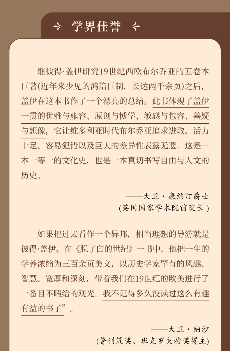 如果把过去看作一个异邦,最好的导游就是彼得盖伊。在《脱了臼的世纪》一书中,他把一生的学养浓缩为三百余页美文,以历史学家罕有的风趣、智慧、宽厚和深刻,带着我们在19世纪的欧美进行了一番目不暇给的观光。真是趣味横生,获益匪浅,历年少见。