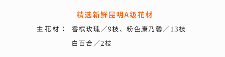 香槟玫瑰9枝、多头白百合2枝、粉色康乃馨13枝