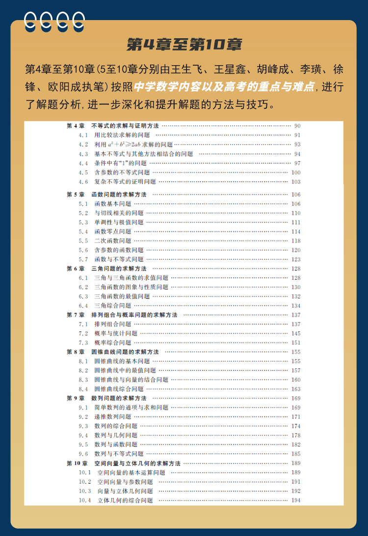 本书紧扣中学数学课程标准和当前中学生数学学习的实际需求,以解题方法为统领,分10章论述了在中学数学中如何解题的问题。第1章是数学问题与数学解题概论,主要讲述什么是数学问题、数学问题的分类、数学解题的步骤、程序及其信息过程,从宏观上阐明如何解题,并通过典型实例进行了分析和说明。第2章讲述数学解题的核心方法——化归法,将数学思想方法进行了分类提炼,重点通过典型实例讲明了什么是化归以及化归的策略,分析了化归法中一般与特殊的关系、分解与组合的关系,以及如何处理好归纳与联想的关系。第3章是数学解题的具体方法,包括分析法与综合法,直接法与间接法,归纳法与演绎法,以及数学归纳法、RMI法、换元法、参数法、待定系数法、构造法、递推法、赋值法、主元法、面积法和检验法,并以各种数学方法为线索,通过典型的实例分析,来引导读者解题。第4章至第10章(5至10章分别由王生飞、王星鑫、胡峰成、李璜、徐锋、欧阳成执笔)按照中学数学内容以及高考的重点与难点,进行了解题分析,进一步深化和提升解题的方法与技巧。附录1是每章的配套习题,附录2是对应习题的参考答案。书中的每道例题或习题的解题过程由三部分组成:分析(理清解题思路)、解答(规范的求解过程)和说明(问题的拓展或总结)。本书可作为学科教学(数学)专业的硕士研究生(重点学习1—3章)和数学(师范)专业的大学生(重点学习3—10章)的学习用书、高中生(重点学习4—10章)的高考复习用书和中学数学教师的教学参考书。