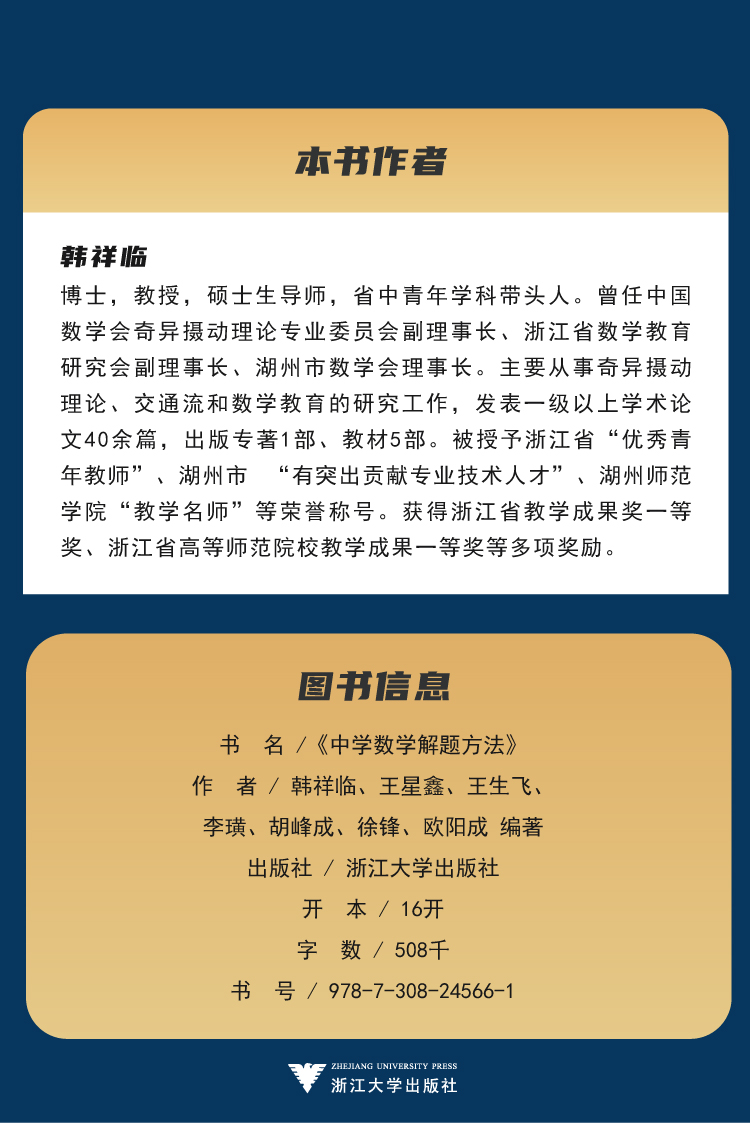 韩祥临,博士,教授,硕士生导师,省中青年学科带头人。曾任中国数学会奇异摄动理论专业委员会副理事长、浙江省数学教育研究会副理事长、湖州市数学会理事长。主要从事奇异摄动理论、交通流和数学教育的研究工作,发表一级以上学术论文40余篇,出版专著1部、教材5部。被授予浙江省“优秀青年教师”、湖州市 “有突出贡献专业技术人才”、湖州师范学院“教学名师”等荣誉称号。获得浙江省教学成果奖一等奖、浙江省高等师范院校教学成果一等奖等多项奖励。