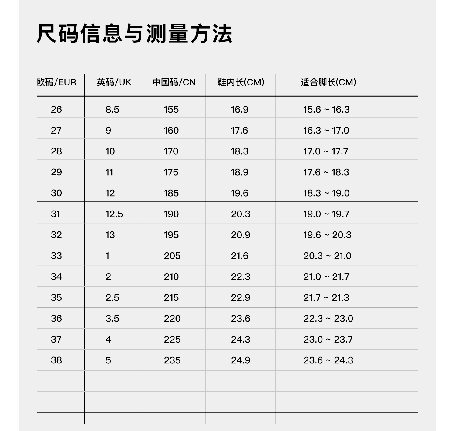 2、鞋内标签:UK对应尺码表的英码,EUR对应尺码表的欧码,CN为中国尺码,因宝宝脚丫胖瘦高矮不一,不建议参考中国尺码选择,且CN不在尺码表呈现。(可参考尺码表适合脚长的范围进行选择)