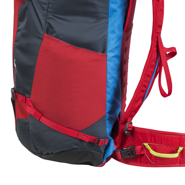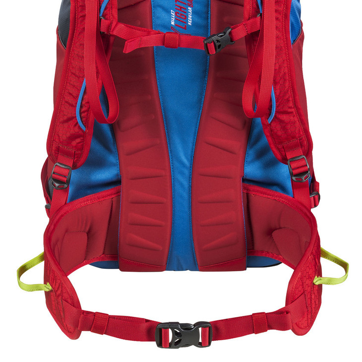 在高山上,每一克重量都是宝贵的,因此背包设计非常简洁,同时并没有缩减它的功能:冰镐,绳索,滑雪板,露营袋等等设计了专门的放置位置。同时,大开口拉链,良好的背负系统也保证了它的实用性。