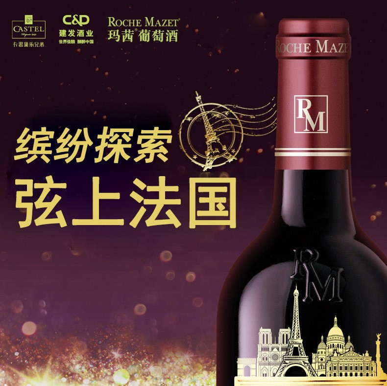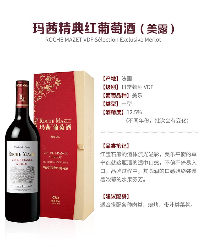建发酒业 12.5度法国进口红酒 卡思黛乐castel玛茜精典红葡萄酒(美露)礼盒 750ml 单支