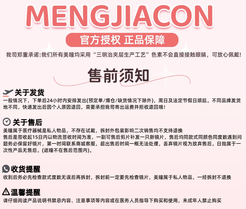 2.美瞳属干第三类医疗器械,请仔细阅读产品说明书或在医务人员的指导下购买使用哦!禁忌内容或注意事项详见说明书