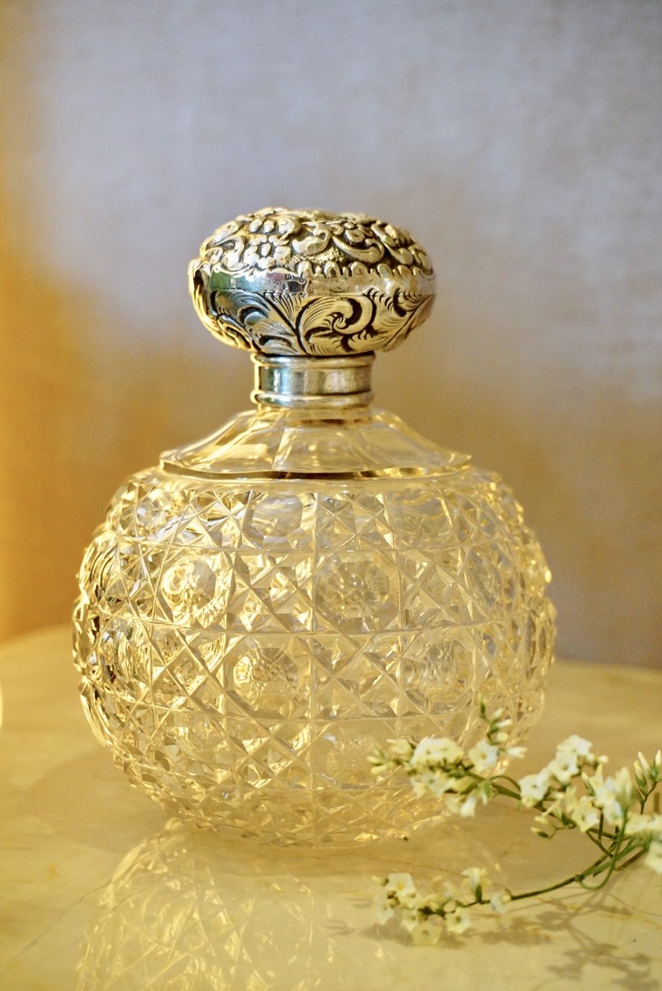 香水瓶,水晶瓶身配纯银瓶盖,盖内垫木块,以防挥发。大瓶根据盖上的纯银戳记显示约制作於1903年英国伯明翰,瓶身手工切割精美,瓶盖雕刻华丽,至今仍具有很强的实用性。小瓶制作时间略晚于大瓶。