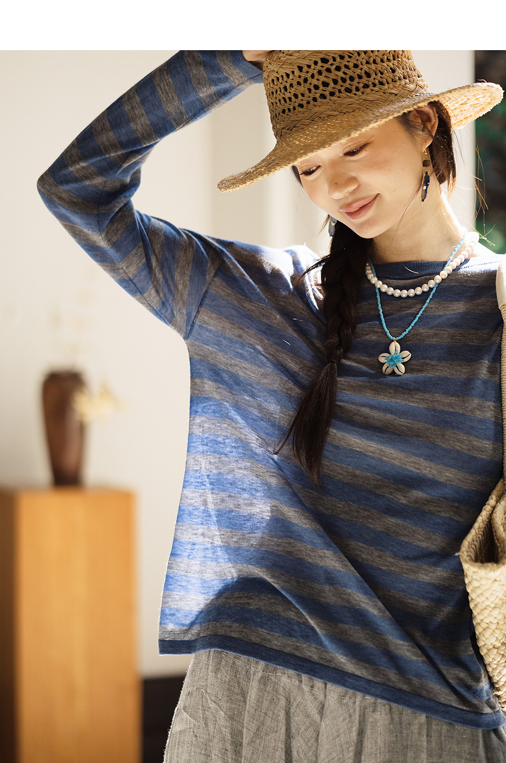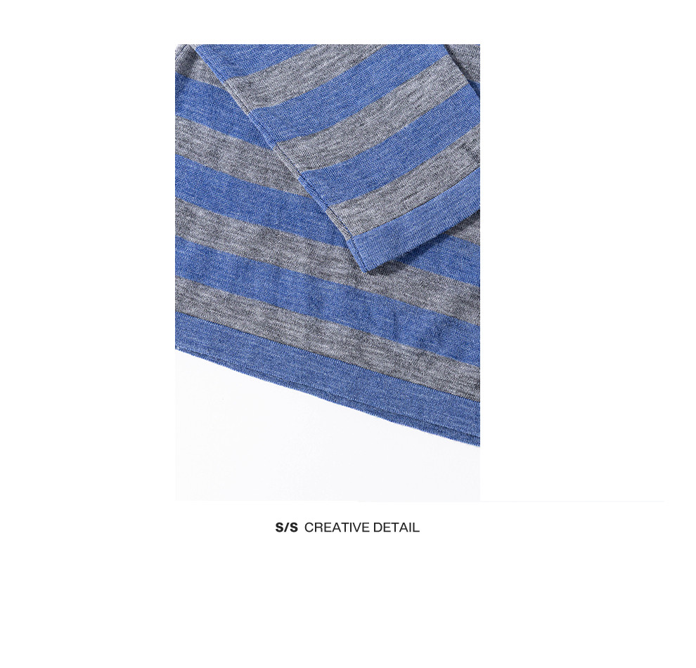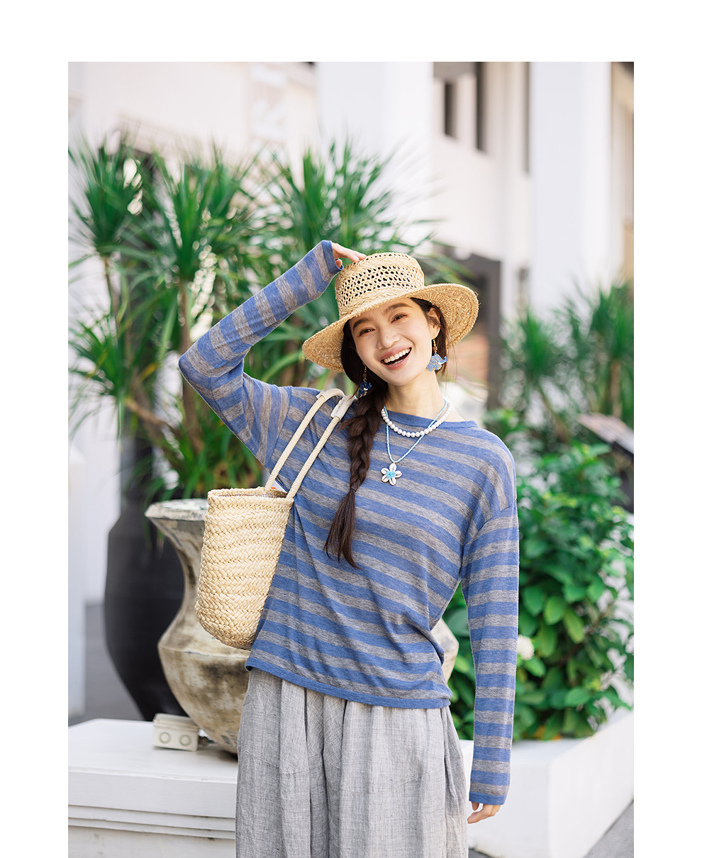 绽放165朵/绵羊毛宽松撞色条纹圆领落肩套头针织衫女外穿长袖T恤
