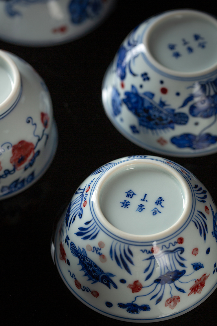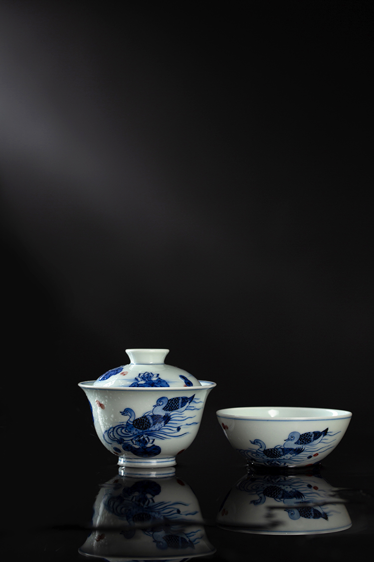 歳合山房俞强款青花釉里红戏荷之鸭二才盖碗