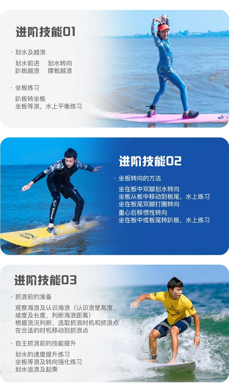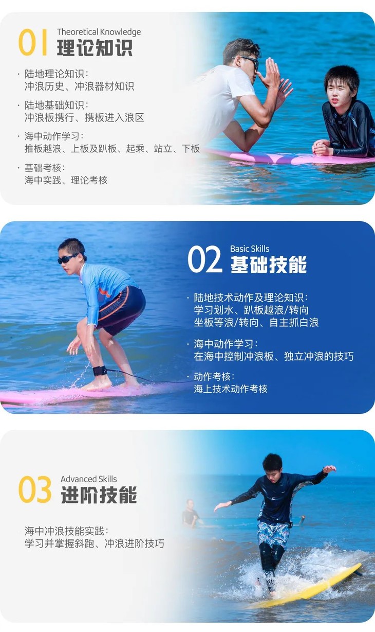 从青铜到王者的进阶式课程,涵盖冲浪装备、冲浪规则、安全知识、动作练习与实践等内容,让营员们可以很快建立信心,玩转浪花。