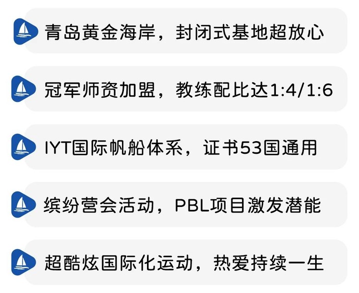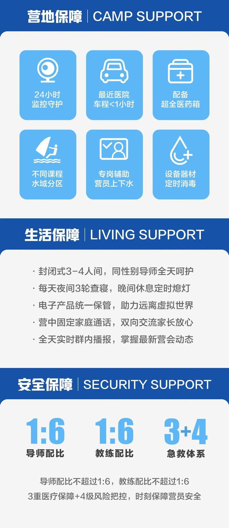 为保证每一位孩子都能得到用心的教学和呵护,我们设置工作人员与学员综合配比不高于1:4,航海教练与学员配比不高于1:6,营地导师与学员配比不高于1:6,保证孩子们高质量的体验。